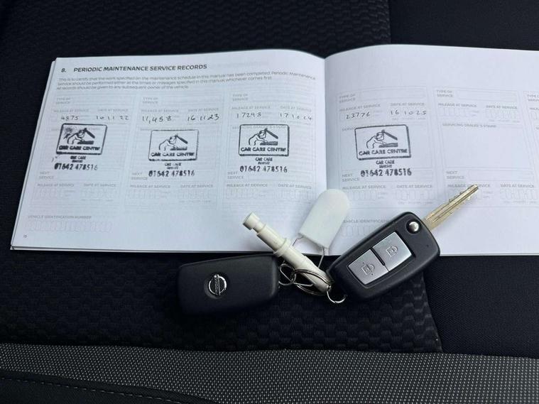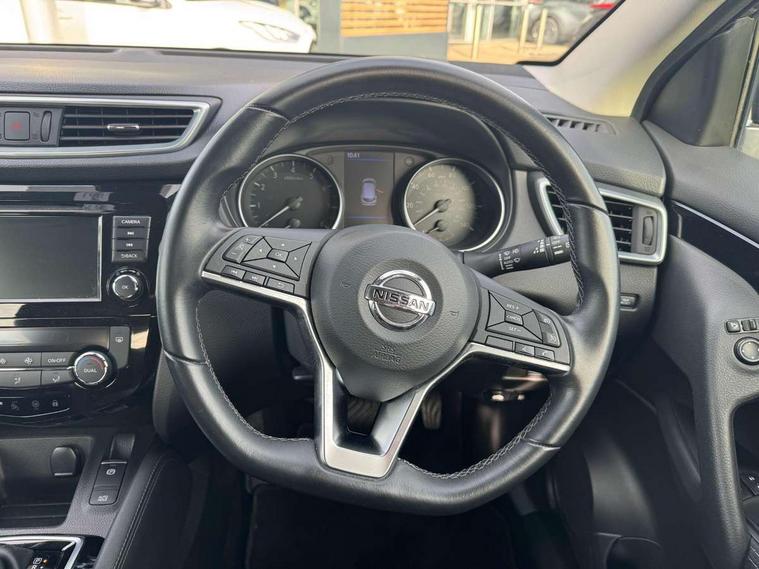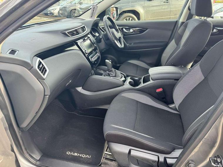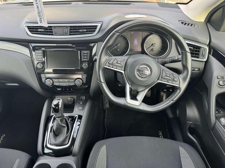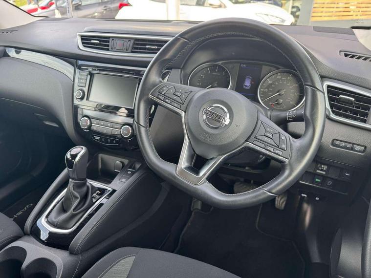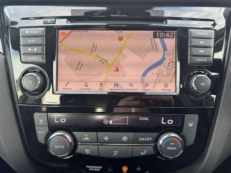 Advanced drive assist display 5'' TFT coloured screen, Apple car play/Android Auto, Bluetooth connectivity, Cruise control + speed limiter, Electric speed sensitive power steering, Front parking sensors, Idle stop/start system, Lane departure warning system, Nissan connect evo 7" touchscreen navigation and entertainment system, Normal or sport selectable steering, Outside temperature sensor, Premium Tomtom connected services, Rear parking sensors, Rear view camera, Service interval indicator, Smartphone integration, Traffic sign recognition, Trip computer, Voice control system, Nissan chassis control (intelligent ride control, intelligent trace control, intelligent engine brake), 6 speakers, AM/FM radio, CD audio system, Aux-in socket, DAB Digital radio, USB port, Anti dazzle rear view mirror, Auto wipers, Body colour bumpers, Body coloured door handles, Body coloured door mirrors, Chrome window surround, Daytime running lights dip function when turn signal applied, Electric folding door mirrors, Electric front and rear windows with one touch illuminated window controls, Electrically adjustable door mirrors, Front fog lights, Halogen headlights, Heated door mirrors, High beam assist, Intelligent auto headlights, LED indicators in door mirrors, Rear roof spoiler, Rear wiper with reverse link, Shark fin antenna, Signature LED daytime running lights, Underbody vortex generators, 2 X front 12v power sockets, 3 height adjustable rear headrests, 60/40 split folding rear seat, Ambient interior lighting, Ambient lighting around centre console, Bi-colour cloth upholstery, Boot lighting, Centre console storage box/armrest, Chrome interior door handles, Driver's seat manual height adjust, Dual zone climate control, Front and rear door pockets with bottle holders, Front and rear seat belt pre-tensioners with load limiters, Height adjustable front headrests, ISOFIX restraints on outer rear seats x2, Leather D shaped steering wheel, Leather gear lever, Leather knee pad, Manual height adjustable passenger seat, Manual lumbar support on driver seat, Pollen filter, Rear armrest with 2 cupholders, Tilt/telescopic adjustable steering wheel, Velour floor mats, 6 airbags - Driver, front passenger, curtain and side airbags, ABS, ESP, EBD and brake assist, Auto hold function, Child locks on rear doors, Electronic parking brake, Front and rear seat belt warning, Height adjustable front seatbelts, Hill start assist, Intelligent emergency braking with pedestrian recognition, Passenger airbag deactivation system, Three 3 point rear seatbelts, Tyre pressure monitoring system, Anti-theft immobiliser, Remote central locking, Thatcham Cat.1 alarm, Piano black dash trim, 17" alloy wheels, Tyre puncture repair kit,