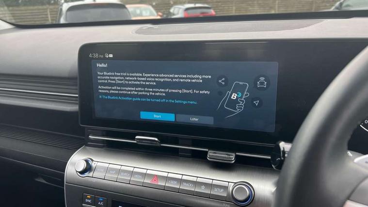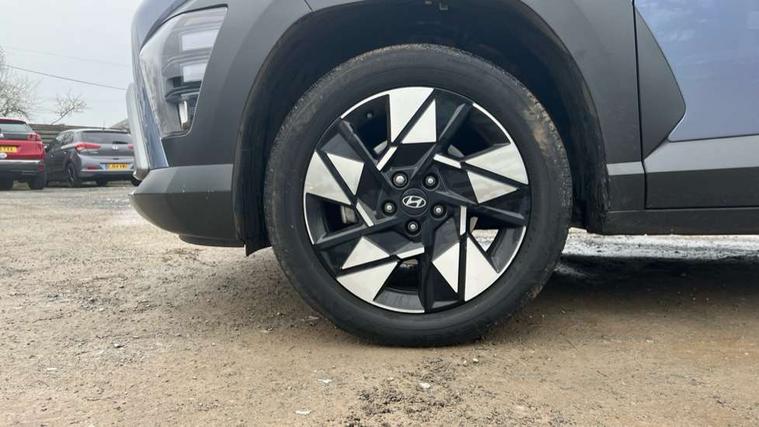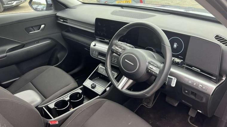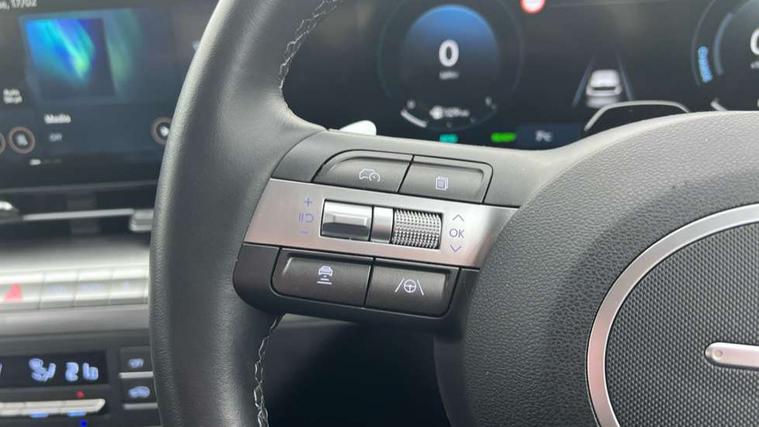 12.25" digital instrument cluster, 12.3" touchscreen centre console display satellite navigation with bluelink, live services and mapcare, Bluetooth connectivity with voice recognition, Driver status monitor (DSM), Driver supervision instrument cluster with 12.3" LCD display, eCall emergency call system, Feature on demand - Enabled, Forward collision avoidance assist (FCA 1.5) - Car, pededstrian, cycle and junction turning, Front parking sensor, HDA - Highway Drive Assist Level 1.5, Intelligent speed limit assist, Lane follow assist, Lane keep assist, Leading vehicle departure alert (LVDA), Parking system with rear camera and guidance system, PAS, Rear parking sensor, Rear view camera with dynamic guidelines, Roadside assistance, Smart cruise control with stop and go functionality, Wireless Smartphone Integration includes Apple CarPlay and Android auto, 2 front USB C and 2 rear USB C charging points, DAB Digital radio, Speakers - Front, rear and tweeters, Steering wheel audio, phone and cruise controls, Auto dimming rear view mirror, Automatic headlights with dusk sensor, Automatic windscreen wipers with rain sensor, Black painted wheel arch inserts, Body colour exterior door handles, Body coloured door mirrors, Door mirror LED indicator lights, Electric front windows with anti-trap mechanism and one touch control, Electric rear windows, Electrically adjustable and heated door mirrors, Full LED MFR headlights, LED daytime running lights, LED taillights, LED upper and lower rear lights, Power folding door mirrors, Rear roof spoiler with integrated LED brake light, Rear side wing doors, Rear skid plate - silver, Rear wiper, Roof rails, Tinted glass in front and rear doors, Windscreen auto defog function, 12V power outlet in front console, 2 zone climate control, 3 seat bench in 2nd row, Adjustable head restraints, Cloth upholstery, Driver and passenger front seat pockets, Driver's seat lumbar support, Driver/passenger manual seat height adjustment, Driver/passenger sunvisors and illuminated vanity mirrors, Floor mats, Height/reach adjustable steering column, Leather steering wheel, LED centre interior light, LED front interior light, Luggage compartment LED lighting, Luggage shelf, Metal paint effect interior door handles, Rear centre armrest with cupholders, Shift by wire SBW, Single front passenger seat, Vertical adjustment rear head restraints, Trailer wiring package - Kona, Airbag - front, front side, curtain and centre front airbag, Anti-lock brake system (ABS), Childproof rear door locks, Downhill brake control, Electric parking brake, Electronic stability control, Fixed 3 point for second row centre passenger seatbelt, Hill start assist control (HAC), Rear seat alert, Tyre pressure monitoring system, Alarm/immobiliser, Rear occupant alert, Remote central locking, Smart key with keyless entry and start/stop button, Five year annual vehicle health checks, 18" Alloy wheels, Temporary mobility kit (TMK),