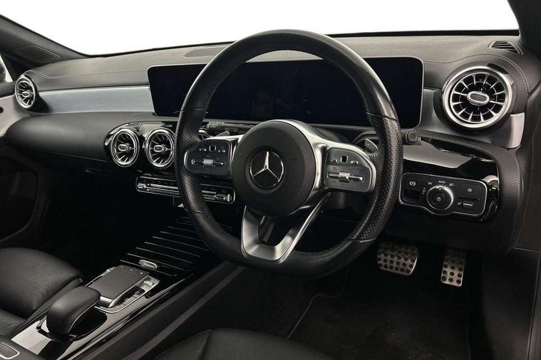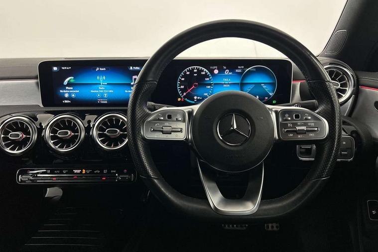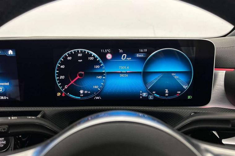 10.25 inch Instrument display with digital cockpit, 10.25 inch touchscreen central media display, Active lane keeping assist, Attention assist - Monitors steering behaviour and long journey fatigue, Cruise control with limiter, Direct steer system with speed sensitive power steering, Dual bluetooth interfaces, DYNAMIC SELECT with a choice of driving modes (ECO, Comfort, Sport, Sport+ and Individual), Easy-pack tailgate, ECO start/stop function, Fluid level warning indicator for fuel, oil, coolant and washer fluid, Hard-disk navigation, Hey Mercedes Voice activation, Lamp failure indicator, MBUX augmented reality for navigation, Mercedes me connect including emergency call system, accident recovery, breakdown and maintenance management, Outside temperature gauge, Owners manual and service booklet in English, Pre-installation of private car share, Preinstallation for Mercedes Benz link, Radio aerial integrated into front and rear windshields, Service indicator (ASSYST), Smartphone integration with Apple CarPlay and Android auto, Speed limit assist, Trip computer in multifunction display with current consumption indicator, Wireless charging, 7G-DCT 7 speed automatic transmission, Lowered comfort suspension, Rear axle multi-link, Sporty engine sound system, DAB digital radio tuner, MBUX multimedia system with DAB digital radio and touchpad including satellite navigation, Mercedes Benz advanced sound system (225 W) with 10 speakers, 1 central speaker, speakers on doors, a tweeter on door, one sub woofer + boost amplifier, USB (type C) ports (2) in stowage compartment and 1 in front of centre console, Adaptive brake lights, AMG body styling with AMG front apron and rear apron and visible exhaust tailpipe trim elements, AMG bodystyling side skirts, Beltline strips and weather strip in chrome, Body colour bumpers, Body colour door handles with chrome inserts, Diamond radiator grille pins in chrome with silver painted louvres and chrome insert, Electric windows, Electrically adjustable and heated door mirrors with integrated LED indicators, Exhaust system with 2 Visible tailpipe trim elements and rear apron with trim in chrome, Headlamp assist automatic headlamp activation, Heated glass rear windscreen + timer control, High level LED third brake light, LED high performance headlamps with integrated LED daytime running lights, LED tail lamp, Privacy glass with dark tinting on rear side windows and rear window, Rain sensing windscreen wipers with two sensitivity settings, Rear fog lamp, Vehicle Monitoring, Vehicle Setup, 3 spoke flattened bottom nappa leather multifunction steering wheel with perforated leather in grip area, 40:20:40 split folding rear seat backrests, Air conditioning - Two zone thermotronic luxury automatic climate control with display, Air vents with surround in silver chrome, Automatic child seat recognition sensor, Black roof lining, Brushed stainless steel sports pedals with rubber studs, Floor mats with stitched AMG lettering, Front centre armrest with stowage, Front seat cushion length adjustment, Galvanished gear shift paddles on steering wheel, Heated front seats, Illuminated glove compartment stowage, Illuminated Mercedes benz door sills with Mercedes Benz lettering, Interior lighting - 64 colour Ambient lighting, Luggage net on driver/front passenger seat backrest, Manually adjustable front seats, Manually height and reach adjustable steering column, Rear armrest with two integral cup holders for drinks, Rear head restraints, Rear interior lamp, Spectacles compartment for driver, Sport seats with fixed head restraints, Stowage compartment in centre console with retractable cover, Sunvisors with illuminated vanity mirrors, Touchpad on center console, Twin front cupholders, Two outer rear seat isofix and top tether child seat fixing points, Keyless go pack - CLA, Light and sight pack - CLA, Mirror pack - CLA, Parking package - CLA, Seat comfort pack - CLA, Active bonnet pedestrain safety measure which detects an impact and raises bonnet by 65mm, Active brake assist includes forward collision warning system with autonomous braking, Adaptive brake assist with hold function and hill start assist, Anti-lock braking system (ABS), Black seat belts, Bonnet with power domes, Brake pad wear warning indicator, Childproof locks manually operated for rear doors and electrically operated for rear power windows, Crash responsive emergency lighting, Driver and front passenger head and sidebags, Driver and front passenger windowbags, Drivers knee airbag, Dual stage driver and front passenger airbags, Electric parking brake, Electronic stability programme with acceleration skid control, ESP curve dynamic assist, Front and rear seatbelt reminder, Front brake callipers with Mercedes Benz lettering, Front passenger seat occupancy sensor, Perforated front brake discs, Three point rear seat belts, Tyre pressure monitoring system, Warning triangle and first aid kit, Alarm system with immobiliser and interior protection -Thatcham category 1, Remote central locking and crash sensor with emergency opening function, Light aluminium with longitudinal grain interior trim, 18" 5 twin spoke design alloy wheels painted in titanium grey with high sheen finish, Summer tyres, Tirefit tyre sealant kit,