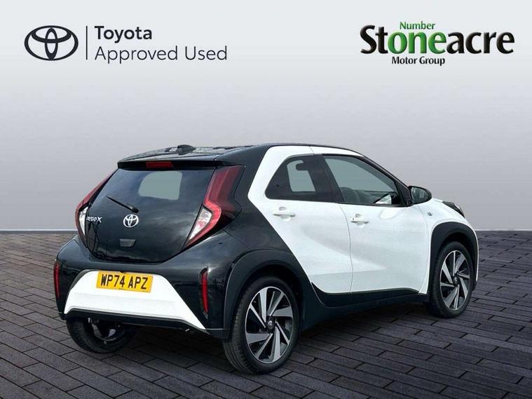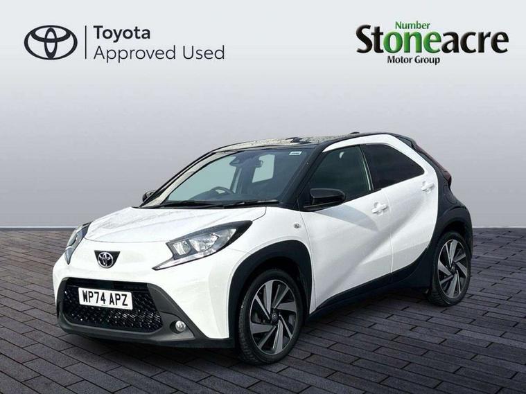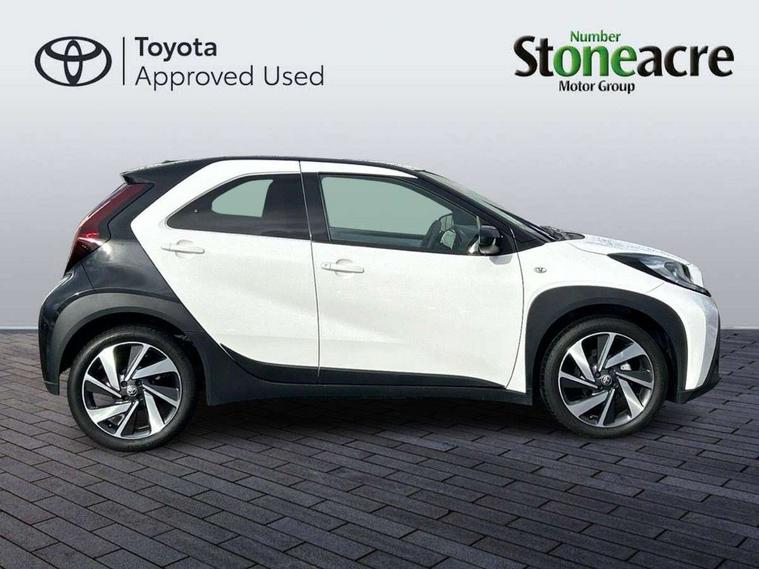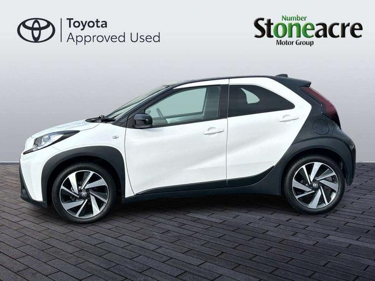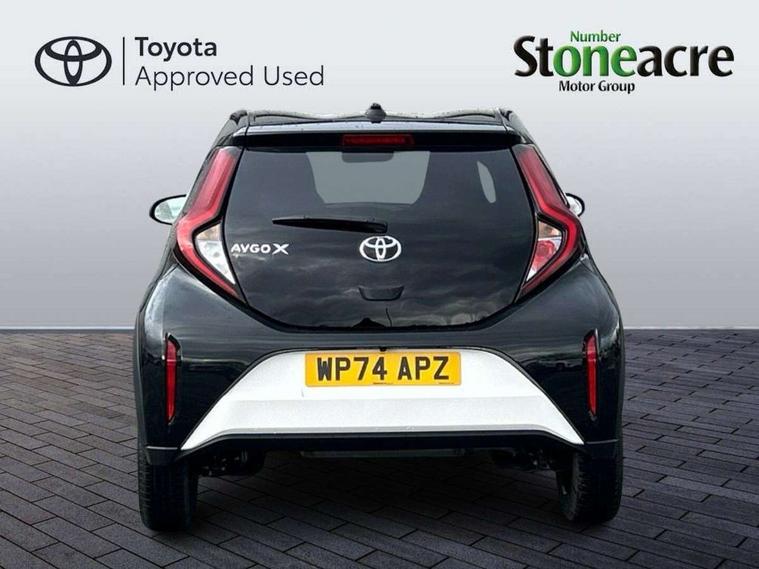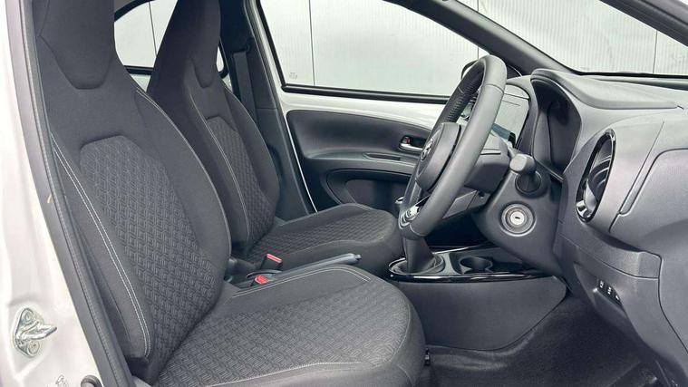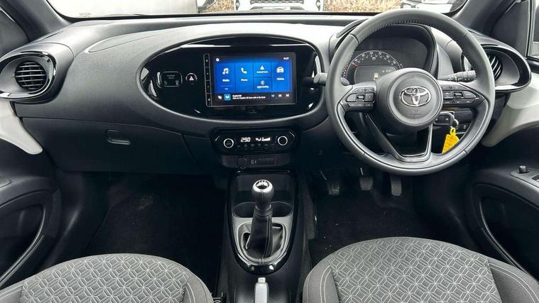 4.2" TFT colour screen, Adjustable speed limiter, Analogue speedometer, Bluetooth connectivity, Digital tachograph, Driver attention alert system, eCall emergency call system, Electric power steering, Intersection turn assist, Key reminder warning, Noise reduction kit, Pre collision system with emergency steering assist, Reversing camera with static guide lines, Smart phone integration with Apple car play/Android Auto, Speed limit display, Start and stop, Vehicle Stability Control (VSC), 4 speakers, 9" HD multimedia display touch screen with Toyota smart connect, DAB digital audio broadcast, USB connector, Auto headlights, Auto wipers, Automatic headlights cut-off, Bicycle towing hook, Black contrast roof, Black side protection mouldings, Black wheel arch mouldings, Body colour door handles, Body coloured front bumper, Boot door scuff plate, Eclipse black rear bumper, Electric heated door mirrors, Follow me home headlights, Front fog lights, Front power windows, Gloss black door mirrors, Gloss black upper front grille, Headlight cut-off reminder, LED daytime running lights, LED front light guide, LED High mounted stop lamp, Manual day/night rear view mirror, Manual headlight levelling, Pagoda roof, Power adjustable door mirrors, Power back door, Privacy glass, Projector halogen headlights, Rain sensor, Rear combination lights LED bulb type, Rear side wing doors, Rear windscreen defogger, Rear windscreen wiper, Short antenna, Variable intermittent windscreen wipers, 12v power outlet - front, 2 seat bench in 2nd row, 3 spoke leather steering wheel, 50/50 split folding rear seat, Adhesive roof headlining, Adjustable speed limiter switch on steering wheel, Audio and telephone switches on steering wheel, Auto air conditioning, Black insert on steering wheel, Black roof lining, Boot light, Centre room light, Chrome interior door handles, Chrome surround on air conditioning buttons, Clean air filter, Console box storage in body color, Fabric upholstery, Floor mats, Front and rear cup holders, Front head rest deco art, Front head restraints, Height adjustable driver seat, Intelligent adaptive cruise control switch on steering wheel, ISOFIX child restraint system on rear seats, Lane departure alert switch on steering wheel, Leather gearshift knob, Manual tilt steering wheel, Manually reclining and sliding driver seat, Manually reclining and sliding front passenger seat, Multimedia switches on steering wheel, Pollen filter, Rear door pockets, Rear head restraints, Satin silver insert on gear shift knob, Single compartment glovebox with lights, Single front passenger seat, Soft tonneau cover, Sun visors with mirror on driver and passenger side, Voice recognition switch on steering wheel, Toyota safety sense pack - Aygo X, Anti lock braking system + Electronic brake force distribution, Child safety door lock, Emergency brake light signal (EBS), Hill start assist control (HAC), Passenger airbag on/off switch, Seat belt reminder for front and rear seats, Supplement restraints system (SRS) - 6 airbags, Traction control, Tyre pressure warning system, Immobiliser, Remote power door locks, Black wheel centre caps, Tyre repair kit,