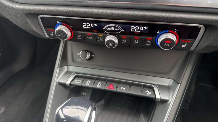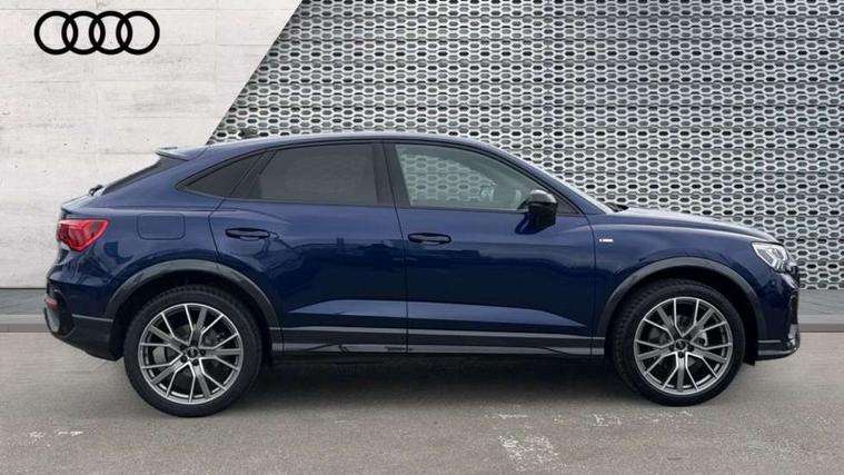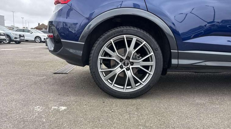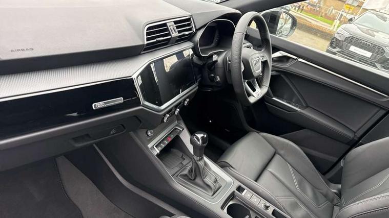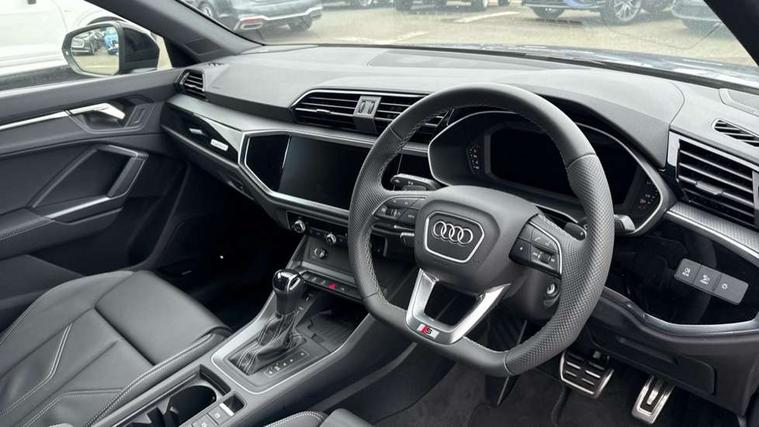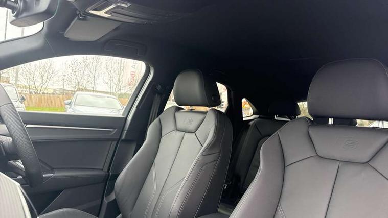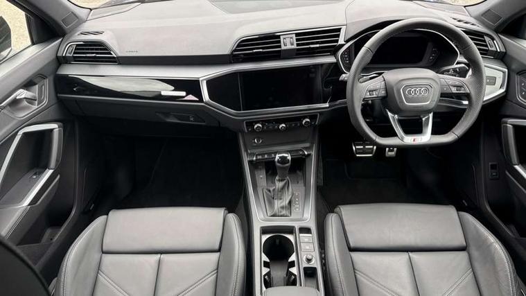 360 degree view camera, Audi connect safety and service, Audi drive select, Audi lane departure warning, Audi Virtual Cockpit - 10.25" display, Bluetooth interface, Camera based traffic sign recognition, Distraction and Fatigue warning, Legal emergency call, MMI Navigation Plus with high resolution 10.1 inch touchscreen colour display, Phonebox light with wireless charging, Power operated tailgate, Progressive steering, Service interval indicator, Smartphone interface includes wireless Apple carplay/Android Auto, Start stop system with recuperation, Voice control system with natural language interaction, Sports suspension, 2 USB-C ports with charge and data functions, DAB digital radio module, SONOS premium sound system, Acoustic windscreen, Audi Beam uses LEDs to project the Audi logo onto the ground as you exit your Q3, Auto dimming door mirrors, Auto dimming frameless rear view mirror, Electrically folding, adjustable and heated door mirrors with integrated LED side indicators and kerb view function for passenger side, Front and rear electric windows, Front fog lights, Front underbody protection in manhattan grey paint finish, High gloss black finish B and C pillars, Honeycomb design radiator grille in matt anthracite black, LED Dynamic rear indicators, LED rear lights, LED third brake light, Matrix LED headlights with LED daytime running lights, Panoramic glass sunroof, Privacy glass dark tinted rear and rear-side windows (from B-pillar backwards), Rain and light sensors, Rear diffuser grille in grained matt black, Rear diffuser strip in matt anthracite black, Rear side wing doors, Rear underbody protection in matt black, Rear wiper, S line front and rear bumpers and side skirts in contrasting Manhattan grey paint finish, Variable front intermittent wipers, 12V socket in rear centre console, 3 seat bench in 2nd row, 40:20:40 folding with manual adjustment for 60:40 forwards/backwards position and backrest angle, Adjustable rear seat bench/backrest with centre armrest and cupholder, Black carpet mats, Black cloth headlining, Dual zone electronic climate control, Electric lumbar support, Electrically adjustable front seats, Front and rear black floor mats with contrast stitching in rock grey, Front and rear headrests, Front centre armrest, Heated front seats, Height and reach adjustable steering wheel, Illuminated door sill trims with S logo, ISOFIX child seat mounting for front passenger with airbag deactivation and outer rear seat including top tether attachment point for outer rear seats, Luggage compartment sill protection in stainless steel, Perforated leather gearknob, Single front passenger seat, Stainless steel pedals, Twin leather upholstery with front sport seats + S embossing, Black styling pack - Q3, Non smoking pack - Q3, 3x3 point rear seatbelts, 6 airbags - Driver, front passenger, curtain and side windows, Audi pre-sense front with pedestrain and cyclist recognition, Electrically operated child locks on rear doors, Electromechanical parking brake, Electronic stabilisation control including ABS, ASR and EDL, Front seatbelt reminder, Hill descent control, Hill hold assist, Pre sense basic, Seatbelt monitoring, Tyre pressure warning, Warning triangle and first aid kit, Advanced key, Anti theft wheel bolts, Immobiliser, Remote central locking, Thatcham approved category 1 anti theft alarm, Aluminium look interior elements, Detail dashboard around MMI touch colour display in glass look, black with surround in aluminium look, Leatherette door armrest, Piano black inlay,