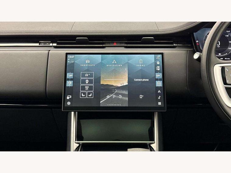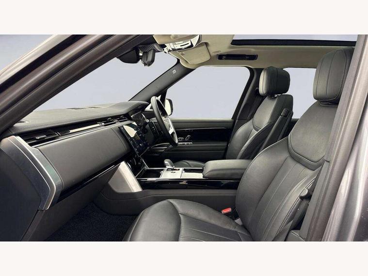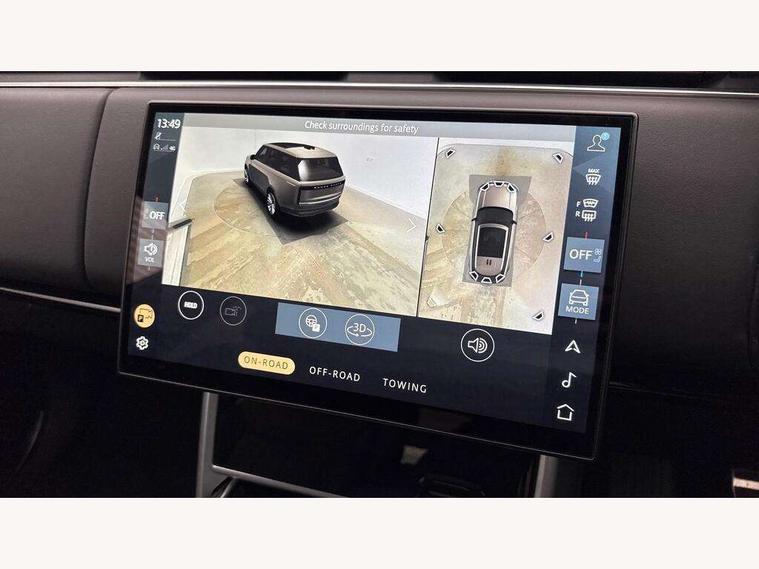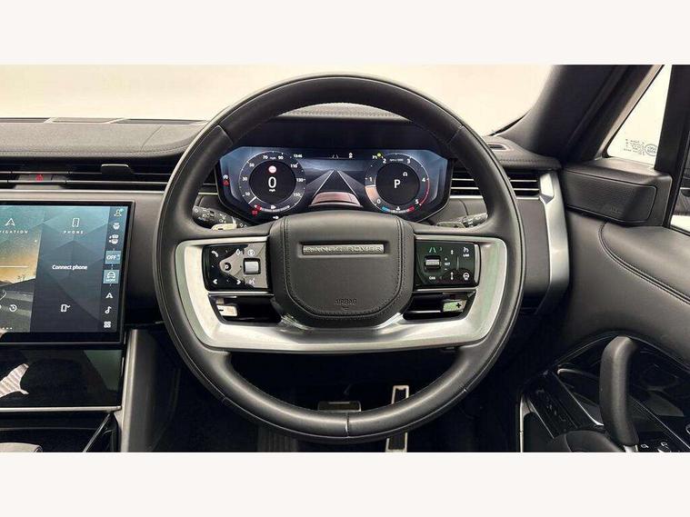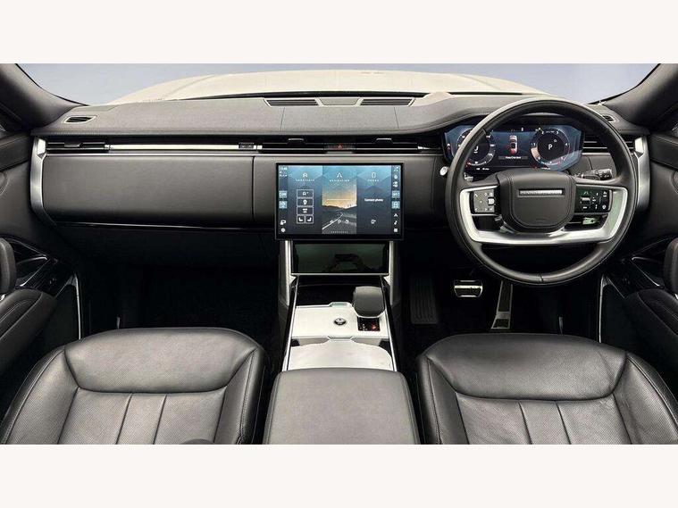 13.1" Touchscreen, 3D surround camera inc frwd traffic detection, vehicle clearance guidance, 3D view, clearsight ground view, manoevure light, 360 parking aid, wade sensing, All Terrain Info Centre, All wheel steering, Android Auto, Apple car play, Blind spot assist, Bluetooth connectivity streaming, Driver condition response, Eco mode, Electric power assisted steering (EPAS), Emergency call service, Front and rear parking aid, Head up Display, Interactive driver display, Lane keep assist, Rear collision monitor, Rear traffic monitor, Remote, Traffic sign recognition with adaptive speed limiter, Wi-Fi Enabled with data plan, Wireless device charging with phone signal booster, 8 speed automatic transmission, Active damper technology system, Adaptive dynamics, All terrain progress control, All Wheel Drive (AWD), Automatic access height, Terrain Response 2 Auto, Twin speed transfer box, Digital Audio Broadcast radio-DAB, Pivi pro including smart settings, Connected navigation pro, nuance speech, USB socket, Acoustic laminated windscreen, Animated directional indicators, Automatic headlights, Automatic levelling headlights, Centre high mounted stop light, ClearSight interior rear view mirror, Electric windows with one touch open/close and anti trap, Engine cover, Flush deployable exterior door handles, Front and rear recovery eyes, Front fog lights, Headlamp power wash, Heated rear window, Heated washer jets, LED tail lights, No badges, Power fold, auto-dimming, heated door mirrors with approach lights, Rain sensing windscreen wipers, Rear boot, Rear fog lights, Rear side wing doors, Side repeater indicators in mirror, Trailer stability assist, Winter wiper park position, 12V power sockets, 3 seat bench in 2nd row, Air quality sensor, Bright metal pedals, Cabin air purification pro, Cabin lighting, Customer configurable single point entry, Driver and passenger front seat armrests, Easy boot loading, Ebony Carpet, Front and rear cupholders, Front and rear grab handles, Front head restraints, Gearshift paddles, Heated steering wheel, Hook in load space, Loadspace light, Luggage tie down in loadspace, Multifunction steering wheel, Rear centre armrest, Rear head restraints, Rear ISOFIX, Single front passenger seat, Soft close doors, Twin blade sunvisors with Illuminated vanity mirrors, Upper and lower glovebox, Online pack with data plan - Range Rover, 3x3 point rear seat belts, Anti-lock braking system (ABS), Brake hold function, Cornering brake control (CBC), Customer configurable autolock, DSC - Dynamic Stability Control, Electronic brake force distribution, Electronic parking brake, Electronic traction control, Emergency brake assist, Emergency braking, Front airbags with passenger seat occupant detector, Front side airbags, Hill descent control, Hill launch assist, Illuminated seat belt buckles, Low traction launch, Occupant protection assist, Power operated child locks, Roll stability control, Tyre pressure monitoring system (TPMS), Immobiliser, Intrusion sensor and alarm, Keyless entry, Locking wheel nuts, Remote central locking, Noble chrome controls,