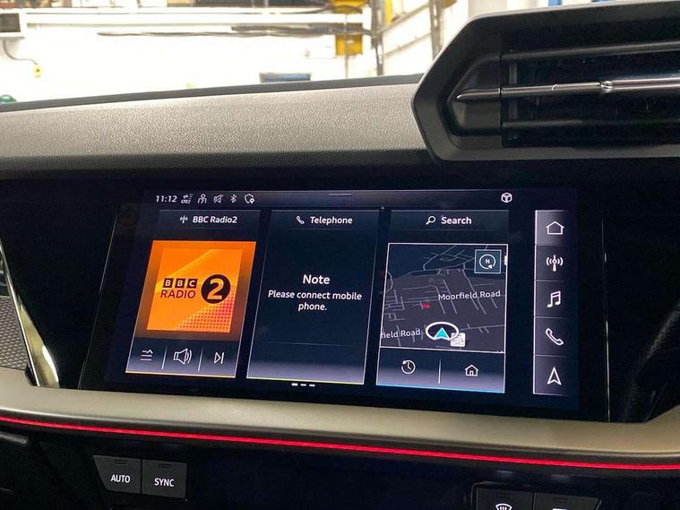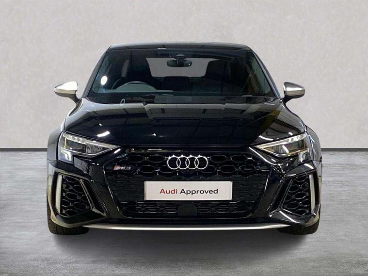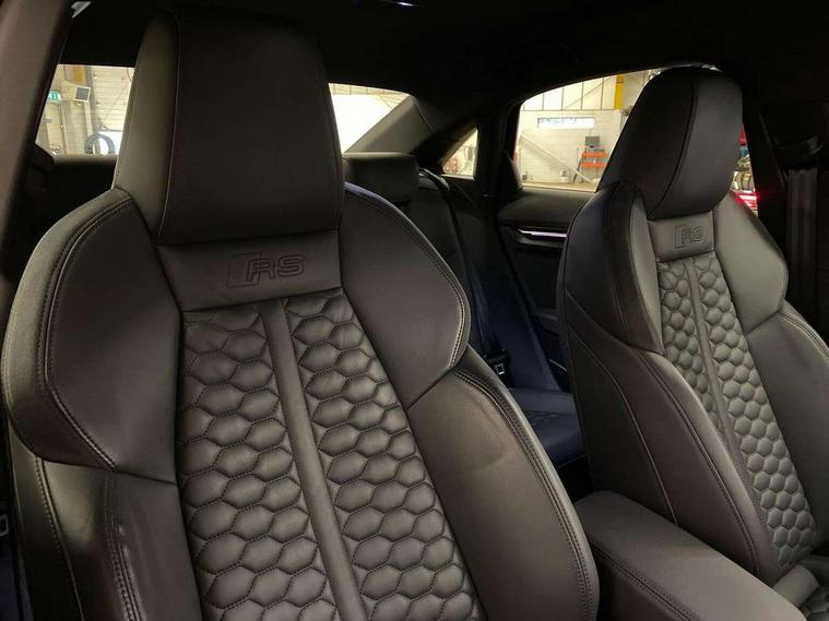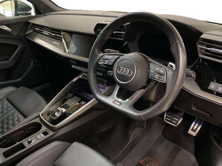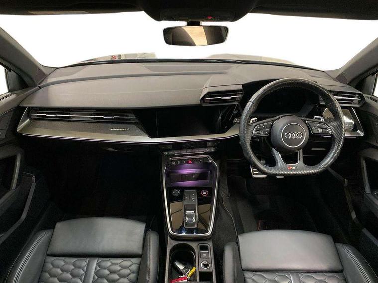 Audi smartphone interface, Audi virtual cockpit with RS specific display 12.3" full colour digital instrument cluster, Automatic start/stop system with recuperation, Bluetooth interface, Collision avoidance assistant, Emergency e-call, Lane departure warning system, Legal emergency call, Manual boot opening, Parking assist with parking system plus, Progressive power assisted steering, Quattro permanent four wheel drive, Rear suspension, Audi sound system impressive sound with 10 loudspeakers including centre speaker and subwoofer, 6-channel amplifier with a total output of 180 watts, DAB Digital radio, 3rd brake light, Acoustic glass windscreen, Audi beam uses LEDs to project the Audi sport logo onto the ground as you exit your RS 3, Auto dimming rear view mirror, Black side skirts, Body colour roof, Door mirrors - electrically adjustable, heated, folding and auto dimming on both sides, Headlight washers, LED daytime running lights, LED headlights with LED rear lights + dynamic rear indicators, Light and rain sensors, Matt aluminium door mirrors, Matt aluminium window trims, Privacy glass - dark tinted rear and rear side windows from B-pillar backwards, Rear boot, Rear side wing doors, 3 seat bench in 2nd row, 40/20/40 split folding rear seat bench, Black cloth headlining, Dual zone electronic climate control, Front and rear headrests, Front centre armrest, Front sports seats RS embossed logo, Front/rear floor mats, Heated front seats, Honeycomb stitching and RS embossing, Illuminated door sill trims inlays in aluminium with RS 3 logo, Manually adjustable front seats, RS emblems, Single front passenger seat, Stainless steel pedals and front footrest in black, Tool kit, Aluminium interior elements pack - RS3, Ambient lighting pack - RS3, MMI navigation plus with MMI touch - RS3, RS bodystyling - RS3, Storage Pack - RS3, 3x3 point rear seat belts, ABS/EBD, ASR, Audi pre sense front, Driver/Front Passenger airbags, EDL, ESC - Electronic Stability Control + traction control, Front passenger airbag deactivation, Front side airbags with head airbags and interaction airbag, Hill hold assist, Seat belt reminder with passenger presence detection in rear, Tyre pressure loss indicator, Warning triangle and first aid kit, Anti theft alarm, Anti-theft wheel bolts, Electronically operated child lock, Remote control central locking, Carbon inlays, accent surfaces in the dashboard and centre console in platinum grey silk effect paint finish, 19" 10 Y spoke platinum grey, gloss turned finish alloy wheels, Tyre repair kit,