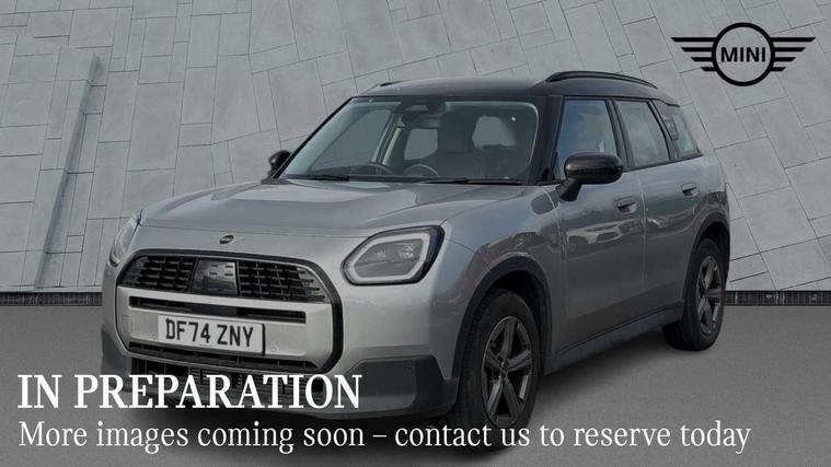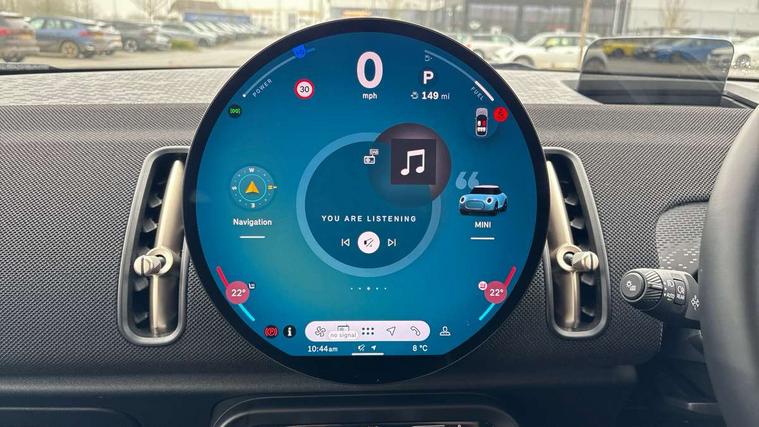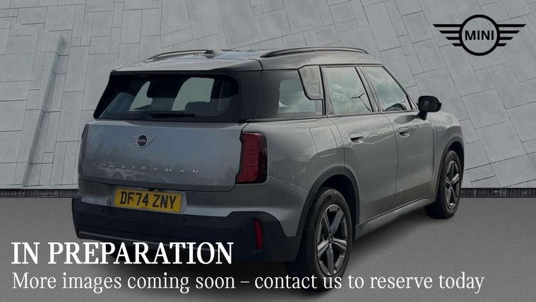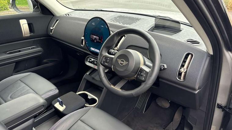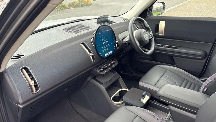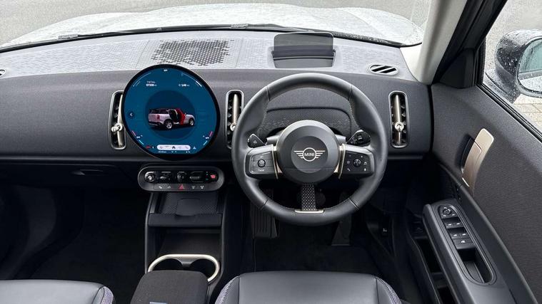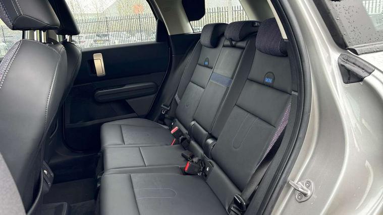 Bluetooth connection, Circular OLED Screen, Compatible mobile phone bluetooth with audio streaming, Cruise Control (DCC), Digital dashboard display, Driving assistant, E-call, Electro-mechanical speed dependant steering assistance, MINI Experience Modes, Mini navigation system, MINI TeleServices, Parking assistant in camera and ultrasound based assistance system, rear view camera, parking aid and distance control, Auto transmission with Paddles, Larger capacity fuel tank, 6 speakers, DAB Digital radio, Personal eSim, Auto tailgate, Electric adjustable heated door mirrors, Front and rear electric windows, Heated rear window, LED daytime running lights, LED Headlights, LED rear lights, LED third brake light, Rain sensor with auto headlights, Rear side wing doors, Rear window wiper, Roof rails, 3 seat bench in 2nd row, 60/40 split rear bench seat, Auto air conditioning, Floor mats, Front armrest, Front headrests, Heated steering wheel, Height and length steering column adjustment, Light headliner, Rear headrests, Single front passenger seat, Sport Vescin Steering Wheel, Sunvisors with vanity mirrors, Vescin/Cloth upholstery, 3x3 point rear seat belts, 6 Airbags - front, side, head and seat belt tensioners, ABS, DSC - Dynamic Stability Control, Electronic handbrake, Electronic Stability Programme (ESP), Front ISOFIX (iSize), Hill hold assist, Hill start assist, Manual rear child locks, Traction control, Tyre pressure monitoring system, Warning triangle, Alarm system with tilt sensor, monitoring doors, bonnet interior and tailgate, Auto drive away locking, Deadlocking function, Electronic vehicle immobiliser, Locking wheel bolts, Remote control locking, Start/stop toggle with keyless go, Black/Blue dashboard knit, MINI Mobility Kit,