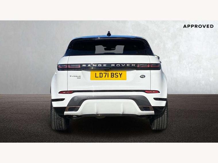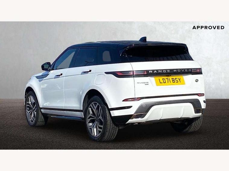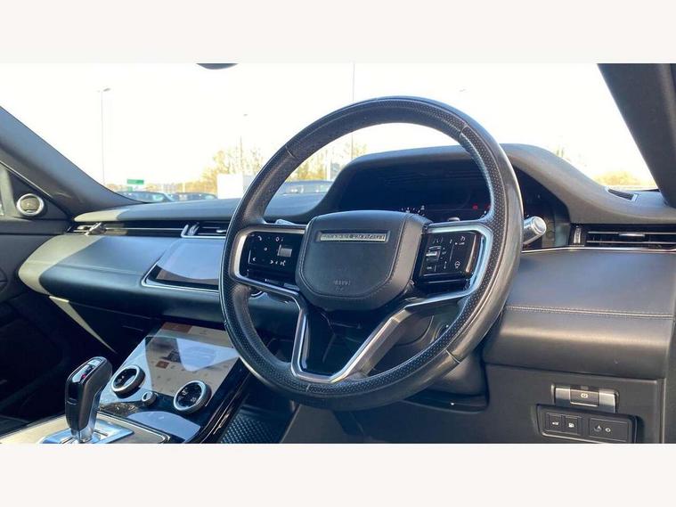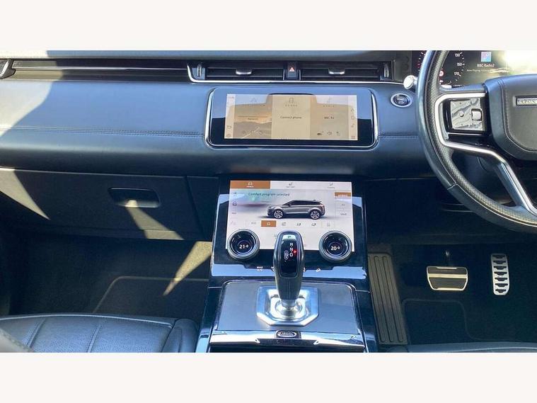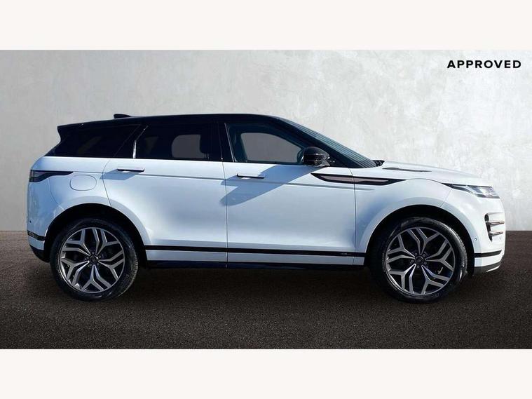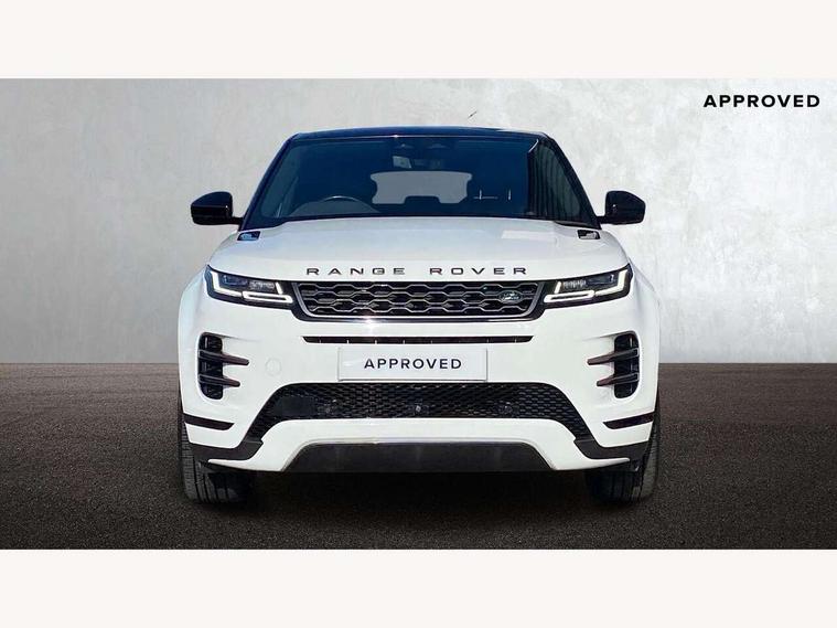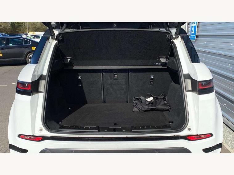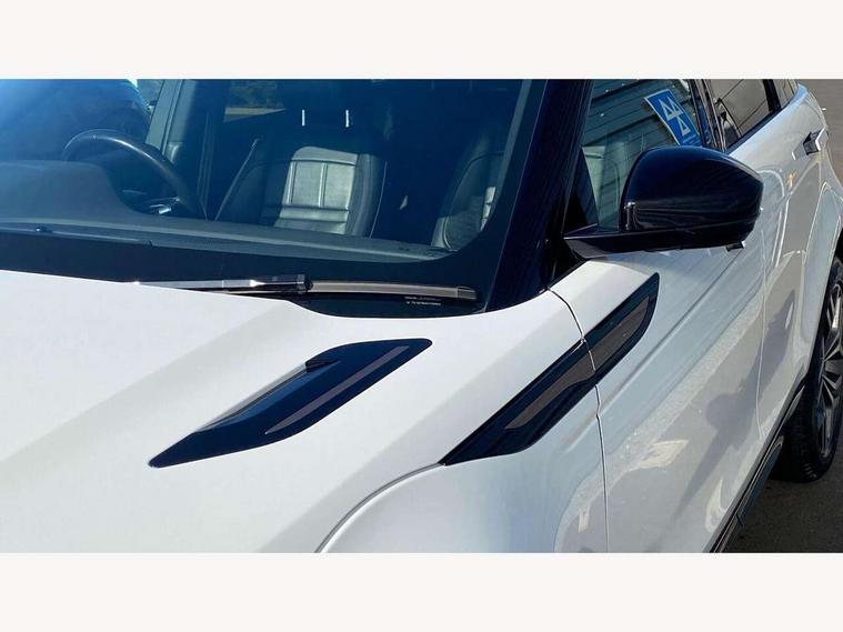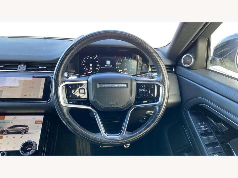 10" deployable touchscreen with lower touchscreen, Adaptive cruise control, Android Auto, Apple car play, Blind spot assist, Bluetooth connectivity, Brake pad wear indicator warning light, Clear exit monitor, Driver condition monitor, Electronic power assisted steering (EPAS), Front and rear parking aid, InControl remote, Interactive Driver display instrument cluster, Land Rover InControl apps, Lane keep assist, Pivi pro connected includes upgraded infotainment, connected navigation pro, Nuance speech licence, Push button starter, Rear collision monitor, Rear traffic monitor, Traffic sign recognition with adaptive speed limiter, Voice control system, 7 kW onboard charger, All terrain progress control, Configurable dynamics, Electric rear axle drive, Large fuel tank, Passive suspension, Public charging cable, Terrain Response 2 Auto, Digital Audio Broadcast radio-DAB, Steering wheel mounted controls, Automatic headlight levelling, Electric windows with one touch open/close and anti trap, Evoque and R-Dynamic badge, Flush deployable exterior door handles, Heated rear window with timer, Heated washer jets, Heated windscreen, Matrix LED headlights with signature DRL, intelligent high beam assist, signature Hi-Line tail lights and animated directional indicators, P300e badge, Power fold, auto-dimming, heated door mirrors with approach lights and auto dimming driver side, Rain sensing windscreen wipers, Rear fog lights, Tailgate spoiler, 40:20:40 split folding rear seats with centre headrest and armrest, Ambient interior lighting, Bright metal pedals, Heated steering wheel, Isofix system on outer rear seats, Overhead lighting console, Overhead stowage for sunglasses, Passive front head restraints, Perforated full leather steering wheel, Rear air vents, Rear centre headrest, Satin chrome gearshift paddles, Sunvisors with illuminated vanity mirrors, Twin sliding front centre armrest, 3 rear 3 point seatbelts, Anti-lock braking system (ABS), Customer configurable autolock, DSC - Dynamic Stability Control, Electronic brake force distribution, Electronic parking brake, Electronic traction control, Emergency braking, Front and rear seatbelt reminder, Hill descent control, Hill launch assist, Low traction launch, Power operated child locks, Roll stability control, Six airbags - Driver and passenger airbags/driver knee airbag/front side airbag and curtain airbags, Torque vectoring brake, Tyre pressure monitoring system, Alarm, Immobiliser, Intrusion sensor, Keyless entry, Locking wheel nuts,