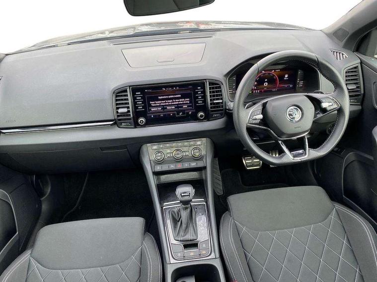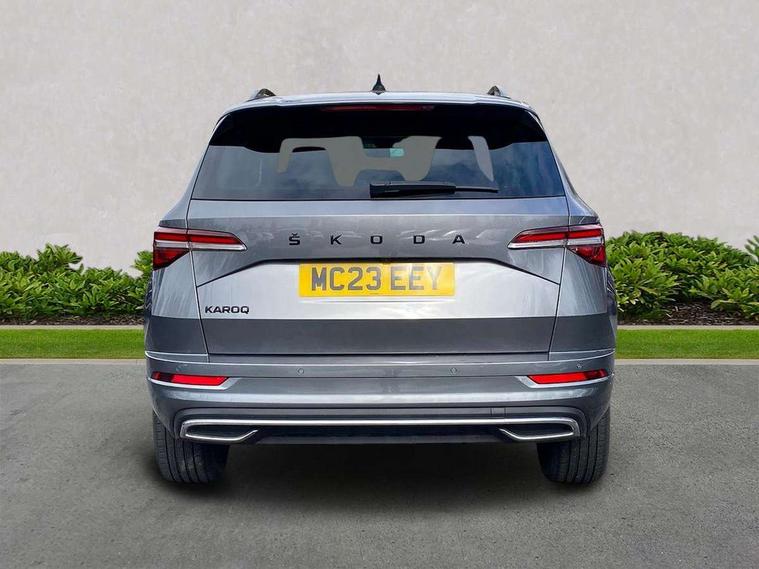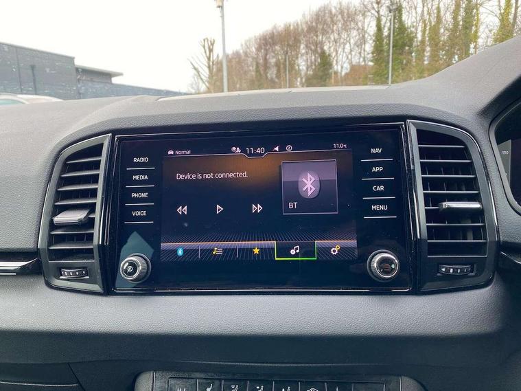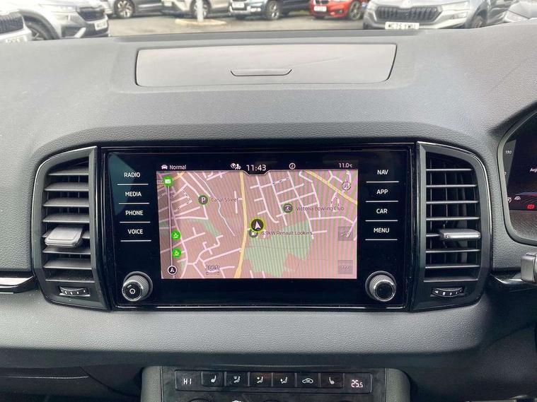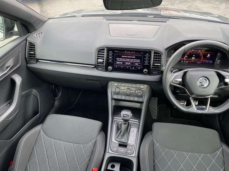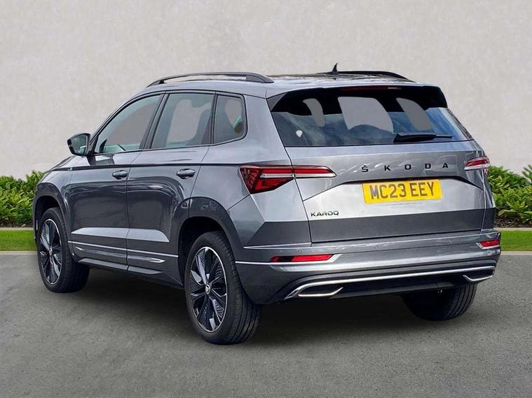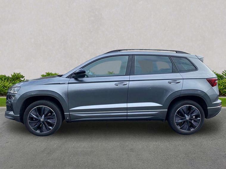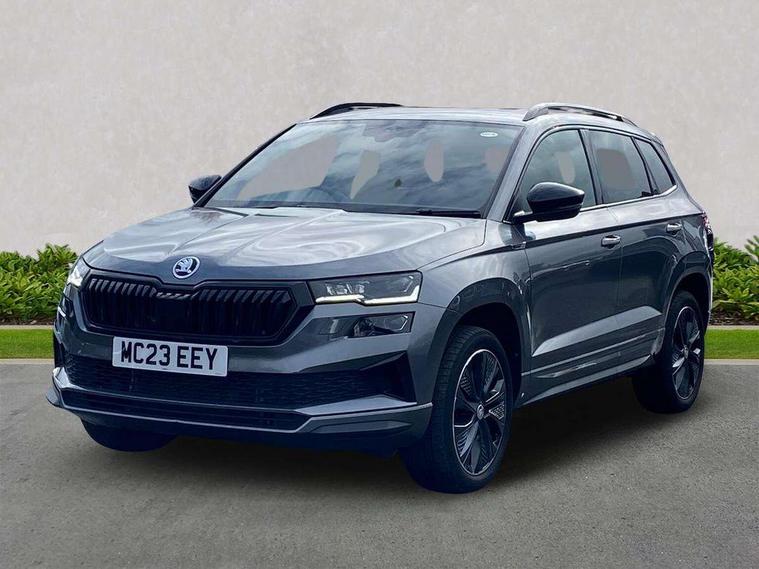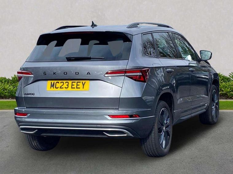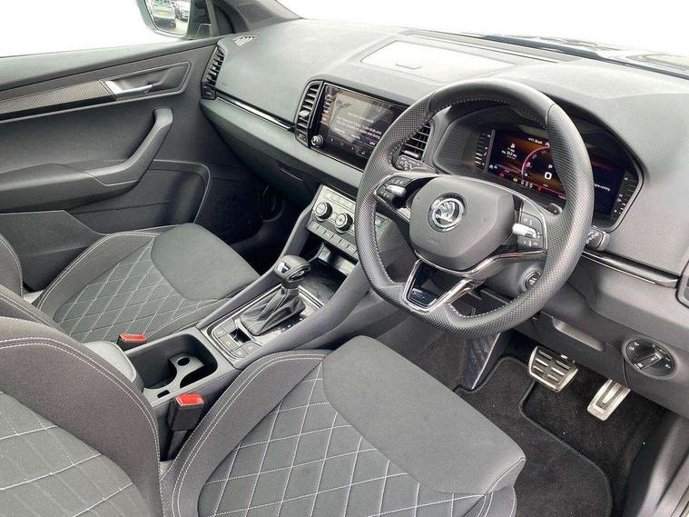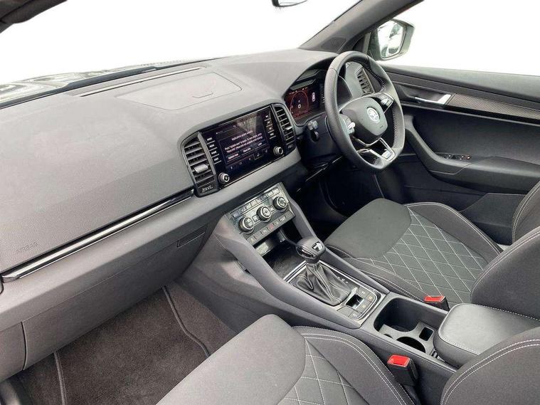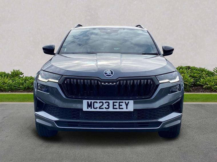 8" Digital display, Care connect, Driver fatigue sensor, Emergency services call system, Outside temperature gauge, Service interval indicator, SmartLink wireless for Apple and wired for Android, Start/stop system with regenerative braking, USB C Port x 2 in front centre console, Virtual cockpit, Virtual pedal with electrically operated boot door, 8 Speakers, DAB radio with Bluetooth, USB connection, Wireless charging without wireless aerial connection, Acoustic glass, Aero front windscreen wipers with intermittent function, Auto dimming rear view mirror with light and rain sensors, Black door mirrors, Black electric window control buttons, Black radiator grille, Black roof rails, Body colour door handles, Dynamic headlight range control with cornering light function, Electric front and rear windows with child proof lock, Front door steps with SportLine logo, Heated rear windscreen, LED daytime running lights, LED rear lights with high functionality welcome effect and dynamic indicators, Light assistant (coming/leaving home/tunnel light), Panoramic sliding sunroof, Plastic scuff plates, Privacy glass, Protective door side sills in body colour, Rear diffuser, Rear side wing doors, Rear spoiler, Rear window wiper with washer system and intermittent control, Safety reflectors on front doors, Skoda lettering on tailgate in black, Sportline badge on front fender, Sportline decorative inserts with badging, Sports front and rear bumpers, 1.5 litre bottle holders in driver and front passenger door panels, 12V socket in boot, 12v socket in front centre armrest with storage compartment and rear air vents, 3 rear height adjustable headrests, 3 seat bench in 2nd row, 3 spoke leather sports multifunction steering wheel and silver stitching with gear shift paddles, 4 foldable roof handles with rear coat hooks, Black floor carpet, Black roof headlining, Chrome inner door handles, Double sided boot floor, Foldable hooks in the boot, Front head restraints, Height adjustable front three point seats belts with tensioners, Height/reach adjust steering wheel, Ice scraper, Illuminated glovebox, Illuminated luggage compartment, Isofix child seat preparation outer rear, Manual lumbar support for front seats, Pen holder, Pollen filter, Rear boot cover, Rear reading lights, Rear seats fixed folding and divided 60:40, Rubbish bin door, Safety vest holder, Single front passenger seat, Storage box in upper central dashboard closed, Sunvisors with illuminated vanity mirrors, Textile floor mats, Ticket holder, Titan black interior ceiling, Welcome animation with sportline logo, Boot pack - Karoq, Light Pack - Karoq, Parking pack - Karoq, Automatic door unlocking in case of crash, Automatic fuel cut off in case of crash, Child locks on rear doors, Driver airbag, Electronic parking brake with auto hold function, Emergency rear braking signal, ESC including ABS, MSR, ASR, EDS, HBA, DSR, RBS, MKB and traction control, Front side airbags, Hill hold control, Knee airbags, Passenger airbag with switch-off function, Pedestrian monitor, Seatbelt reminder signalisation and pretensioner for all seats, Three point seatbelts rear, Two tone horn, Tyre pressure display, Tyre pressure monitor, Alarm with interior monitoring, back up horn and tilt sensor with safe function, Electronic engine immobiliser, Keyless entry and start/stop, Remote central locking with 2 remote folding keys, Black air vent surround, Black centre console, Satin black dashboard, Satin black door trim, 19" Vega black polished alloy wheels, Anti-theft wheel bolts protection, Matt black aero hub caps, Storage on wheel cover, Tool kit,