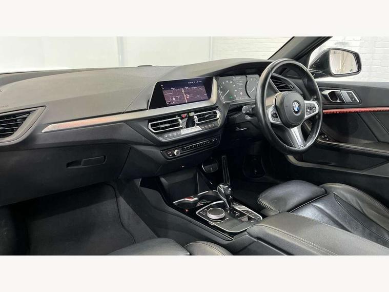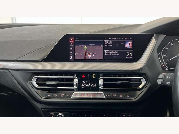 Active guard plus, Attentiveness assist, BMW Online services, BMW Teleservices, Check Control warning system for monitoring of lights and door/luggage compartment open warning, Connected eDrive Services, Eco pro mode, Integrated owners handbook, Oil sensor for level and grade, On board computer, Optimum shift indicator, Personal Profile, Pull away assistant, Speed limiter, Aluminium lightweight construction, Anti roll bar front and rear, Balancer shaft, Double VANOS, Drive Performance Control, Electronic differential lock, High precision injection, M sport suspension, Petrol Particulate Filter, VALVETRONIC engine management, Bluetooth audio streaming, DAB Digital radio, Auto dimming rear view mirror, Automatic headlight beam throw control, Automatic windscreen wipers and automatic headlight, Body colour door handles, Body colour mirror caps, Chrome 'M' logo side designation, Chrome exhaust tailpipe in single, round (Exhaust tailpipe, stainless steel - single, round), Chrome kidney grille frame with Satin Aluminium struts, Direction indicator side lights in exterior mirrors, Electric folding and anti dazzle exterior mirrors, Fading support, Follow me home headlights, Front and rear bumper system with replaceable deformation elements, Front and rear electric windows with open and close fingertip control, anti trap facility and comfort closing, Front door sill finishers in black plastic with M designation in metallic look, Green tinted heat protection glazing, Heated, electrically adjustable exterior mirror aspheric on driver side, convex on passenger side, High gloss shadowline window frame, Recess cover mirror frames and B/C pillar embelisher trim, High level third brake light, LED daytime running lights, LED eyebrow turn indicators, LED front fog lights, Lightweight engineering, Matt black air guide grilles, Model designation on right side of tailgate, Nearside reverse light in rear light cluster, Preparation for high beam assistant, Rain sensor including auto headlights activation, Rear fog lights, Rear window wiper, Shark fin antenna, Visible VIN plate, Welcome lighting, 12V power socket in centre console, 3 rear seat head restraints, 3 spoke M sports design leather steering wheel finished in nappa leather with specific M badge, Anthracite headlining, Anthracite Velour floor mats, Child seat ISOFIX attachment for two outer rear seats and front passenger seat with anchorage points, Conditioned based service, Dakota leather upholstery with perforation and contrast stitching, Driver and front passenger seat heating, Folding rear clothes hook, Four grab handles integrated in roof lining, Front and rear door pockets, Front and rear door pockets with bottle holders, Front and rear side armrest integrated into door trim, Front armrest foldable with integrated storage compartment, Front sports seats with electric side bolster adjustment, Glove compartment, Height adjustable front head restraints, Manual adjust steering wheel, Multi-function controls for steering wheel, Storage compartment in centre console, Sun visors with vanity mirrors and insert tab, Two zone automatic air conditioning, Additional interior lighting pack - 1 Series, Connected pack professional - 1 Series, Extended storage pack - 1 Series, Interior lights pack - 1 Series, Luggage compartment pack - 1 Series, M Sport exterior styling aerodynamics pack - 1 Series, 2 tone horn, 3 point seatbelts on all seats, front pyrotechnic belt tensioners, stopper and belt force limiters, rear coded belt buckles, Airbags - front driver/passenger, front & rear curtain, front side, Anti lock braking system (ABS) with brake assist, BMW emergency call, Brake drying, Braking readiness, Crash sensor activating central locking release, hazard warning lights, fuel cut off, interior lighting + activation of safety battery terminal clamp, Driver and front passenger seat belt security check, Dynamic stability control + (DSC+), Dynamic Traction Control - DTC, Electrically operated hand brake, Front and rear disc brakes, Front passenger manual airbag deactivation, Seatbelt warning, Side impact protection, Tyre pressure monitoring system, Warning triangle and first aid kit, Automatic drive away locking facility, Central locking switch for all doors, fuel filler cap and luggage compartment, Deadlocking function system to all doors, Locking wheel bolts, Remote control with integrated key with High-gloss Black inlay and M designation and 1 button for open/ close lock, window, open luggage compartment, Start/stop button with comfort go keyless engine start and auto start stop deactivation button, Thatcham Cat.1 alarm and immobiliser, Contrast stitching on instrument panel, Reduced rolling resistance tyres,