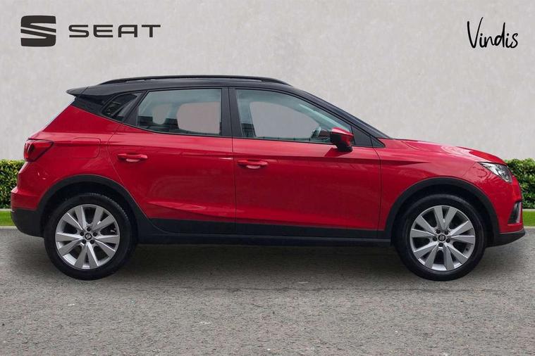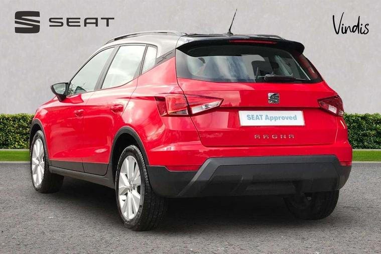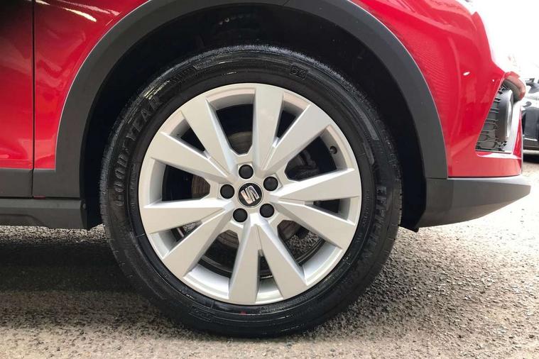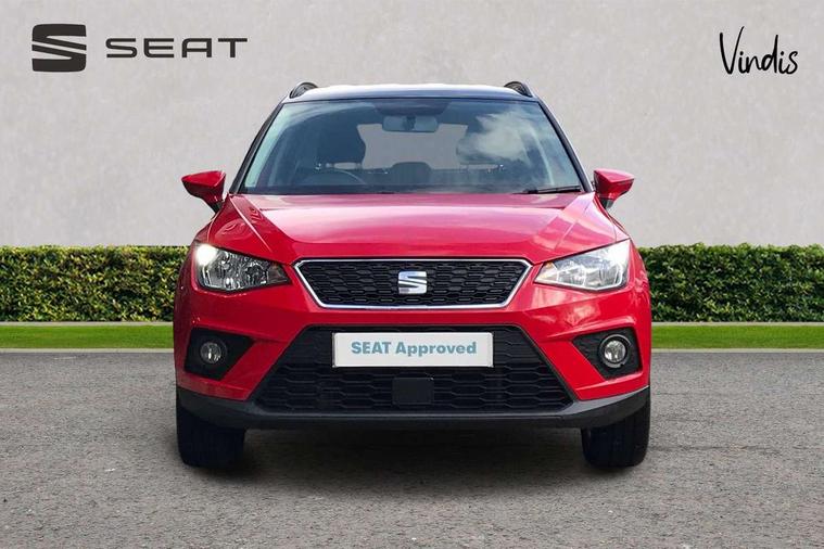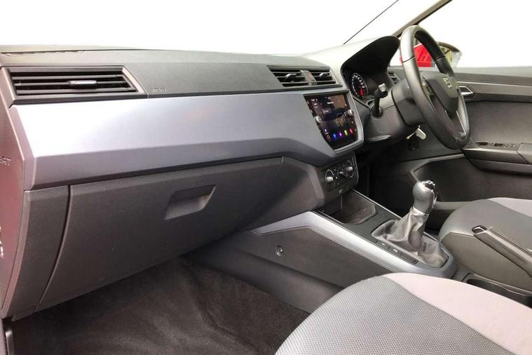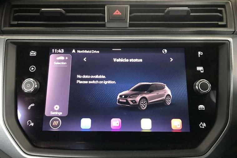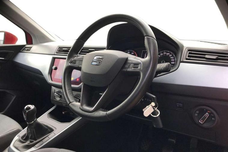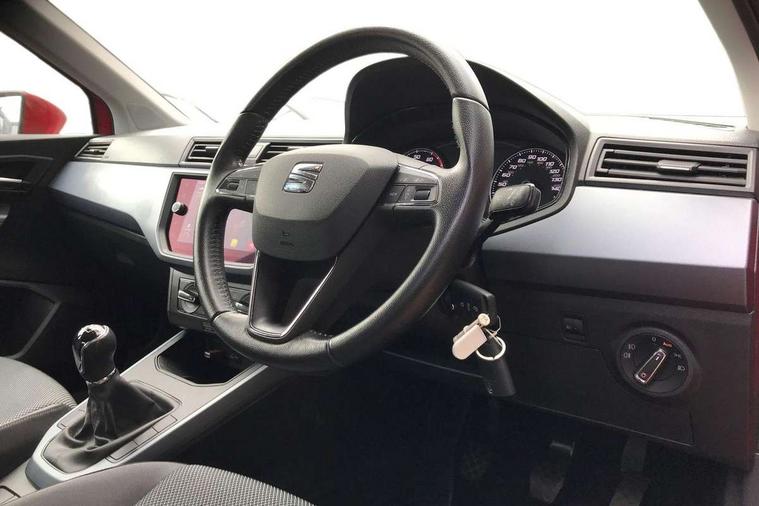 'Lights On' Reminder warning buzzer, Cruise control and speed limiter, Digital clock, Electric speed sensitive power steering, Full Link Smartphone Integration with Mirror Link, Apple Car Play, Google Android Auto with USB Type C cable for Apple and Android compatibility, Low fuel warning light, Outside temperature display, Rear parking sensor, RPM counter, Seat connect with safety, service, remote and online, Trip computer, Comfort suspension, 6 speakers, Bluetooth interface for hands free and audio streaming, DAB digital radio and AM/FM radio, Steering wheel mounted audio controls, Anti theft roof antenna, Automatic activation of hazard warning lights, Automatic headlights, Black roof rails, Black window trims, Body coloured bumpers, Body coloured door handle inserts, Body coloured door mirrors, Dimming rear view mirror, Electric adjustable door mirrors, Electric front/rear windows with one touch/auto up/down, Electric headlight adjustment, Front fog lights with cornering function and rear fog light, Halogen tailights, Hidden exhaust pipe, LED daytime running lights, LED licence plate lighting, Protective side mouldings, Rear window wash/wipe, Twin halogen headlights, Visible VIN plate, Windshield wiper with intermittent control and potentiometer, 2 cupholders, 60/40 split folding rear seat, Air conditioning, Cloth upholstery, Double boot floor, Driver sunvisor with covered mirror + card holder, Dust/pollen filter, Front courtesy light with front reading lights, Gear shift indicator, Grey interior roof, Height adjustable front seats, Height/reach adjustable steering column, Illuminated boot, Instrument lighting with brightness control, ISOFIX points in outer rear seats with top tether anchorage points, Leather steering wheel/gear knob/handbrake, Passenger sunvisor with vanity mirror, Two front and three rear height adjustable headrests, Connectivity pack plus - Arona, Interior chrome pack - Arona, 3 point seatbelts on all rear seats, ABS, Active front headrests, Child locks on rear doors, Driver and front passenger airbags with front passenger airbag de activation, front side and curtain airbags, Electronic stability control, Emergency Brake Assist (EBA) and front assist, Front and rear seatbelt reminder, Hill hold control, Multi-Collision braking, Tiredness recognition system, Traction control, Tyre pressure monitoring system, 2 folding remote keys with window open/close function, Electronic engine immobiliser, Locking wheel bolts, Remote central locking + deadlocks, Interior chrome line trim, Plastic grey dashboard, 17" Dynamic alloy wheels,