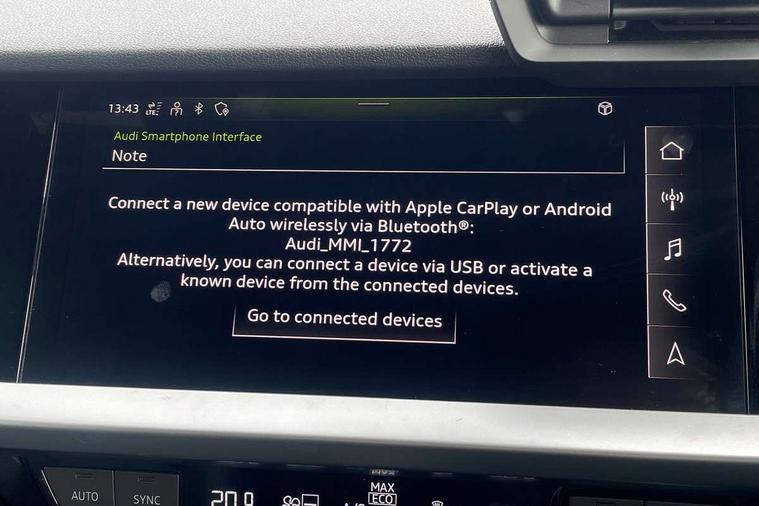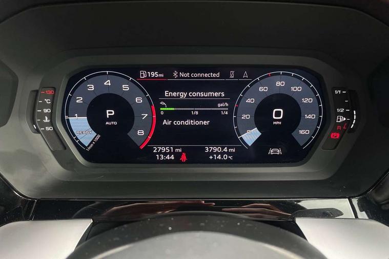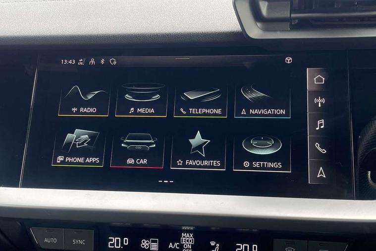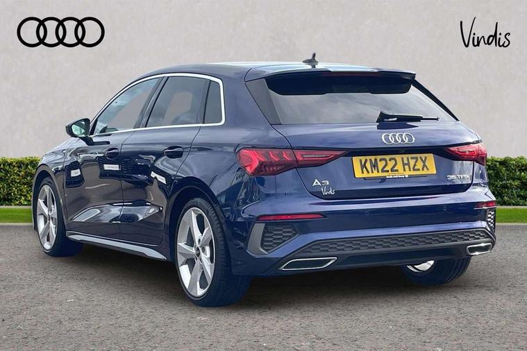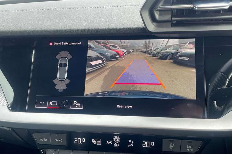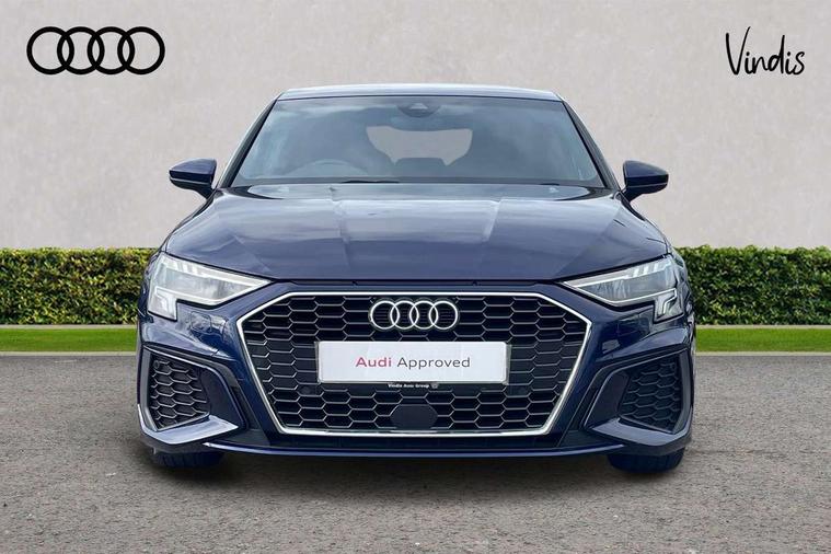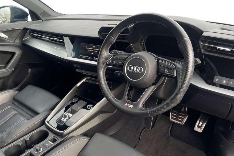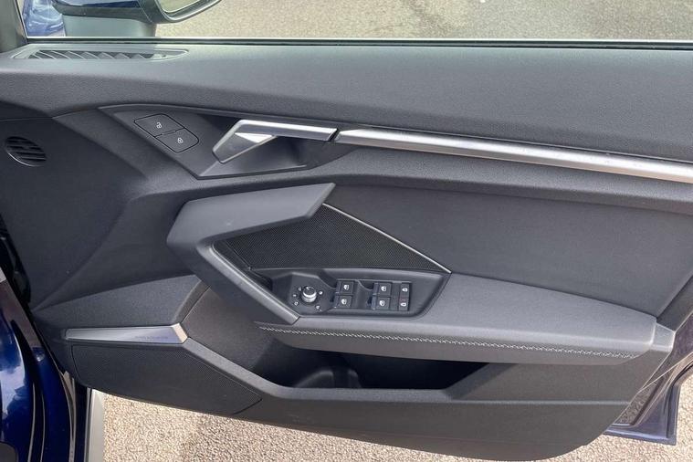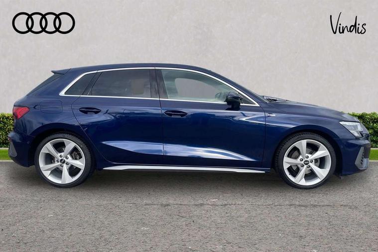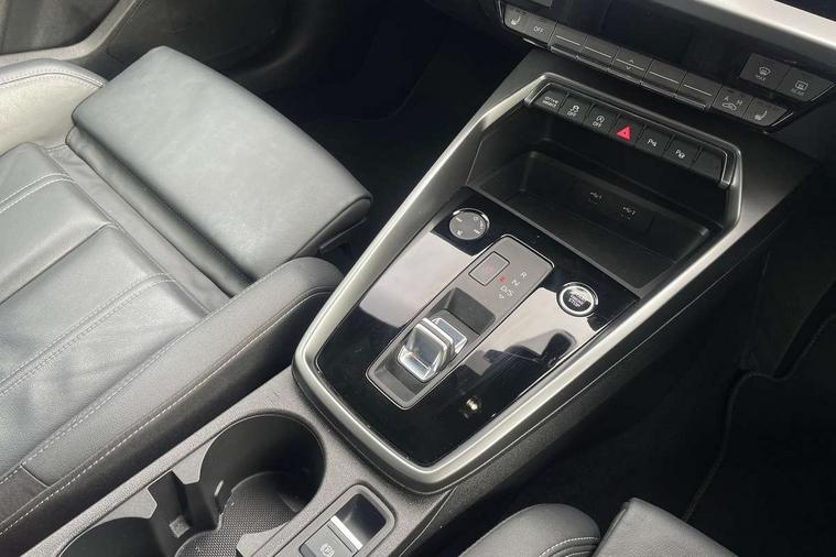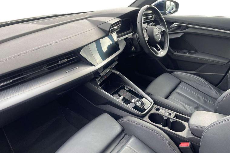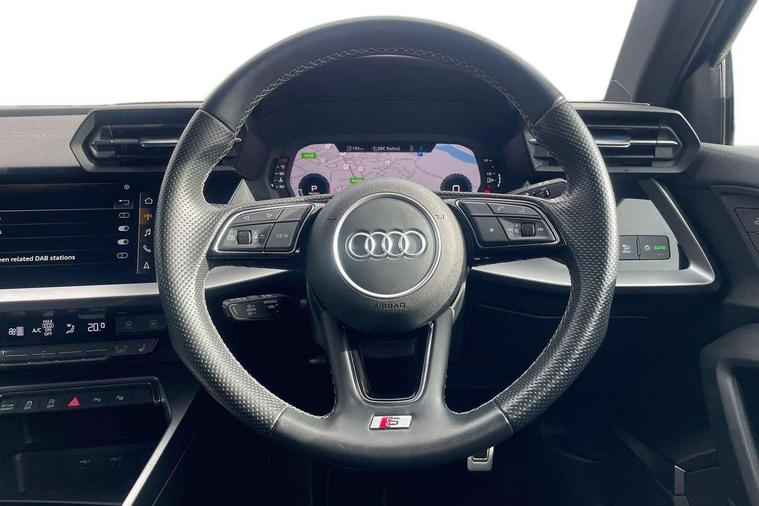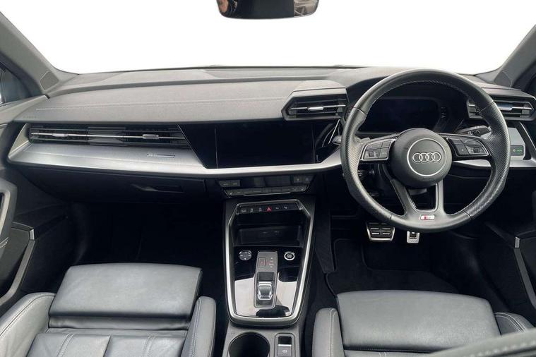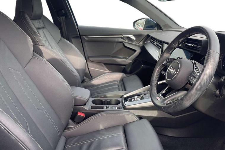 Audi drive select (Auto, Comfort, Dynamic, Efficiency and Individual), Audi smartphone interface, Audi Virtual Cockpit - 10.25" digital and colour instrument cluster, Automatic start/stop system with recuperation, Bluetooth interface, Collision avoidance assistant, e-Call (emergency call), Electromechanical power speed sensitive steering, Lane departure warning system, MMI Navigation Plus with high resolution 10.1" colour touch screen display, Service indicator, Trip computer, Voice control system with natural language interaction, 2xUSB-C connection with data and charging functions, 6 passive loudspeakers, DAB Digital radio, 3rd brake light, Acoustic glass windscreen, Aluminium window trim, Auto dimming frameless rear view mirror, Electrically adjustable/heated/folding/dimming door mirrors with kerb view includes integrated LED indications + kerb view function for passenger side, Front electric windows, Illuminated aluminium inserts front door sills with S logo, LED daytime running lights, LED headlights with LED rear lights and dynamic rear indicators, Light and rain sensors, Privacy glass - dark tinted rear window, rear door and side windows, Rear electric windows, Rear side air outlets in grained matt black, Rear side wing doors, Rear wiper, S line bumpers, S roof spoiler, 12V socket and storage compartment in front centre console, 3 seat bench in 2nd row, 40/20/40 split folding rear seat bench with cupholder, Black cloth headlining, Dual zone electronic climate control, Front and rear centre armrest in leather, Front and rear headrests, Front/rear floor mats, Height and reach adjustable steering wheel, Illuminated vanity mirror, Interior lighting - glove compartment light and right hand side, Luggage compartment floor covering, Manual boot compartment lid, Manually adjustable front seats, Seat side bolsters, Single front passenger seat, Stainless steel pedals and front footrest in black, Twin leather upholstery with front sports seats S embossed logo, Aluminium interior elements pack - A3 Sportback, S line styling pack - A3 Sportback, 3x3 point rear seat belts, Audi pre sense front, Driver and front passenger airbag with passenger airbag deactivation, Electronic Stabilisation Control (ESC) including ABS, ASR and EDL, First aid kit with warning triangle and 2 safety vests, Front side airbags with head airbags and interaction airbag, Pre-sense front with pedestrian and cyclist detection, Seatbelt monitoring, Tyre pressure loss indicator, Anti theft alarm, Anti-theft wheel bolts, Immobiliser, Manual child locks, Remote control central locking, Accent surfaces in the dashboard and centre console in platinum grey silk effect paint finish, Dark spectrum aluminium inlays,