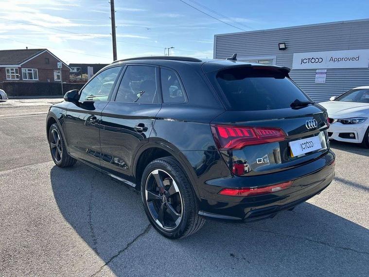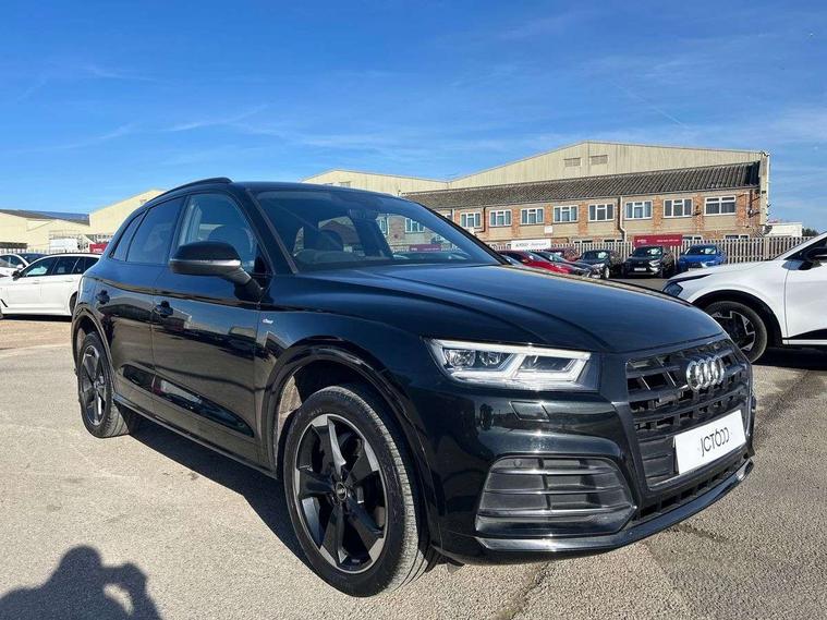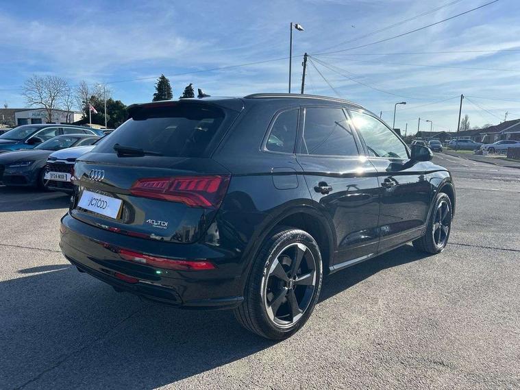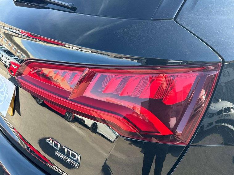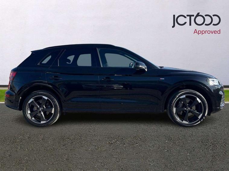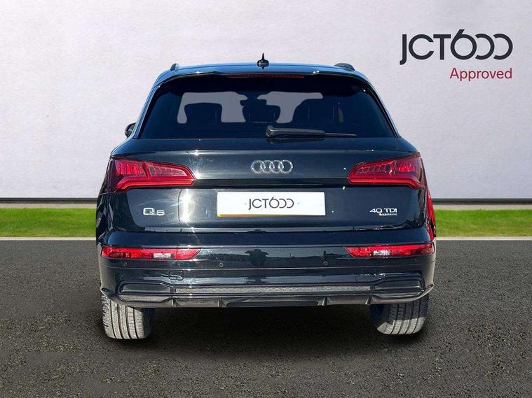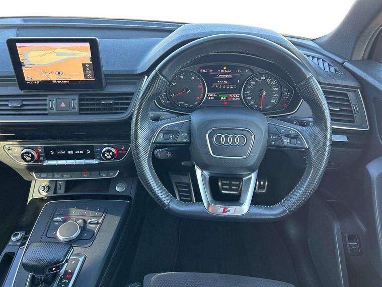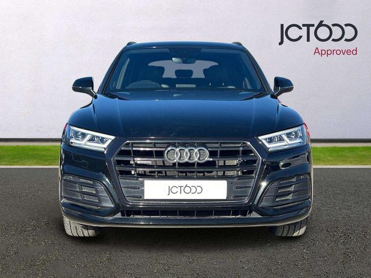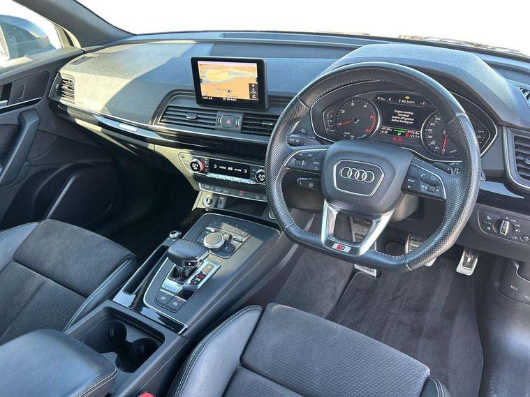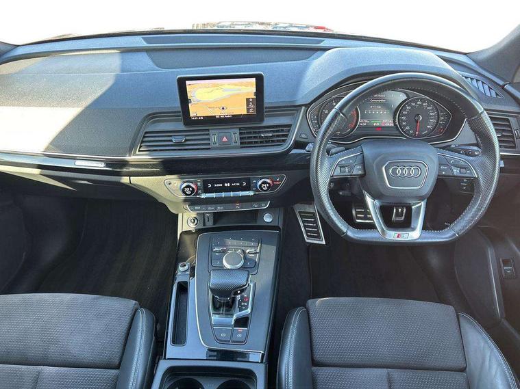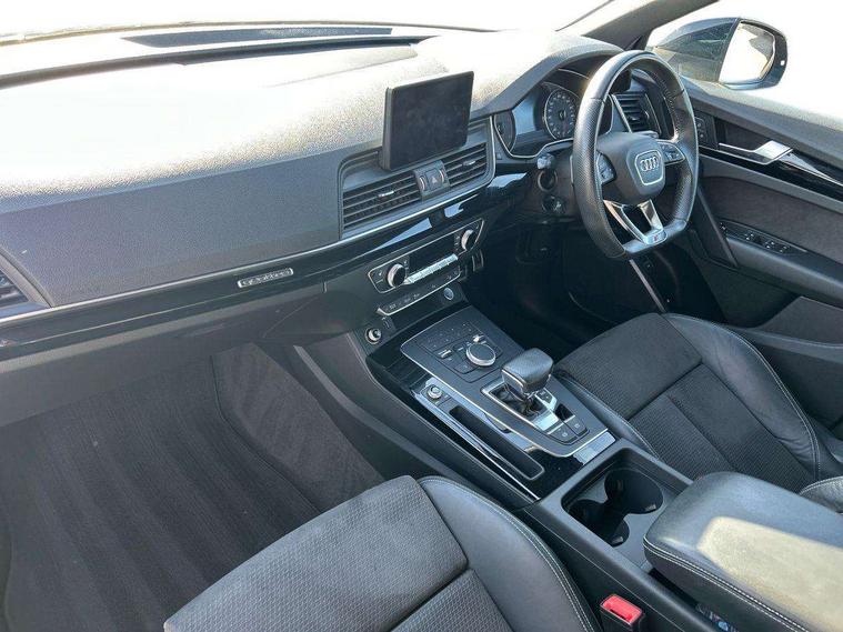 7" Colour driver information system, Audi connect infotainment services, Audi connect safety and service (e-call), Audi drive select, Audi parking system plus with front and rear sensors, Audi smartphone interface, Automatic start-stop system with coasting functionality and efficiency programme, Electro - mechanical power assisted steering, MMI Navigation, Mobile telephone preparation - bluetooth interface, Power tailgate, Service interval indicator, Voice control system, Diesel particulate filter, Dynamic suspension, Quattro on demand, 2x SD card slot, CD player, DAB Digital radio, MMI radio plus with 7" colour MMI screen and MMI controller, Acoustic windscreen, Air inlets in matt titanium black with blades in matt aluminium silver, Auto dimming rear view mirror, Automatic headlight levelling, Black roof rails, Body colour bumpers, Body colour rear diffuser with matt aluminium silver surrounds, Body colour underbody protection, Chrome exhaust tailpipe, Electric adjustable/heated/folding door mirrors, Front and rear electric windows, High beam assistant, LED headlights with LED rear lights + dynamic rear indicators, Light and rain sensor for auto activation of lights and windscreen wipers, Loading sill protector in stainless steel, Privacy glass with front acoustic glazing, Rear wiper, Titanium black door mirror housings, 2 x USB charging port with aux input socket, 3 rear headrests, 3 spoke flat bottom high multi-function leather steering wheel, 3 zone climate control, 40:20:40 split folding rear seat with rear centre armrest, Black cloth headlining, Contrast stitching on seats, steering wheel and gear lever gaiter, Front centre armrest, Front sports seats, Front/rear floor mats, Heated front seats, Height adjustable front head restraints, Height/reach adjustable steering column, ISOFIX child seat mounting and top tether, Luggage compartment carpet, Manual seat adjustment with 4-way electric lumbar support, Perforated leather gearknob, Removable luggage compartment floor, Stainless steel pedals, Sunvisors with vanity mirrors, Tool kit, Trunk roller cover, LED interior light pack - Q5, Non Smokers pack, Titanium black styling pack - Q5, 3 point seatbelts on all seats, 6 airbags - Driver, front passenger, curtain and side airbags, Electromechanical parking brake, Electronic stabilisation control including ABS, ASR and EDL, Front passenger airbag deactivation, Hill descent control, Hill hold assist, Multi collision brake assist, Pop-up bonnet for pedestrian protection, Pre sense city, Seat belt force limiter, Seatbelt monitoring, Tyre pressure warning, Warning triangle and first aid kit, Anti theft alarm, Anti-theft wheel bolts, Keyless Go access/ignition system, Remote central locking, Black piano finish inlays, 20" 5 arm rotor design sport alloy wheels in gloss anthracite black, diamond cut finish,