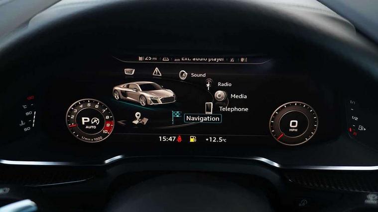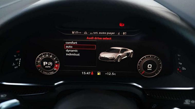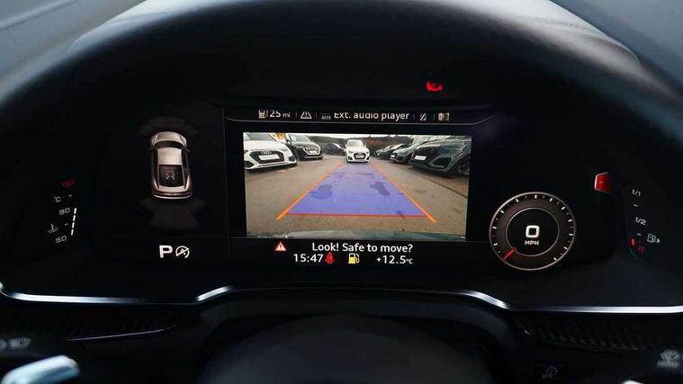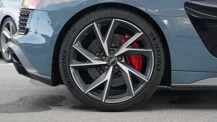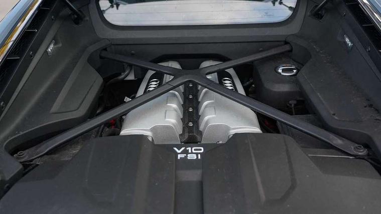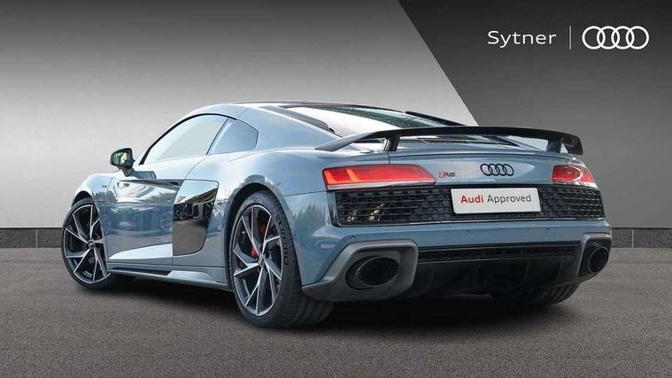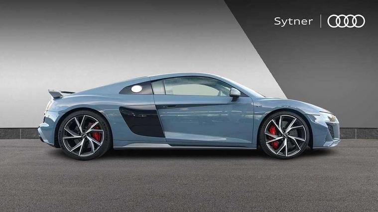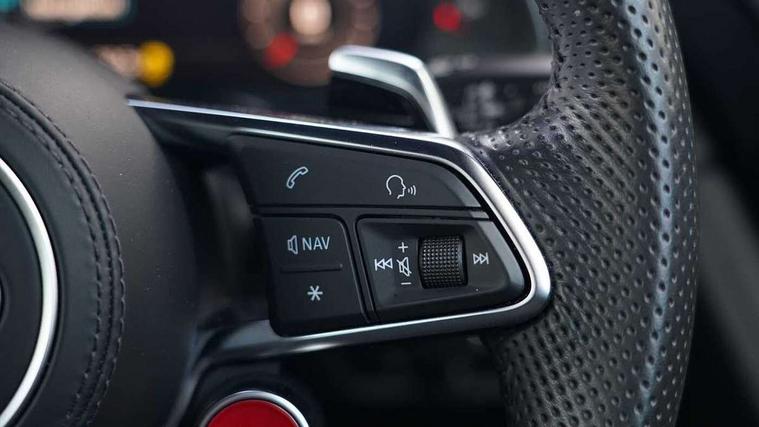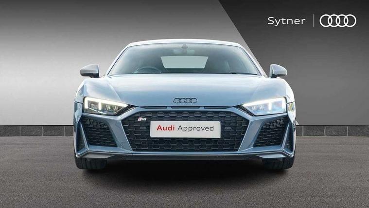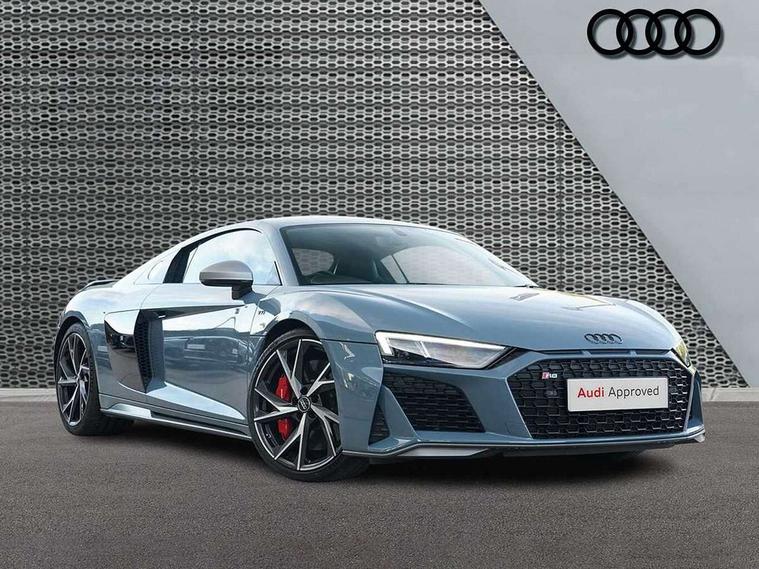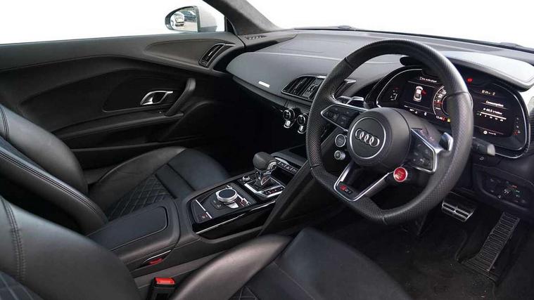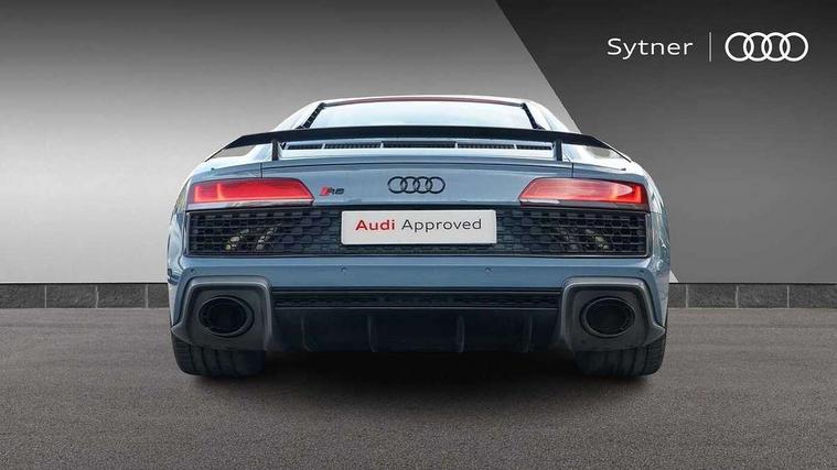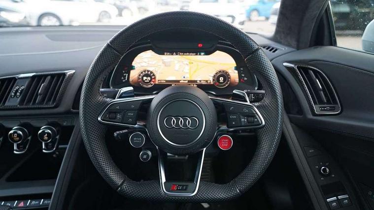 Audi connect, Audi drive select, Audi parking system plus with front and rear sensors, Audi phone box with wireless charging, Audi smartphone interface, Audi virtual cockpit, Bluetooth interface, Cruise control with speed above 18mph, MMI navigation plus with MMI touch, PAS, Reversing camera, Service interval indicator, Start/Stop system with energy recuperation, 73 litre fuel tank, Audi cylinder on demand, Performance sports suspension, Quattro all wheel drive system with passive differential lock on rear axle with wheel selective torque control, Audi music interface, Audi sound system, DAB Digital radio, Audi space frame, Auto dimming rear view mirror and frameless with light and rain sensor, Electric front windows, Electrically adjustable, heated, folding and automatically dimming door mirrors with integrated LED indicator, Fixed rear lip spoiler in Gloss Carbon, Gloss black oval tailpipe trim, Gloss black radiator grille with R8 emblem, Green tinted glass, Heat insulating glass, Heated rear window, High beam assist, Laminated windscreen, LED headlights with dipped beam, daytime running lights, indicator and static turning light in LED technology, LED rear lights with dynamic rear indicators, Matt titanium exterior mirror housings, Matt titanium styling grill and air inlets, 3 spoke flat bottomed multi-functional perforated performance leather steering wheel with 3 operating satellites, Deluxe automatic climate control air conditioning, Door sill trims in plastic with aluminium inlays and R8 logo, Driver seat memory function, Extended inlays in titanium finish and glossy anthracite for air vent surround, Front head restraints, Quattro badging on dash, Quattro emblem in the dashboard on front passenger side, Seat heating, Stainless steel pedals and footrest, Full leather pack - R8, Interior light pack - R8, Matt titanium look styling pack - R8, Driver/front passenger airbag, EDL traction control, ESP, Front passenger airbag deactivation, Front side airbags, Hill hold control, Seatbelt monitoring, Side curtain airbags, Tyre pressure warning light, Warning triangle and first aid kit, Wave brake discs, Advanced key with safelock, Anti theft alarm and immobiliser, Locking wheel bolts, Preparation for tracking system, Remote central locking, Leather interior trim, Tool kit, Tyre repair kit,