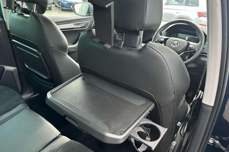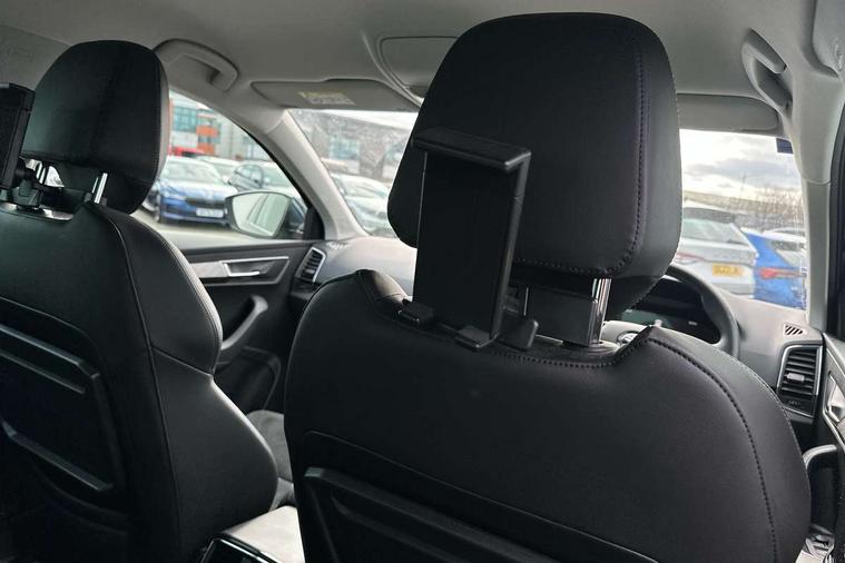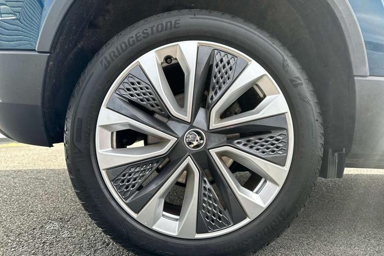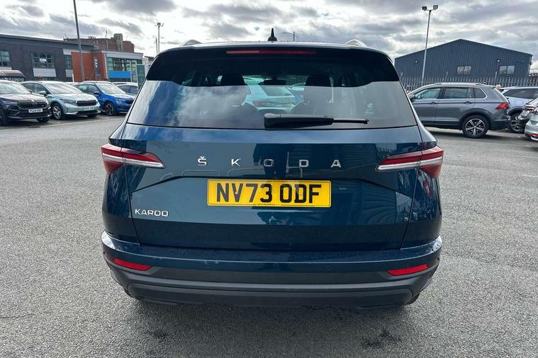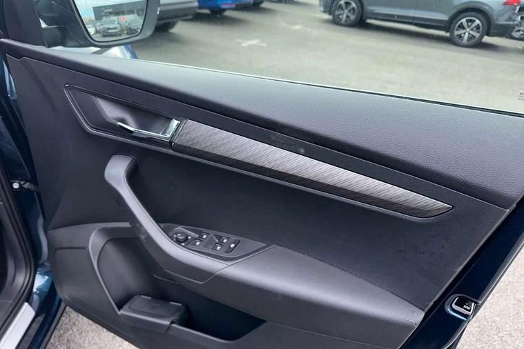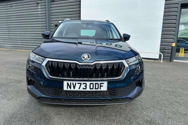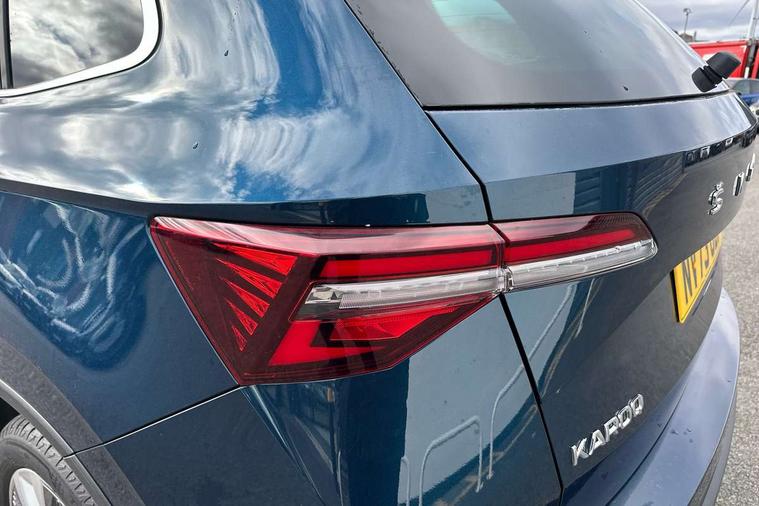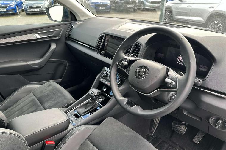 8" Digital display, Care connect, Driver fatigue sensor, Emergency services call system, Outside temperature gauge, Service interval indicator, SmartLink wireless for Apple and wired for Android, Start/stop system with regenerative braking, USB C Port x 2 in front centre console, 8 Speakers, DAB radio with Bluetooth, USB connection, Acoustic glass, Aero front windscreen wipers with intermittent function, Auto dimming rear view mirror with light and rain sensors, Black electric window control buttons, Body colour door mirrors and handles, Dynamic headlight range control with cornering light function, Electric front and rear windows with child proof lock, Heated rear windscreen, LED daytime running lights, LED rear lights with high functionality welcome effect and dynamic indicators, Light assistant (coming/leaving home/tunnel light), Plastic scuff plates, Privacy glass, Rear side wing doors, Rear spoiler, Rear window wiper with washer system and intermittent control, Safety reflectors on front doors, 1.5 litre bottle holders in driver and front passenger door panels, 12V socket in boot, 12v socket in front centre armrest with storage compartment and rear air vents, 2 spoke leather heated multifunction steering wheel with DSG paddles, 2 x Tablet holder, 3 rear height adjustable headrests, 3 seat bench in 2nd row, 4 foldable roof handles with rear coat hooks, Black floor carpet, Chrome inner door handles, Double sided boot floor, Foldable hooks in the boot, Front head restraints, Height adjustable front three point seats belts with tensioners, Height/reach adjust steering wheel, Ice scraper, Illuminated glovebox, Illuminated luggage compartment, Isofix child seat preparation for front passenger seat, Isofix child seat preparation outer rear, Manual lumbar support for front seats, Pen holder, Pollen filter, Rear boot cover, Rear reading lights, Rubbish bin door, Safety vest holder, Single front passenger seat, Storage box in upper central dashboard closed, Sunvisors with illuminated vanity mirrors, Textile floor mats, Ticket holder, VarioFlex seats with standard rear seat release, Boot pack - Karoq, Design Pack - Karoq, Parking pack - Karoq, Automatic door unlocking in case of crash, Automatic fuel cut off in case of crash, Child locks on rear doors, Driver airbag, Electronic parking brake with auto hold function, Emergency rear braking signal, ESC including ABS, MSR, ASR, EDS, HBA, DSR, RBS, MKB and traction control, Front side airbags, Hill hold control, Knee airbags, Passenger airbag with switch-off function, Pedestrian monitor, Seatbelt reminder signalisation and pretensioner for all seats, Three point seatbelts rear, Two tone horn, Tyre pressure display, Tyre pressure monitor, Alarm with interior monitoring, back up horn and tilt sensor with safe function, Electronic engine immobiliser, Keyless entry and start/stop, Remote central locking with 2 remote folding keys, Chrome framed air vents, 18" Miran alloy wheels in black, Anti-theft wheel bolts protection, Tool kit,
