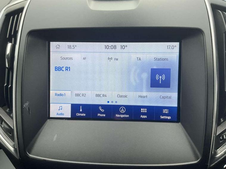 'Ford Power' starter button, Easy fuel capless refuelling system, eCall emergency call system, Ford pass connect embedded modem, Hydraulic PAS, Lane keeping aid - Driver impairment monitor, active steering with lane departure warning, Lights on warning, Outside temperature display, Tailgate, Traffic sign recognition, Trip computer, Unique instrument cluster, Auxiliary input socket, Steering wheel audio controls, Auto dimming rear view mirror, Auto high beam assist, Automatic headlights, Automatic wipers with variable sensitivity adjustment, Body colour bumpers, Body colour door mirrors, Chrome trim to lower side windows, Dual exhaust pipes, Electric front and rear windows + one touch + global open/closing, Front fog lights, Halogen headlight with cornering lights, Headlight courtesy delay, Hybrid badge, LED daytime running lights, LED rear lights, LED third brake light, Lower front grille with chrome surround, Power folding and heated door mirrors, Quickclear heated windscreen, Rain sensor, Rear privacy glass - dark glass to rear windows, Rear side wing doors, Silver roof rails, 2 height adjustable headrests - 3rd row, 230V power outlet in centre console, 2nd row reading lights, 3 height adjustable headrests - 2nd row, 3 individual fold flat 2nd row seats, 3rd row rear seats with manual fold flat, slide/recline and manual easy entry, Ambient interior lighting (excludes 2nd row footwell), Driver/passenger sunvisors with illuminated vanity mirrors + covers, Dual zone air conditioning, Floor mats in all three rows, Front door scuff plates, Front headrests, Front seat armrests, Front seat storage pockets, Front sports seats, ISOFIX attachments for child seats in 2nd row, Leather gear knob, Leather trimmed steering wheel, Manual adjustable front seats + lumbar support, Overhead console with child observation mirror, Pollen filter, Reach + rake adjustable steering column, Rear cupholders, Single passenger seat, Sunglasses storage, Tray tables on front seatbacks, 3 point seatbelts on all seats, ABS, Child proof door locks, Driver and passenger airbags, Driver and passenger side airbags, Drivers knee airbag, Electric handbrake, Electronic brake force distribution, ESP with traction control + emergency brake assist, Pre-Collision assist with AEB, Regenerative braking system, Seatbelt warning, Side curtain airbags, Tyre pressure monitoring system, Immobiliser, Keyless entry, Locking wheel nuts, MyKey system, Remote control central locking, Thatcham Cat.1 alarm, Tyre inflation kit,