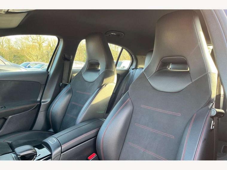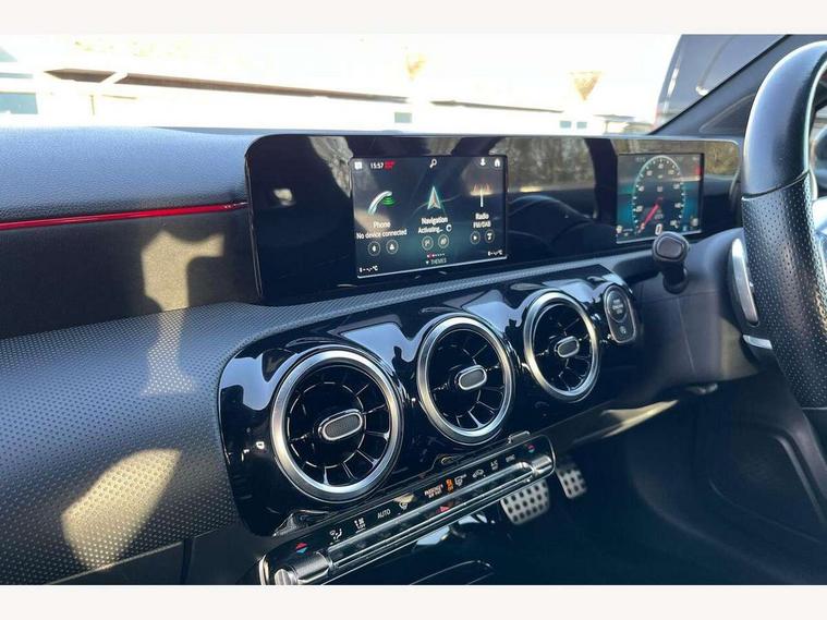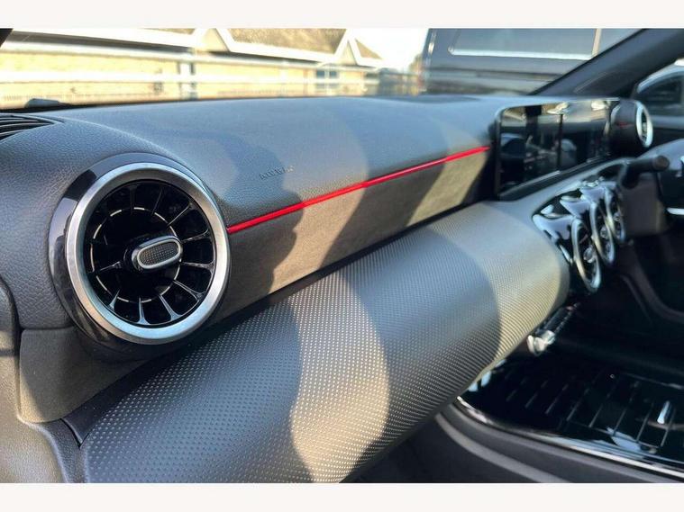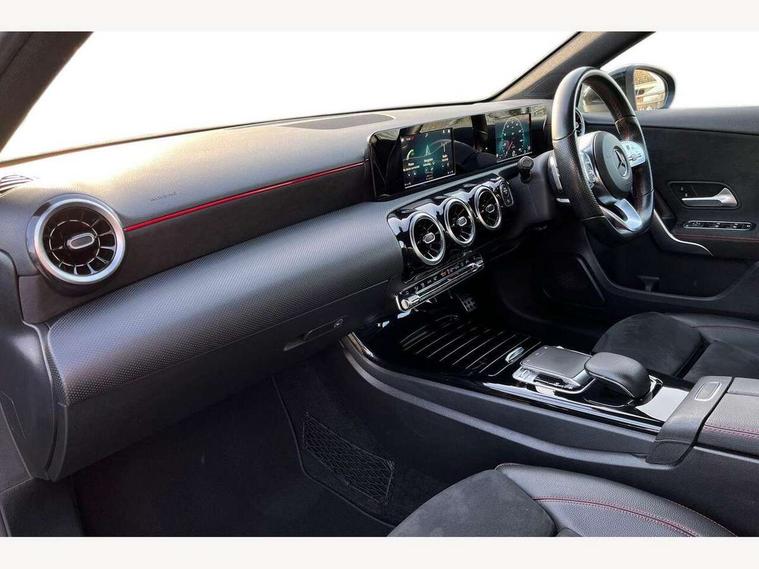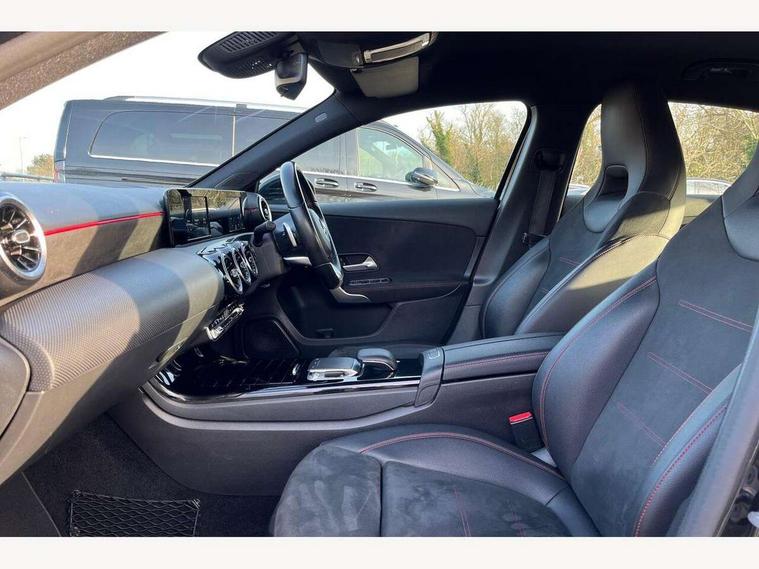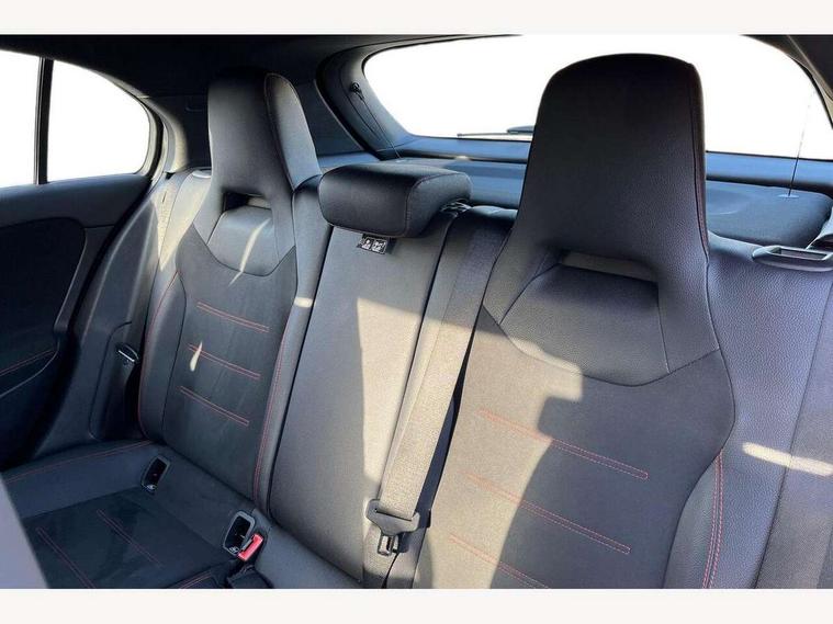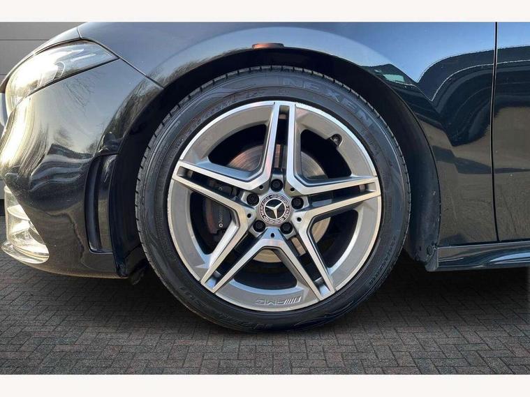 180 degree rear view camera with parking guidelines, 7" colour screen in instrument panel, 7" touchscreen media display, Active lane keep assist, Attention assist, Brake pad wear indicator warning light, Cruise control + speed limiter, Direct steering, Direction indicators with lane change function, DYNAMIC SELECT with a choice of driving modes (ECO, Comfort, Sport, Sport+ and Individual), Fluid level warning indicator for fuel, oil, coolant and washer fluid, Hard-disk navigation, Lamp failure indicator, Mercedes me connect including emergency call system, accident recovery, breakdown and maintenance management, Outside temperature gauge, Radio aerial integrated into roof spoiler, Service indicator (ASSYST), Speed sensitive power steering, Stop/start system, Trip computer, Voice activation, Lowered comfort suspension, DAB Digital radio, Dual bluetooth interface, 2 USB ports (type C), MBUX multimedia system with DAB digital radio and touchpad including satellite navigation, Adaptive brake lights, AMG front, rear apron and side skirts, Blue tinted glass, Body colour bumpers, Body colour door handles, Body colour side skirt, Body coloured door mirrors, Chrome beltline trim, Diamond radiator grille with chrome pins and silver louvre + chrome insert, Electric adjustable and heated door mirrors with integrated LED side indicators, Electric front windows, Electric rear windows, Exhaust system - Twin trapezoidal tailpipes in polished stainless steel, Headlamp assist automatic headlamp activation, Heated glass rear windscreen + timer control, LED high performance headlamps with integrated LED daytime running lights, LED tail lamp, LED third brake light, Rain sensor windscreen wipers, Rear fog lights, Rear wiper, 12V socket, 3 Spoke flat bottom leather multi function steering wheel with perforated leather in grip area, 40:20:40 split folding rear seats, Air vents surround and cruciform nozzle in silver chrome, AMG floor mats with red stitching, Artico man-made leather/Microfibre Dinamica upholstery with red contrast stitching, Auto Mercedes-Benz child seat recognition sensor, Black roof lining, Brushed stainless steel sports pedals with rubber studs, Controller on centre console with chrome surround, Cup holder and stowage compartment lighting, Front centre armrest with storage compartment, Front door sills with Mercedes Benz lettering, Front doors with ambient and signal light, Front footwell lights, Front reading lamps, Front seat backs luggage nets, Front seat cushion length adjustment, Front signal exit lamp, Front vanity lights, Gearshift paddles on steering wheel, Handle recess/closing light, Height/reach adjustable steering column, Illuminated glovebox, ISOFIX Child seat top tethers and anchor fixings, Load securing rings in luggage compartment, Luggage compartment cover, Manual height adjustable front seats, Oddments tray lighting, Rear head restraints, Rear Reading Lamps, Seat occupancy sensor for front passenger seat, Sports seats with integrated headrests, Storage compartment under load area floor, Sunvisors with illuminated vanity mirrors, Touchpad, Touchpad illumination, Twin front cupholders, Two zone thermotronic luxury automatic climate control, Seat comfort pack - A Class, 3 rear 3 point seatbelts, ABS with Brake Assist, Active bonnet, Active brake assist includes forward collision warning system with autonomous braking, Adaptive brake assist with hold function and hill start assist, Black seatbelts, Brake calipers with Mercedes-Benz lettering + perforated brake discs, Childproof locks manually operated for rear doors and electrically operated for rear power windows, Crash responsive emergency lighting, Driver and passenger head and side airbags, Drivers knee airbag, Dual stage driver/passenger airbags, Electronic parking brake, ESP curve dynamic assist, ESP with ASR, Front and rear seatbelt reminder, Tyre pressure monitoring system, Warning triangle and first aid kit, Window airbags, Alarm system/interior protection/immobiliser, Keyless Go, Remote central locking and crash sensor with emergency opening function, 18" AMG 5 twin spoke light alloy wheels in titanium grey with highsheen finish, Tirefit sealant kit,
