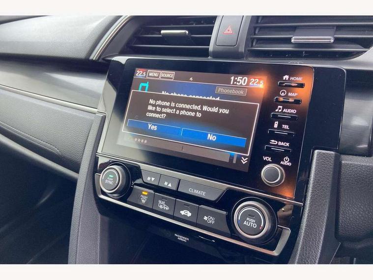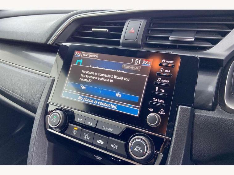 7" touch screen, Adaptive cruise control, Adaptive motion for electric power steering, Apple car play/Android Auto, Blue dashboard illumination, Bluetooth hands free telephone connection, Easy fuel capless refuelling system, Economy mode, Electric power steering wheel with variable gear ratio steering, Emergency stop signalling system, Forward collision warning, Front and rear parking sensors, Honda CONNECT with GARMN Navigation + 7" touchscreen, AM/FM, internet radio, aha app integration and internet browsing, Idle stop, Intelligent speed limiter, Lane departure warning system, Lane keep assist, Multi-information display, Rear parking camera, Road departure mitigation, Traffic sign recognition, Vehicle stability assist, 'Shark fin' mobile antenna, 180w Power audio system, 2x USB and HDMI, 8 speakers, Auxiliary socket for external MP3 player, Digital Audio Broadcast (DAB) Tuner, Steering wheel mounted audio controls, Automatic coming/leaving home lighting function, Automatic headlights with dusk sensor, Automatic rain sensing wipers, Black grille, Body colour door handles, Body coloured bumpers, Chrome window surround, Electric adjustable heated door mirrors, Electric front/rear windows/one touch operation, Electrically folding door mirrors, Fuel filler cap, Halogen front fog lights, Headlight washers, High beam assist, LED daytime running lights, LED Headlights, LED rear lights, Power foldback door mirrors, Privacy glass, Rear spoiler, Rear wiper, Single exhaust tailpipe, 4 Cargo net hook, 60/40 split folding rear seat, Alloy pedals, Ambient light in roof, Blue meter illumination, Centre console storage and sliding armrest, Cloth upholstery, Driver and front passenger seat electric lumbar adjustment, Driver's seat height adjustment, Dual climate control air conditioning system, Front accessory power socket, Front map lights, Front/rear courtesy lights, Gear shift indicator, Glovebox light, Isofix points, Isofix system on outer rear seats, Leather gear knob, Leather steering wheel, Luggage floor box, Passenger seat back pocket, Rear air vents, Rear armrest with cupholder, Sunvisors with illuminated vanity mirrors, Three height adjustable rear head restraints, Tilt/telescopic adjustable steering wheel, Tonneau cover, Trunk light, 5 three point seatbelts, ABS+EBD+Brake assist, Airbags - driver and front passenger, Anti-whiplash front headrests, Collision mitigation braking system, Deflation detection system, Driver SRS airbag (single stage inflation), Electronic parking brake with auto hold, Front and rear curtain airbags, Front and rear seat belt with emergency locking retractor, Front and rear seat belts with emergency locking retractor (ELR), Front seatbelt pretensioners, Front side airbags, Hill start assist, Low speed safety system, Passenger airbag deactivate switch, Tyre pressure warning, Immobiliser, Mirrors and windows key fob, Remote central locking with 2 jack knife keys, Security alarm, Selectable door unlock, Black instrument panel, 17" grey alloy wheels, Tyre repair kit,