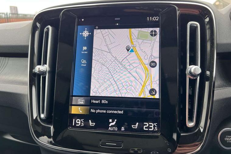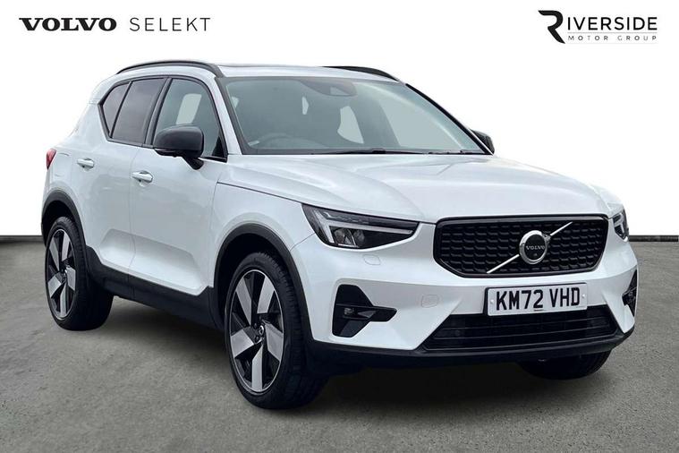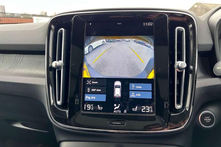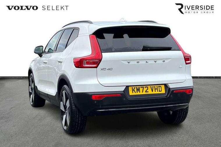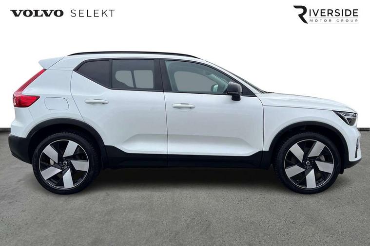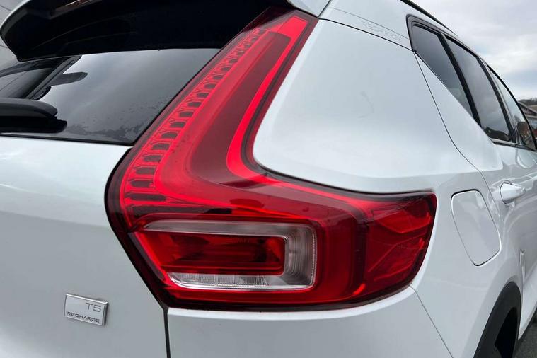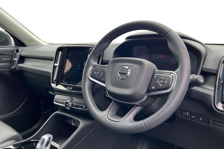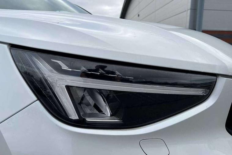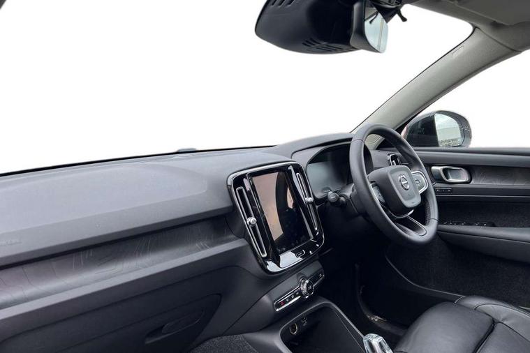 12.3" Active TFT crystal driver's instrument display, 360 degree surround view parking camera, 9" centre console portrait touch screen, Adjustable steering wheel force, Bluetooth hands free telephone kit, Drive mode selector, E-call, Front park assist, Hands free power tailgate, Lane keep assist with driver alert control, Oncoming Lane Mitigation, Rear park assist, Sensus navigation with European mapping and traffic information, Speed limiter, Speed sensitive steering, Voice activated control for key functions, Wireless Smartphone Integration includes Apple CarPlay and Android auto, Wireless/Inductive Mobile Phone Charging, 3.7 kW monophase on board charger, 7m 10amp charge cable with 3 pin plug and 7m 1 phase 16amp type 2/mode 3 charge cable, Dynamic chassis, Electric front axle drive, Recharging port located in nearside front wing, DAB Digital radio, Low speed exterior sound speaker, Premium Sound by Harman Kardon, Dolby Pro Logic II Surround Sound, Dirac Unsion, 12 speakers/600W and subwoofer, Steering wheel mounted remote controls, Active bending pixel LED headlights with adaptive shadow technology, Active high beam incorporating daytime running lights, Adaptive brake lights with high level LED brake lights, Auto dimming interior mirror, Automatic headlamp levelling, Dark tinted windows for rear door side windows and cargo compartment, Front and rear electric windows, Front recharge aluminium tread plates, Headlight cleaning system, High gloss black front and rear skid plate, High gloss black mesh front grille with high gloss black surround, High gloss black window trim, Home safe and approach lighting, Integrated roof rails in high gloss black, LED front fog lights, Power glass tilt and slide panoramic sunroof with sun curtain, Puddle lights, Rain sensor with automatic windscreen wiper activation, Rear side wing doors, Rear wiper, Roof antenna, Roof spoiler, Visible VIN plate, 12V socket in front tunnel console and cargo compartment, 2 zone electronic climate control with clear zone air quality system and pollen filter, 3 seat bench in 2nd row, 3 Spoke tailored steering wheel with chrome trim, 60/40 versatile split folding rear seat, A-pillar parking ticket holder, Ambient front door and instrumental panel lighting, C-pillar Recharge logo, Centre console cupholders and storage, Floor mats, Front door pocket and front cupholder illumination, Front footwell illumination, Front headrests, Front reading light and theatre lighting, Front seat cushion extensions, Front tunnel pocket, Glovebox bag hook, Heated front seats, Height adjustable passenger seat, Height/reach adjustable steering column, High gloss centre tunnel deco, Illuminated glovebox, Illuminated luggage compartment, Illuminated tailgate, Illuminated vanity mirrors, Isofix attachments on rear seats, Load protection net, Multi directional lumbar support, Power driver seat with memory + exterior mirrors memory, Power folding rear headrests, Power passenger seat, Rear armrest / integral cup holders / storage tray, Rear reading and courtesy lights, Single front passenger seat, Underfloor cargo storage, Climate pack without heated front seats - XC40, Driver assist pack - XC40, 3x3 point rear seatbelts, City safety includes pedestrian, cyclist and large animal detection and front collision warning with full auto brake, Drivers knee airbag, Dual stage driver/passenger airbags, Electronic parking brake with auto hold, First aid kit, Front and outer rear seatbelt reminder and pretensioners, Front seats SIPS airbags, Hill descent control, Hill start assist, Inflatable curtain, Passenger airbag cut-off device, Power child locks on rear doors, Road sign information display, Run off Road Mitigation, Run off Road Protection, SIPS (Side Impact Protection System), Slippery road and hazard light alert, Stability and Traction Control with Spin control, Engine Drag Control and Corner Traction Control, Tyre pressure monitoring system, Vehicle deceleration control with Anti-lock Brake System, Electronic Brake Distribution and Emergency Brake Assist, Warning triangle, WHIPS whiplash protection system - front, Anti-theft alarm including immobiliser/volume sensor + level sensor, Care key with user defined top speed, Key integrated remote control central locking + fuel flap with deadlocking system and auto open/close power windows, Keyless drive includes keyless entry and keyless start, Locking wheel nuts, Private locking for tailgate,