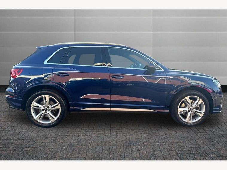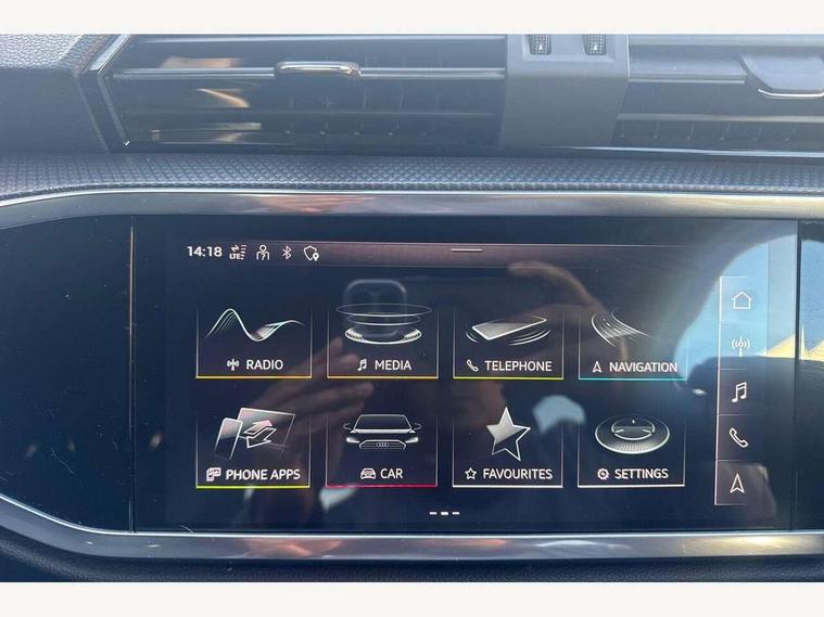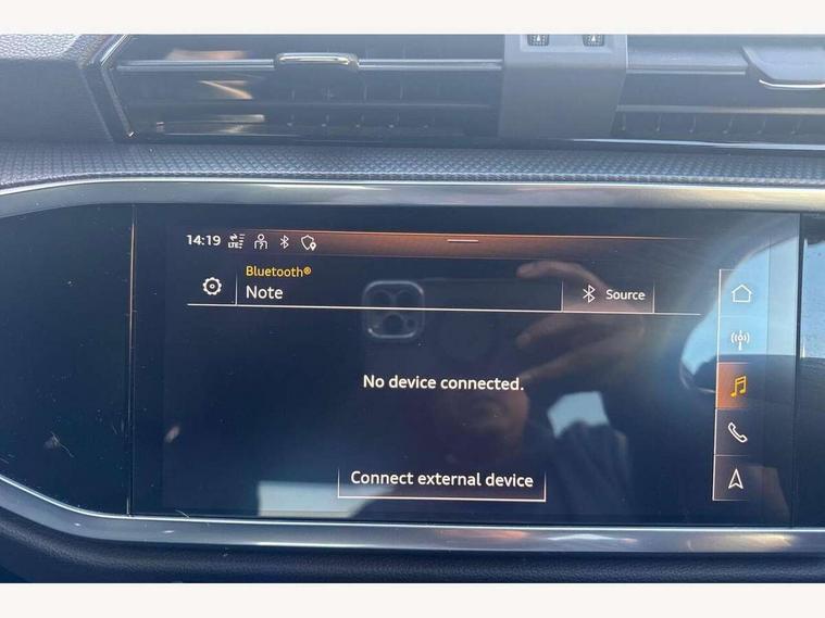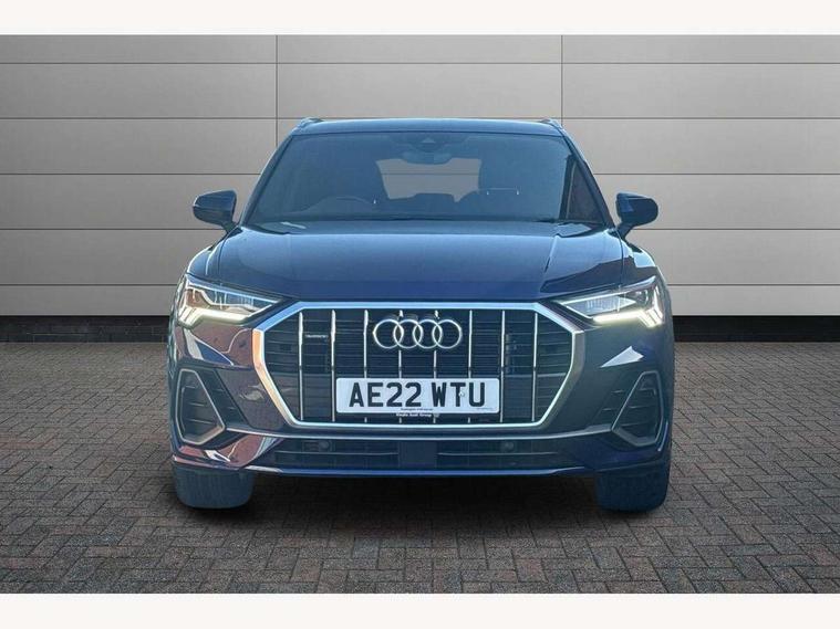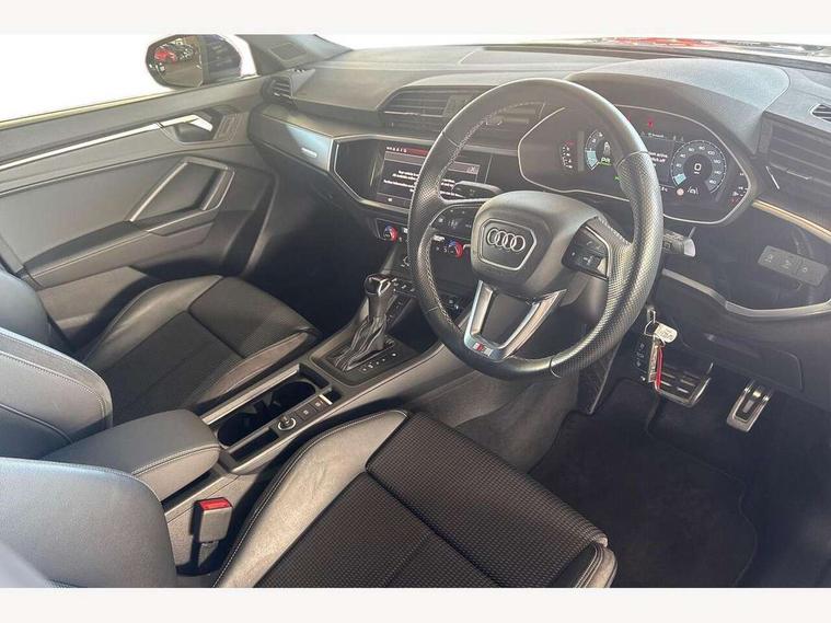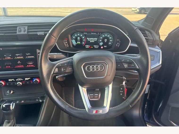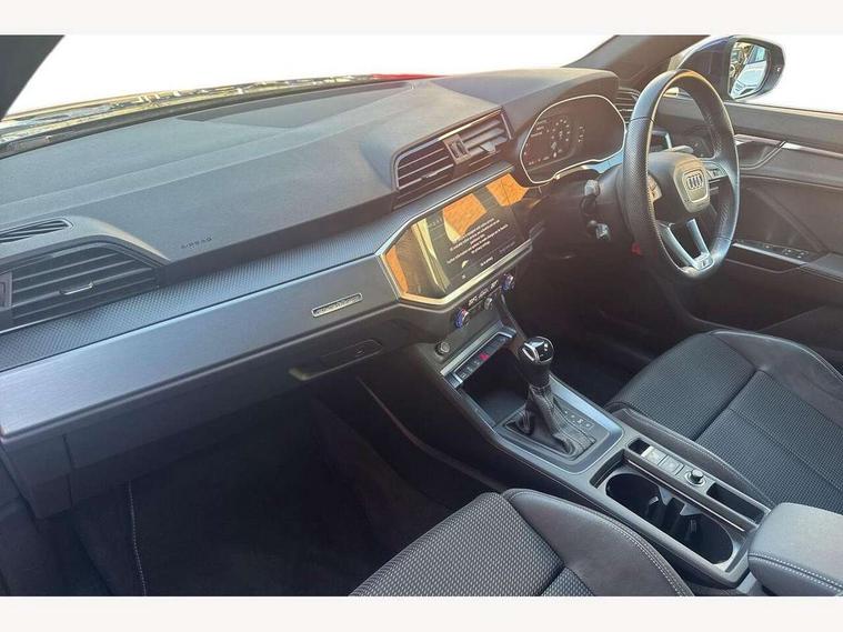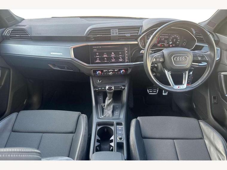 Amazon alexa Integration, Audi connect safety and service (e-call), Audi drive select, Audi lane departure warning, Audi Virtual Cockpit - 10.25" display, Bluetooth interface, Camera based traffic sign recognition, MMI Navigation Plus with high resolution 10.1 inch touchscreen colour display, Power operated tailgate, Progressive steering, Service interval indicator, Smartphone interface includes wireless Apple carplay/Android Auto, Start stop system with recuperation, Voice control system with natural language interaction, Sports suspension, 2 USB-C ports with charge and data functions, 6 passive loudspeakers, DAB digital radio module, Acoustic windscreen, Aluminium roof rails, Aluminium window trim, Auto dimming frameless rear view mirror, Body coloured bumpers, Electrically folding, adjustable and heated door mirrors with integrated LED side indicators and kerb view function for passenger side, Front and rear electric windows, Front fog lights, Front side air inlets in matt platinum grey, Front spoiler blade in matt platinum grey, Grille vertical bars in aluminium silver/Matt, High gloss black finish B and C pillars, LED headlights with LED daytime running lights, LED rear lights, LED third brake light, Privacy glass dark tinted rear and rear-side windows (from B-pillar backwards), Rain and light sensors, Rear diffuser strip in matt titanium black, Rear side wing doors, Rear wiper, S line badges on front wings, S Line front and rear bumpers, Side skirt insert in matt Platinium grey, Silver chrome grille surround, Tinted rear windows, Titanium black radiator grille, Variable front intermittent wipers, 12V socket in rear centre console, 3 seat bench in 2nd row, 40:20:40 folding with manual adjustment for 60:40 forwards/backwards position and backrest angle, Adjustable rear seat bench/backrest with centre armrest and cupholder, Black cloth headlining, Dual zone electronic climate control, Front and rear black floor mats with contrast stitching in rock grey, Front and rear headrests, Front and rear roof module including reading lights, Front centre armrest, Glove compartment lighting, Height and reach adjustable steering wheel, Illuminated door sill trims with S logo, ISOFIX child seat mounting for front passenger with airbag deactivation and outer rear seat including top tether attachment point for outer rear seats, Luggage compartment light, Manual front seats with height adjustment, Perforated leather gearknob, Single front passenger seat, Stainless steel luggage compartment sill finisher, Stainless steel pedals, Non smoking pack - Q3, 3x3 point rear seatbelts, 6 airbags - Driver, front passenger, curtain and side windows, Audi pre-sense front with pedestrain and cyclist recognition, Electrically operated child locks on rear doors, Electromechanical parking brake, Electronic stabilisation control including ABS, ASR and EDL, Front seatbelt reminder, Hill descent control, Hill hold assist, Pre sense basic, Seatbelt monitoring, Tyre pressure warning, Warning triangle and first aid kit, Anti theft alarm, Anti theft wheel bolts, Immobiliser, Remote central locking, Dark matt brushed aluminium inlay, Detail dashboard around MMI touch colour display in glass look, black with surround in aluminium look, Leatherette door armrest,