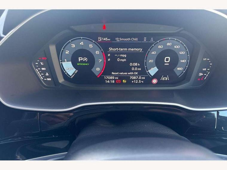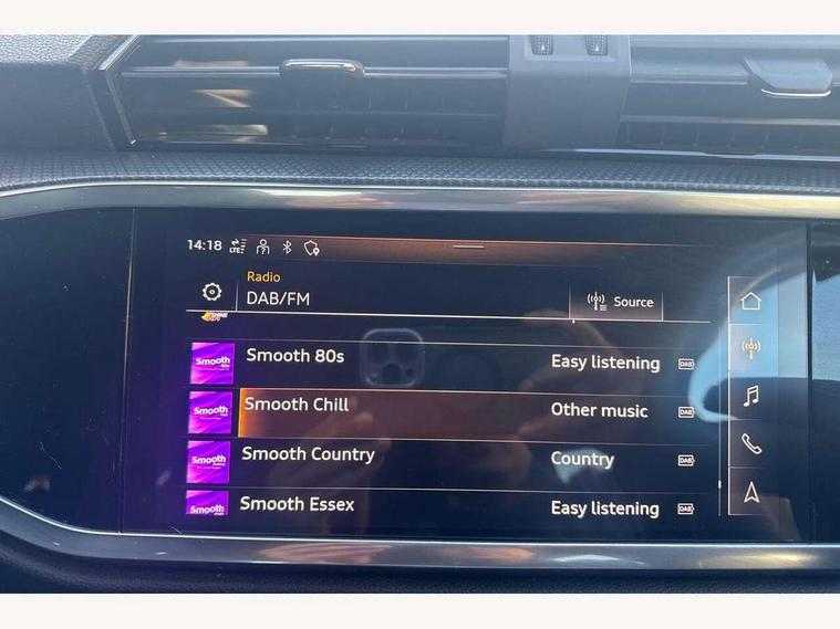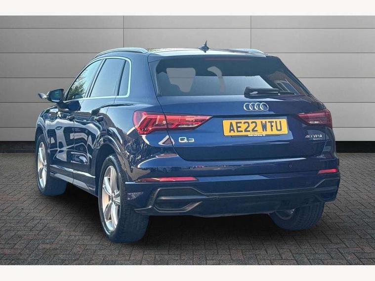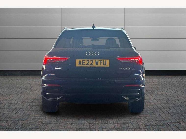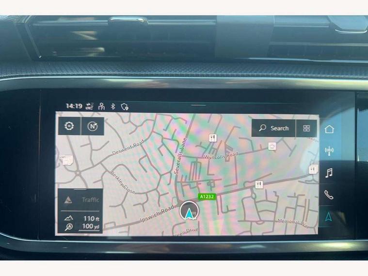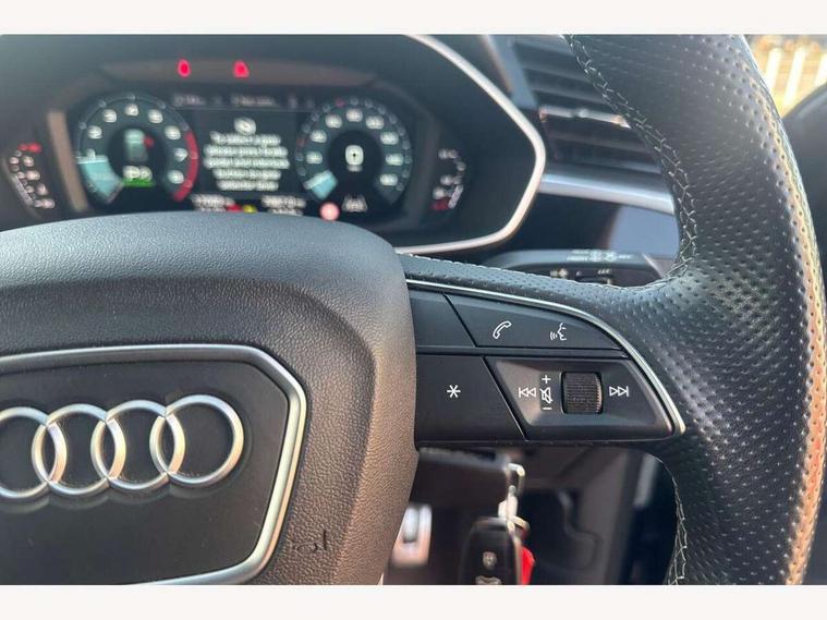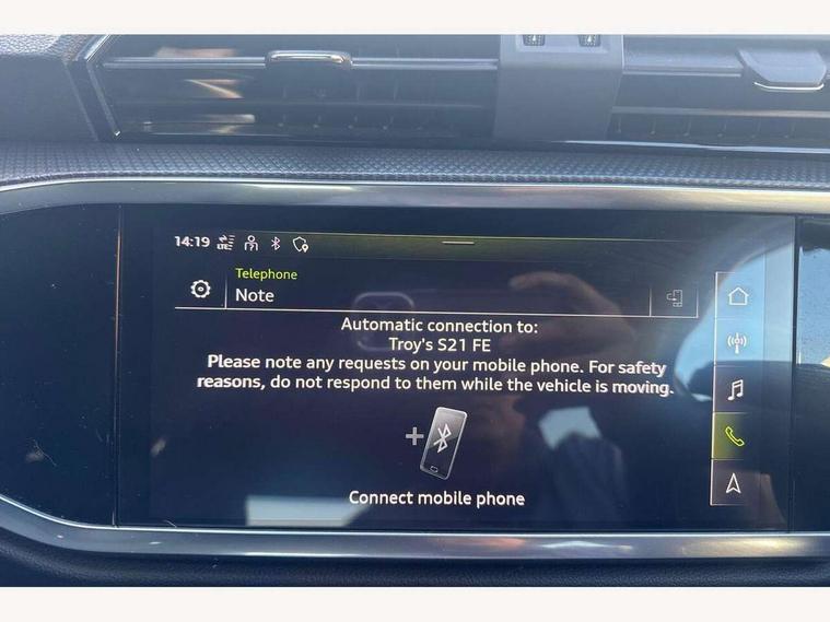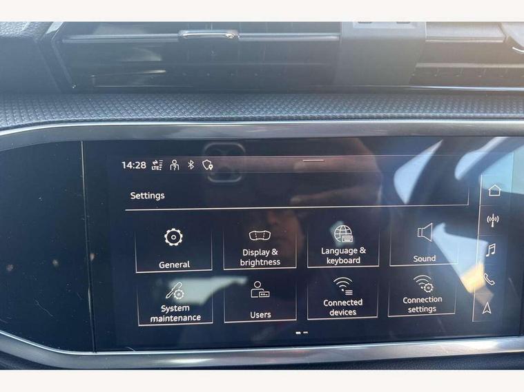 Amazon alexa Integration, Audi connect safety and service (e-call), Audi drive select, Audi lane departure warning, Audi Virtual Cockpit - 10.25" display, Bluetooth interface, Camera based traffic sign recognition, MMI Navigation Plus with high resolution 10.1 inch touchscreen colour display, Power operated tailgate, Progressive steering, Service interval indicator, Smartphone interface includes wireless Apple carplay/Android Auto, Start stop system with recuperation, Voice control system with natural language interaction, Sports suspension, 2 USB-C ports with charge and data functions, 6 passive loudspeakers, DAB digital radio module, Acoustic windscreen, Aluminium roof rails, Aluminium window trim, Auto dimming frameless rear view mirror, Body coloured bumpers, Electrically folding, adjustable and heated door mirrors with integrated LED side indicators and kerb view function for passenger side, Front and rear electric windows, Front fog lights, Front side air inlets in matt platinum grey, Front spoiler blade in matt platinum grey, Grille vertical bars in aluminium silver/Matt, High gloss black finish B and C pillars, LED headlights with LED daytime running lights, LED rear lights, LED third brake light, Privacy glass dark tinted rear and rear-side windows (from B-pillar backwards), Rain and light sensors, Rear diffuser strip in matt titanium black, Rear side wing doors, Rear wiper, S line badges on front wings, S Line front and rear bumpers, Side skirt insert in matt Platinium grey, Silver chrome grille surround, Tinted rear windows, Titanium black radiator grille, Variable front intermittent wipers, 12V socket in rear centre console, 3 seat bench in 2nd row, 40:20:40 folding with manual adjustment for 60:40 forwards/backwards position and backrest angle, Adjustable rear seat bench/backrest with centre armrest and cupholder, Black cloth headlining, Dual zone electronic climate control, Front and rear black floor mats with contrast stitching in rock grey, Front and rear headrests, Front and rear roof module including reading lights, Front centre armrest, Glove compartment lighting, Height and reach adjustable steering wheel, Illuminated door sill trims with S logo, ISOFIX child seat mounting for front passenger with airbag deactivation and outer rear seat including top tether attachment point for outer rear seats, Luggage compartment light, Manual front seats with height adjustment, Perforated leather gearknob, Single front passenger seat, Stainless steel luggage compartment sill finisher, Stainless steel pedals, Non smoking pack - Q3, 3x3 point rear seatbelts, 6 airbags - Driver, front passenger, curtain and side windows, Audi pre-sense front with pedestrain and cyclist recognition, Electrically operated child locks on rear doors, Electromechanical parking brake, Electronic stabilisation control including ABS, ASR and EDL, Front seatbelt reminder, Hill descent control, Hill hold assist, Pre sense basic, Seatbelt monitoring, Tyre pressure warning, Warning triangle and first aid kit, Anti theft alarm, Anti theft wheel bolts, Immobiliser, Remote central locking, Dark matt brushed aluminium inlay, Detail dashboard around MMI touch colour display in glass look, black with surround in aluminium look, Leatherette door armrest,