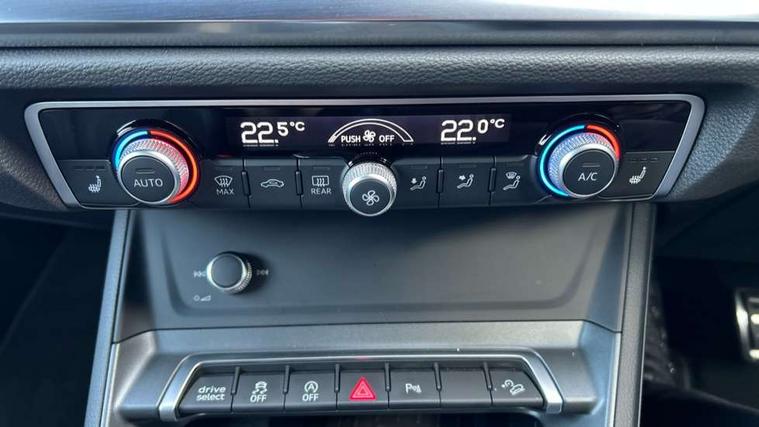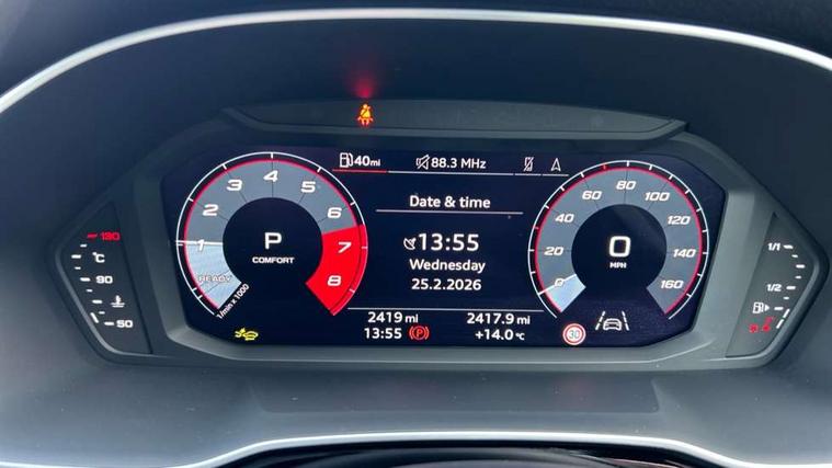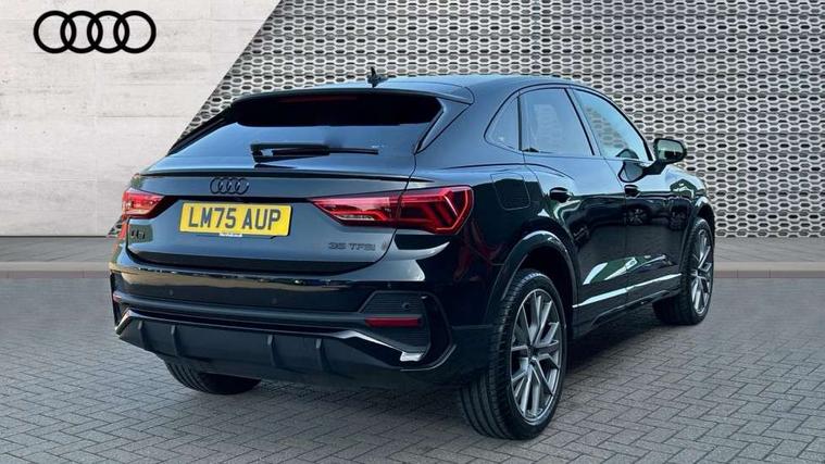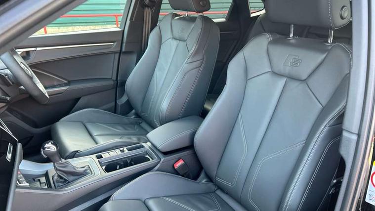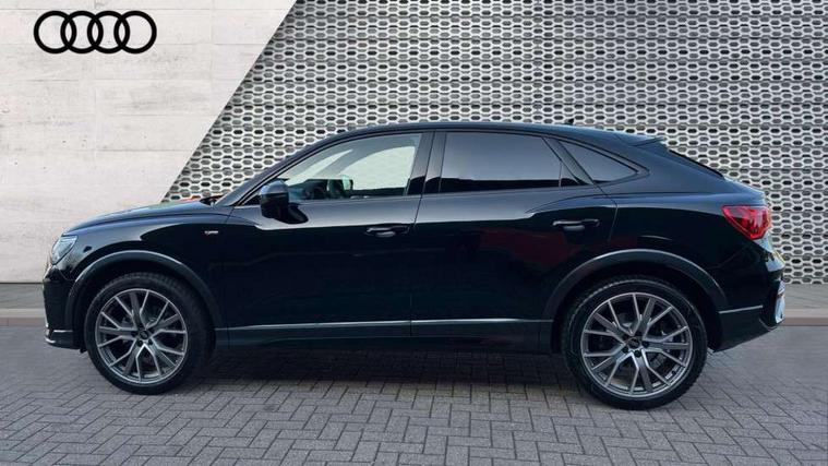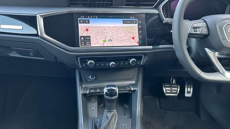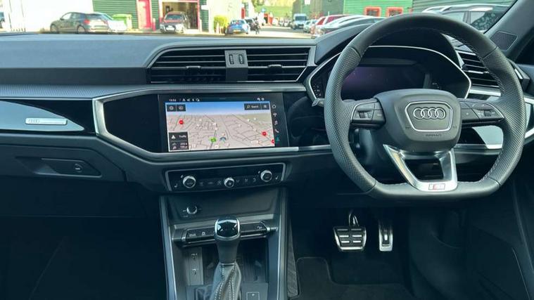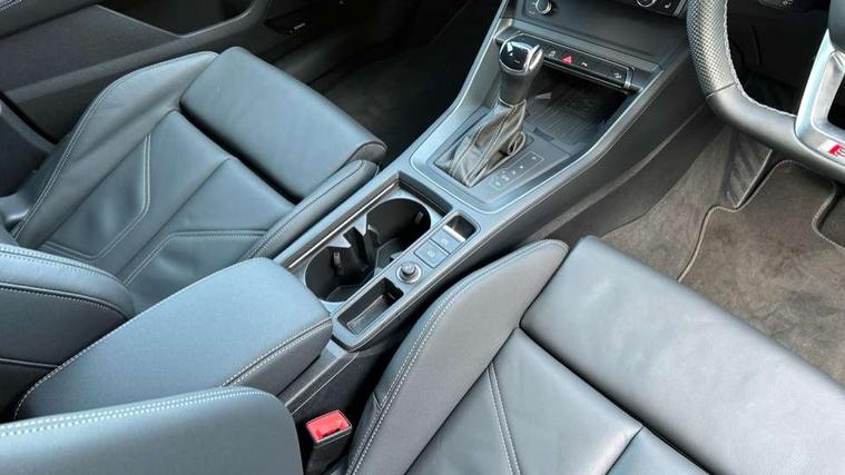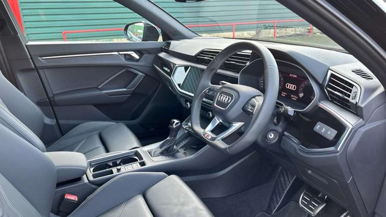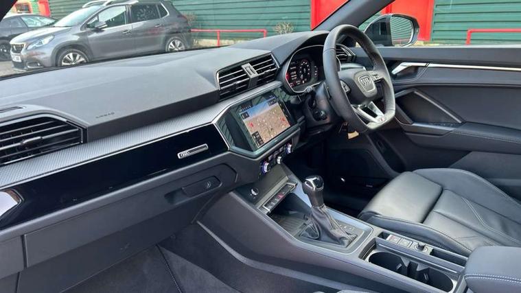 Audi connect safety and service, Audi drive select, Audi lane departure warning, Audi Virtual Cockpit - 10.25" display, Bluetooth interface, Camera based traffic sign recognition, Distraction and Fatigue warning, Legal emergency call, MMI Navigation Plus with high resolution 10.1 inch touchscreen colour display, Power operated tailgate, Progressive steering, Service interval indicator, Smartphone interface includes wireless Apple carplay/Android Auto, Start stop system with recuperation, Voice control system with natural language interaction, Sports suspension, 2 USB-C ports with charge and data functions, 6 passive loudspeakers, DAB digital radio module, Acoustic windscreen, Audi Beam uses LEDs to project the Audi logo onto the ground as you exit your Q3, Auto dimming door mirrors, Auto dimming frameless rear view mirror, Electrically folding, adjustable and heated door mirrors with integrated LED side indicators and kerb view function for passenger side, Front and rear electric windows, Front fog lights, Front underbody protection in manhattan grey paint finish, High gloss black finish B and C pillars, Honeycomb design radiator grille in matt anthracite black, LED Dynamic rear indicators, LED headlights with LED daytime running lights, LED rear lights, LED third brake light, Privacy glass dark tinted rear and rear-side windows (from B-pillar backwards), Rain and light sensors, Rear diffuser grille in grained matt black, Rear diffuser strip in matt anthracite black, Rear side wing doors, Rear underbody protection in matt black, Rear wiper, S line front and rear bumpers and side skirts in contrasting Manhattan grey paint finish, Variable front intermittent wipers, 12V socket in rear centre console, 3 seat bench in 2nd row, 40:20:40 folding with manual adjustment for 60:40 forwards/backwards position and backrest angle, Adjustable rear seat bench/backrest with centre armrest and cupholder, Black carpet mats, Black cloth headlining, Dual zone electronic climate control, Electric lumbar support, Front and rear black floor mats with contrast stitching in rock grey, Front and rear headrests, Front centre armrest, Height and reach adjustable steering wheel, Illuminated door sill trims with S logo, ISOFIX child seat mounting for front passenger with airbag deactivation and outer rear seat including top tether attachment point for outer rear seats, Luggage compartment sill protection in stainless steel, Manual front seats with height adjustment, Perforated leather gearknob, Single front passenger seat, Stainless steel pedals, Twin leather upholstery with front sport seats + S embossing, Black styling pack - Q3, Non smoking pack - Q3, 3x3 point rear seatbelts, 6 airbags - Driver, front passenger, curtain and side windows, Audi pre-sense front with pedestrain and cyclist recognition, Electrically operated child locks on rear doors, Electromechanical parking brake, Electronic stabilisation control including ABS, ASR and EDL, Front seatbelt reminder, Hill descent control, Hill hold assist, Pre sense basic, Seatbelt monitoring, Tyre pressure warning, Warning triangle and first aid kit, Anti theft wheel bolts, Immobiliser, Remote central locking, Thatcham approved category 1 anti theft alarm, Aluminium look interior elements, Detail dashboard around MMI touch colour display in glass look, black with surround in aluminium look, Leatherette door armrest, Piano black inlay,