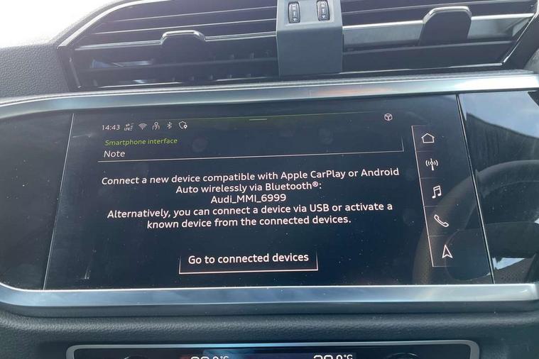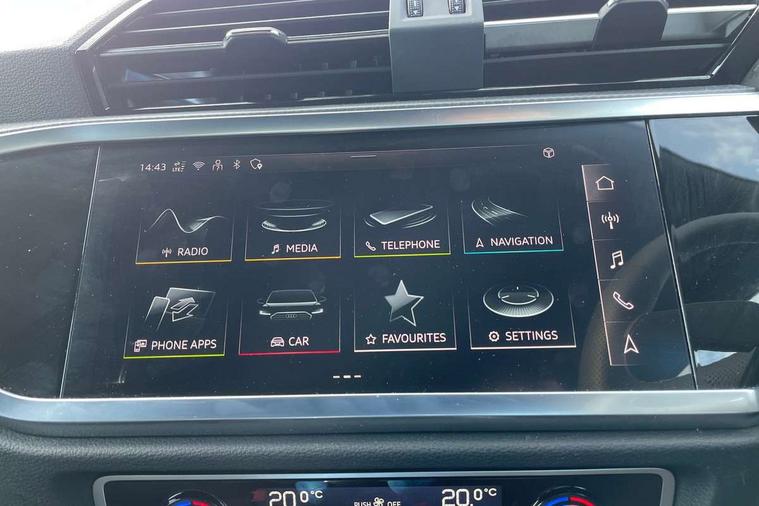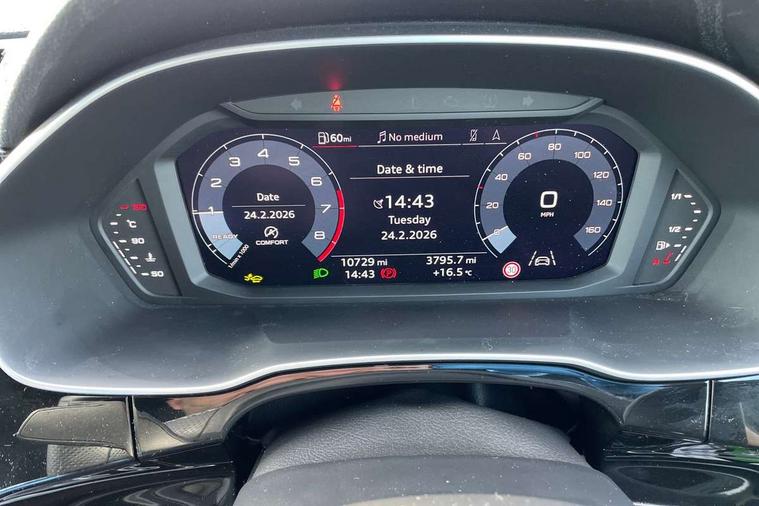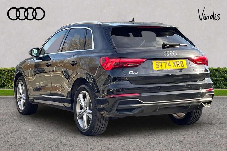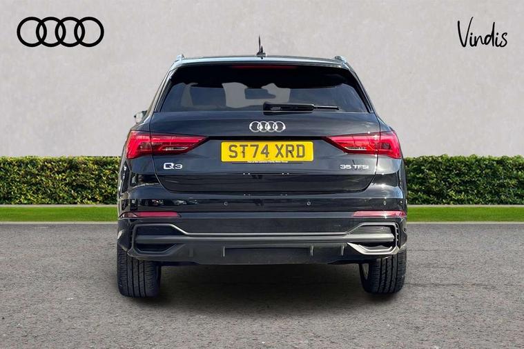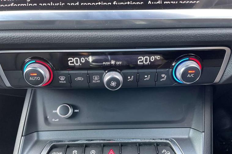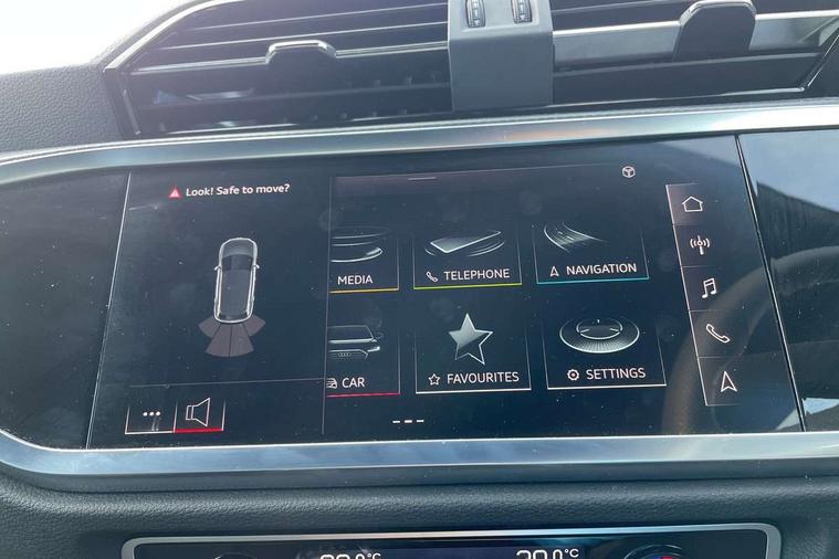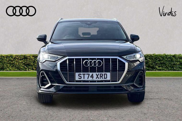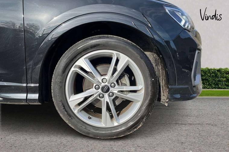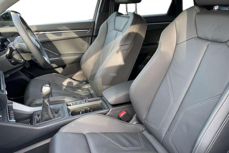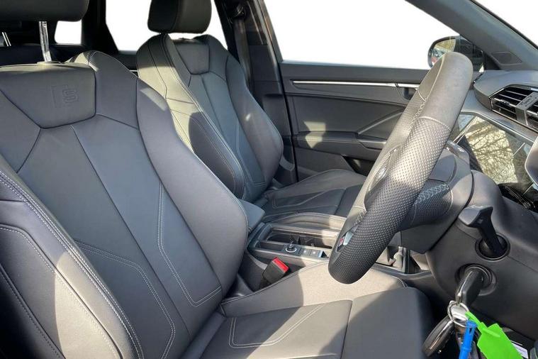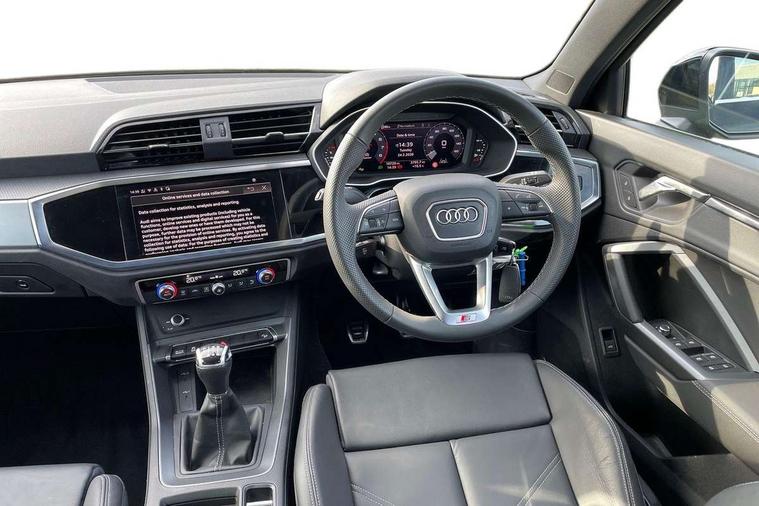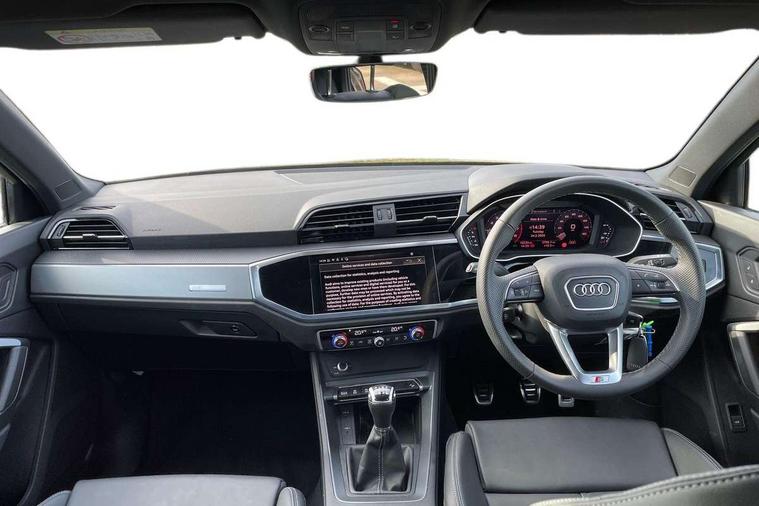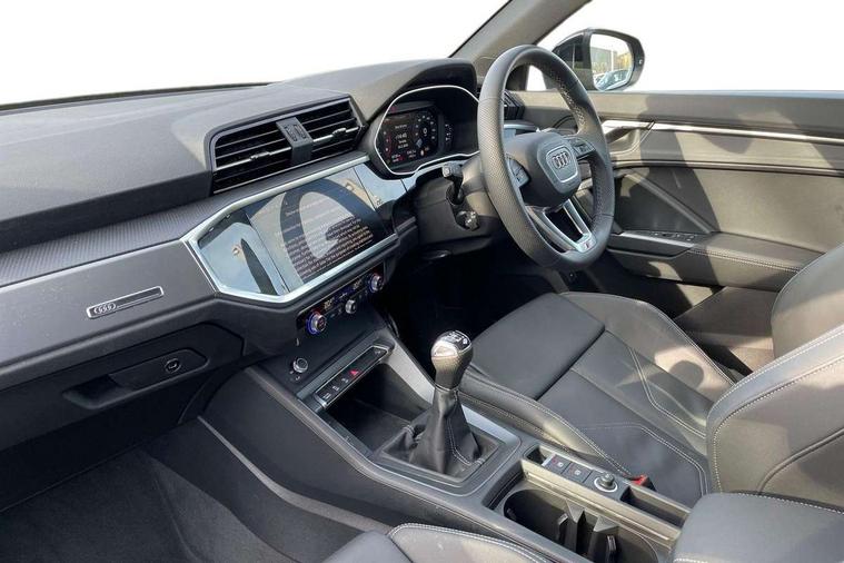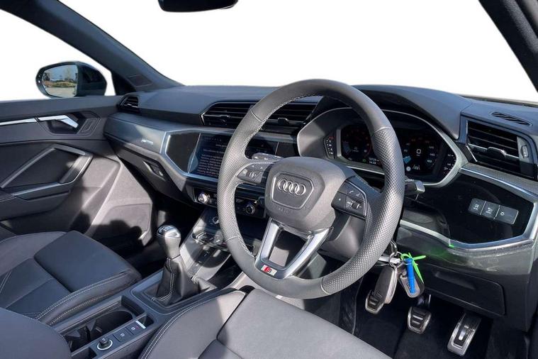 Amazon alexa Integration, Audi connect safety and service, Audi drive select, Audi lane departure warning, Audi Virtual Cockpit - 10.25" display, Bluetooth interface, Camera based traffic sign recognition, Cruise control + speed limiter, Distraction and Fatigue warning, Legal emergency call, MMI Navigation Plus with high resolution 10.1 inch touchscreen colour display, Power operated tailgate, Progressive steering, Rear parking sensors, Service interval indicator, Smartphone interface includes wireless Apple carplay/Android Auto, Start stop system with recuperation, Voice control system with natural language interaction, Sports suspension, 2 USB-C ports with charge and data functions, 6 passive loudspeakers, DAB digital radio module, Acoustic windscreen, Aluminium roof rails, Aluminium window trim, Anthracite black radiator grille, Auto dimming door mirrors, Auto dimming frameless rear view mirror, Body colour front spoiler blade, Electrically folding, adjustable and heated door mirrors with integrated LED side indicators and kerb view function for passenger side, Front and rear electric windows, Front fog lights, Front side air inlets in matt platinum grey, Grille vertical bars in aluminium silver/Matt, High gloss black finish B and C pillars, LED Dynamic rear indicators, LED headlights with LED daytime running lights, LED rear lights, LED third brake light, Privacy glass dark tinted rear and rear-side windows (from B-pillar backwards), Rain and light sensors, Rear diffuser grille in grained matt black, Rear diffuser strip in matt anthracite black, Rear side wing doors, Rear wiper, S line badges on front wings, S line front and rear bumpers and side skirts in contrasting Manhattan grey paint finish, Side skirt insert in matt Platinium grey, Variable front intermittent wipers, 12V socket in rear centre console, 3 seat bench in 2nd row, 3 spoke leather multifunction steering wheel features S badging and grips in perforated leather with contrast stitching, 40:20:40 folding with manual adjustment for 60:40 forwards/backwards position and backrest angle, Adjustable rear seat bench/backrest with centre armrest and cupholder, Black cloth headlining, Dual zone electronic climate control, Electric lumbar support, Front and rear black floor mats with contrast stitching in rock grey, Front and rear headrests, Front centre armrest, Height and reach adjustable steering wheel, Illuminated door sill trims with S logo, ISOFIX child seat mounting for front passenger with airbag deactivation and outer rear seat including top tether attachment point for outer rear seats, Manual front seats with height adjustment, Perforated leather gearknob, Single front passenger seat, Stainless steel luggage compartment sill finisher, Stainless steel pedals, Twin leather upholstery with front sport seats + S embossing, Non smoking pack - Q3, 3x3 point rear seatbelts, 6 airbags - Driver, front passenger, curtain and side windows, Audi pre-sense front with pedestrain and cyclist recognition, Electrically operated child locks on rear doors, Electromechanical parking brake, Electronic stabilisation control including ABS, ASR and EDL, Front seatbelt reminder, Hill descent control, Hill hold assist, Pre sense basic, Seatbelt monitoring, Tyre pressure warning, Warning triangle and first aid kit, Anti theft alarm, Anti theft wheel bolts, Immobiliser, Remote central locking, Aluminium look interior elements, Dark matt brushed aluminium inlay, Detail dashboard around MMI touch colour display in glass look, black with surround in aluminium look, Leatherette door armrest,