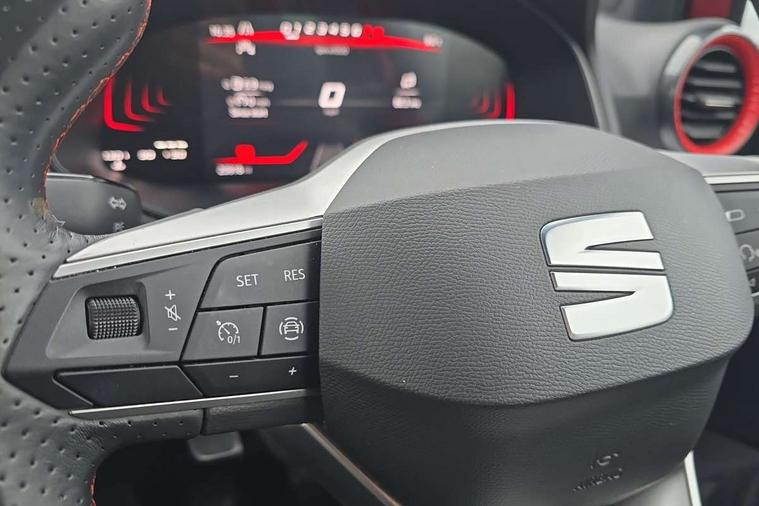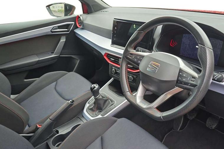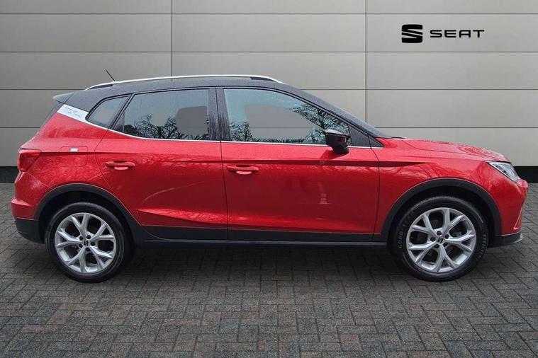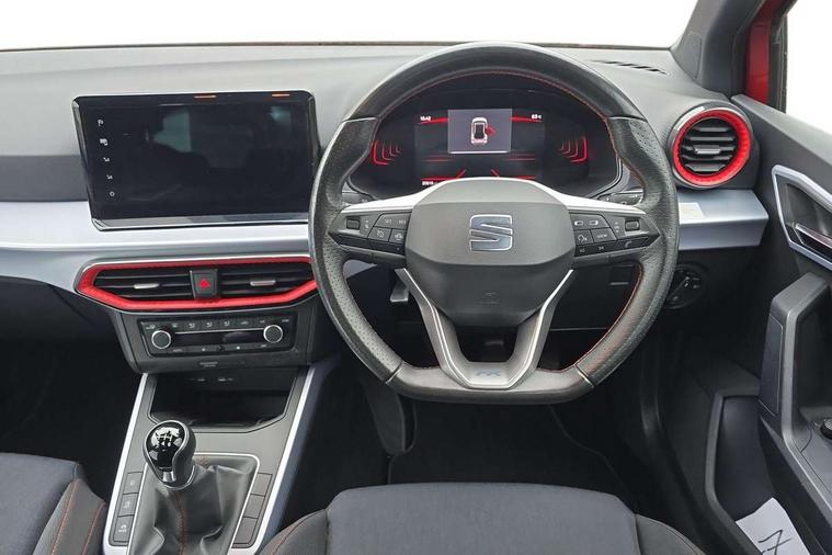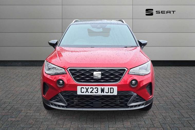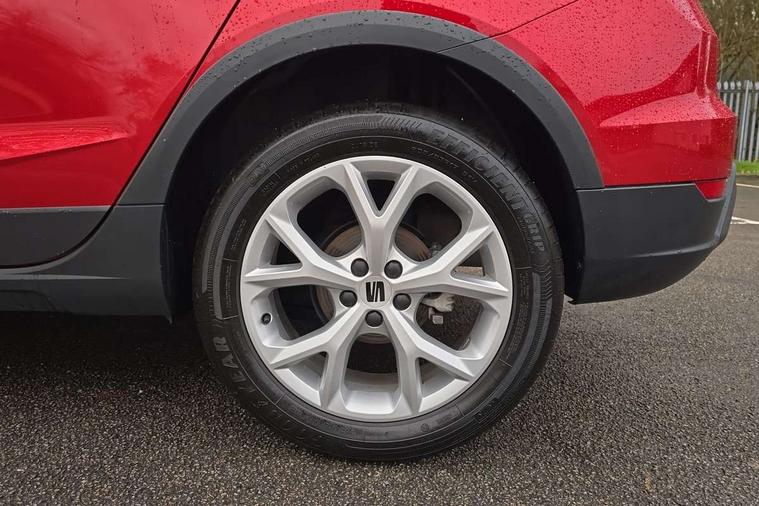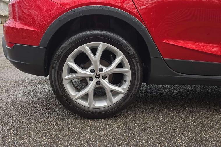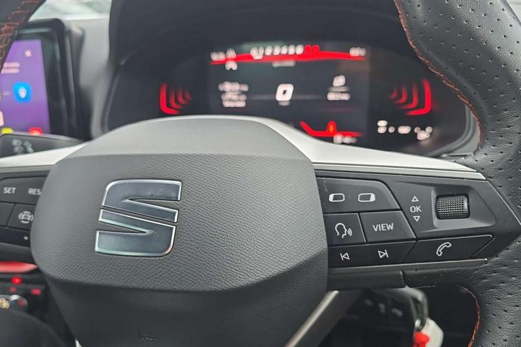 'Lights On' Reminder warning buzzer, 8" Digital cockpit, Digital clock, E-call, Electric speed sensitive power steering, Full Link Smartphone Integration with Mirror Link, Apple Car Play, Google Android Auto with USB Type C cable for Apple and Android compatibility, Lane keeping system, Low fuel warning light, Outside temperature display, Rear parking sensor, RPM counter, Seat connect with safety, service, remote and online, SEAT Drive profile - Four different models normal-sport-eco-individual, steering response, throttle response, Trip computer, Wireless phone charger, 9.2" colour touchscreen with navigation system, voice control and USB port (type c), Bluetooth interface for hands free and audio streaming, DAB digital radio and AM/FM radio, Steering wheel mounted audio controls, Anti theft roof antenna, Auto dimming interior rear view mirror, Automatic activation of hazard warning lights, Body coloured bumpers, Body coloured door handle inserts, Chrome roof rails and window surrounds, Dark tinted rear windows, Electric front/rear windows, Electrically adjustable, heated and folding door mirrors, Front fog lights with cornering function and rear fog light, FULL LED automatic headlights with dynamic headlight range control, coming and leaving home, LED daytime running lights, LED rear tail lights and licence plate lights, Protective side mouldings, Rain sensing wipers, Rear side wing doors, Rear spoiler, Rear window wash/wipe, Roof colour door mirrors, Third brake light, Twin exhaust pipe styling hidden exhaust pipe, Visible VIN plate, Windshield wiper with intermittent control and potentiometer, 2 cupholders, 3 seat bench in 2nd row, 60/40 split folding rear seat, Aircare filter, Black interior roof, Cloth upholstery, Double boot floor, Driver sunvisor with covered mirror + card holder, Dual zone climate control, Front courtesy light with 2x front and 2x rear reading lights, Front sport seats, Gear shift indicator, Height adjustable front seats, Height/reach adjustable steering column, Illuminated boot, Instrument lighting with brightness control, Interior ambient lighting, Interior light in footwell, central console and door panel, ISOFIX points in outer rear seats with top tether anchorage points, Passenger sunvisor with vanity mirror, Perforated flat bottomed leather steering wheel/gear knob/handbrake with red stitching and FR logo, Single front passenger seat, Two front and three rear height adjustable headrests, Interior chrome pack - Arona, 3 point seatbelts on all rear seats, ABS, Active front headrests, Child locks on rear doors, Driver and front passenger airbags with front passenger airbag de activation, front side and curtain airbags, Electronic stability control, Emergency Brake Assist (EBA) and front assist, Front and rear seatbelt reminder, Hill hold control, Multi-Collision braking, Tiredness recognition system, Traction control, Tyre pressure monitoring system, Alarm with back-up horn, Electronic engine immobiliser, Locking wheel bolts, Remote central locking + deadlocks, Tow away protection, Titan black dashboard, 17" Dynamic alloy wheels,