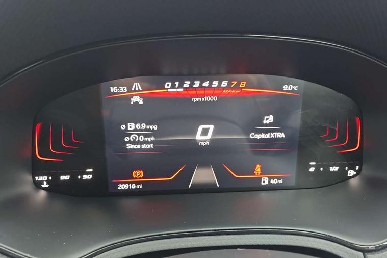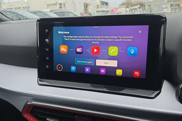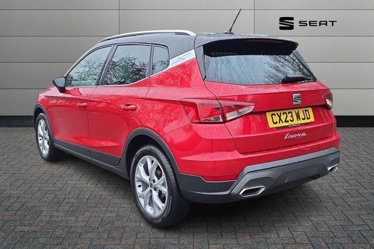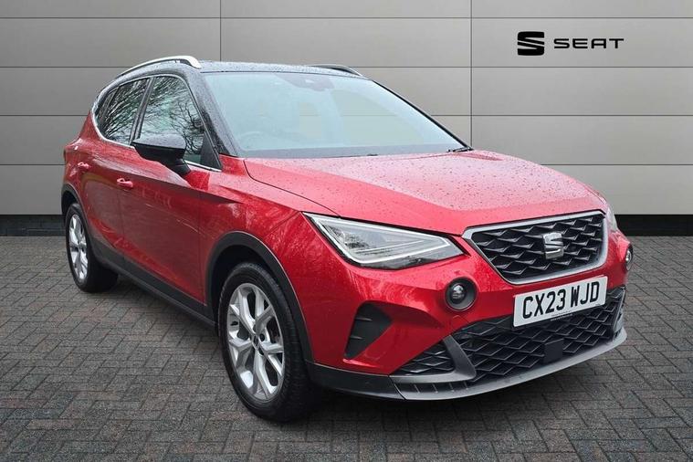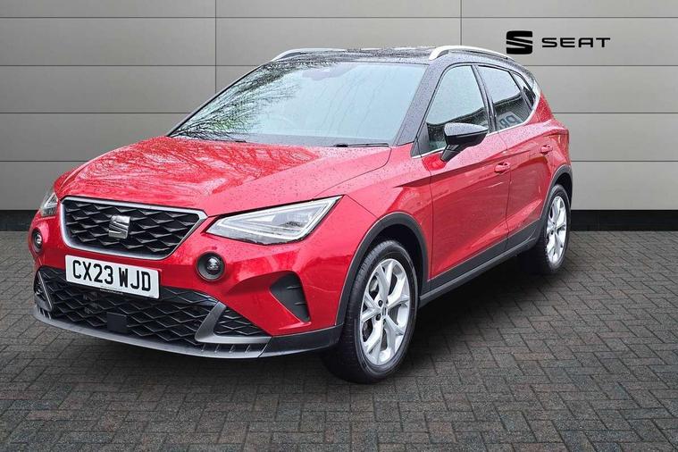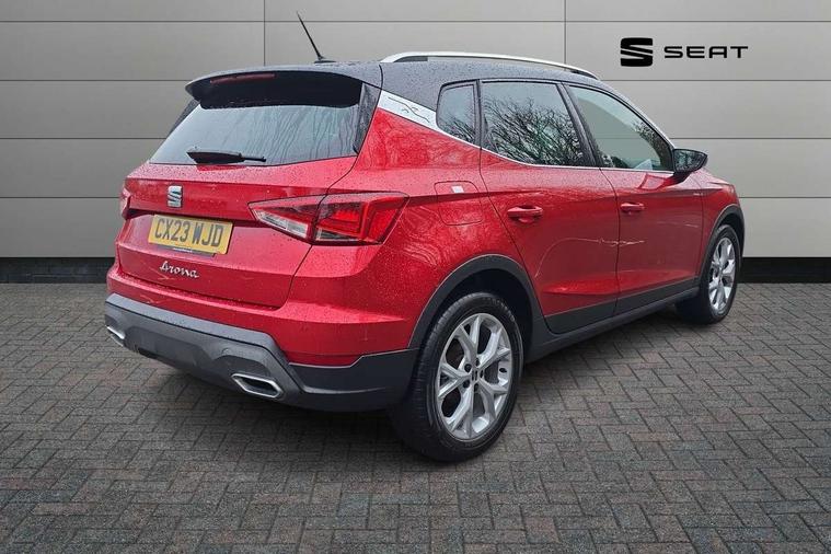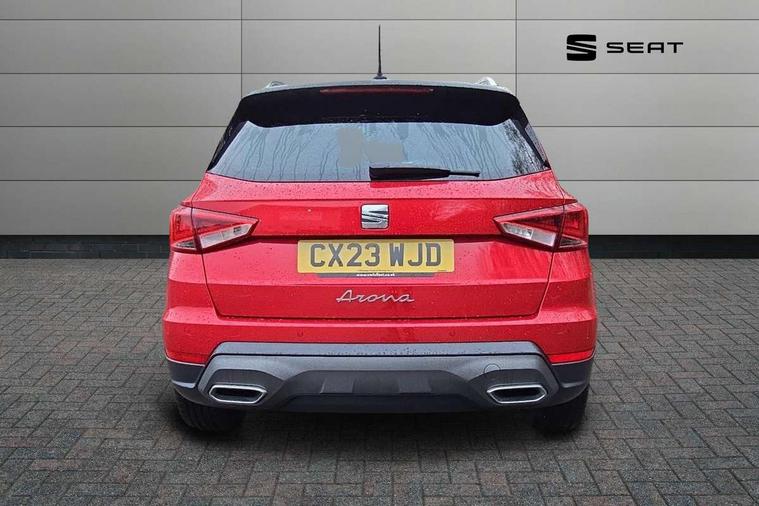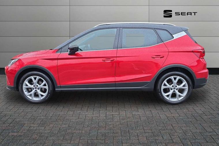 'Lights On' Reminder warning buzzer, 8" Digital cockpit, Digital clock, E-call, Electric speed sensitive power steering, Full Link Smartphone Integration with Mirror Link, Apple Car Play, Google Android Auto with USB Type C cable for Apple and Android compatibility, Lane keeping system, Low fuel warning light, Outside temperature display, Rear parking sensor, RPM counter, Seat connect with safety, service, remote and online, SEAT Drive profile - Four different models normal-sport-eco-individual, steering response, throttle response, Trip computer, Wireless phone charger, 9.2" colour touchscreen with navigation system, voice control and USB port (type c), Bluetooth interface for hands free and audio streaming, DAB digital radio and AM/FM radio, Steering wheel mounted audio controls, Anti theft roof antenna, Auto dimming interior rear view mirror, Automatic activation of hazard warning lights, Body coloured bumpers, Body coloured door handle inserts, Chrome roof rails and window surrounds, Dark tinted rear windows, Electric front/rear windows, Electrically adjustable, heated and folding door mirrors, Front fog lights with cornering function and rear fog light, FULL LED automatic headlights with dynamic headlight range control, coming and leaving home, LED daytime running lights, LED rear tail lights and licence plate lights, Protective side mouldings, Rain sensing wipers, Rear side wing doors, Rear spoiler, Rear window wash/wipe, Roof colour door mirrors, Third brake light, Twin exhaust pipe styling hidden exhaust pipe, Visible VIN plate, Windshield wiper with intermittent control and potentiometer, 2 cupholders, 3 seat bench in 2nd row, 60/40 split folding rear seat, Aircare filter, Black interior roof, Cloth upholstery, Double boot floor, Driver sunvisor with covered mirror + card holder, Dual zone climate control, Front courtesy light with 2x front and 2x rear reading lights, Front sport seats, Gear shift indicator, Height adjustable front seats, Height/reach adjustable steering column, Illuminated boot, Instrument lighting with brightness control, Interior ambient lighting, Interior light in footwell, central console and door panel, ISOFIX points in outer rear seats with top tether anchorage points, Passenger sunvisor with vanity mirror, Perforated flat bottomed leather steering wheel/gear knob/handbrake with red stitching and FR logo, Single front passenger seat, Two front and three rear height adjustable headrests, Interior chrome pack - Arona, 3 point seatbelts on all rear seats, ABS, Active front headrests, Child locks on rear doors, Driver and front passenger airbags with front passenger airbag de activation, front side and curtain airbags, Electronic stability control, Emergency Brake Assist (EBA) and front assist, Front and rear seatbelt reminder, Hill hold control, Multi-Collision braking, Tiredness recognition system, Traction control, Tyre pressure monitoring system, Alarm with back-up horn, Electronic engine immobiliser, Locking wheel bolts, Remote central locking + deadlocks, Tow away protection, Titan black dashboard, 17" Dynamic alloy wheels,