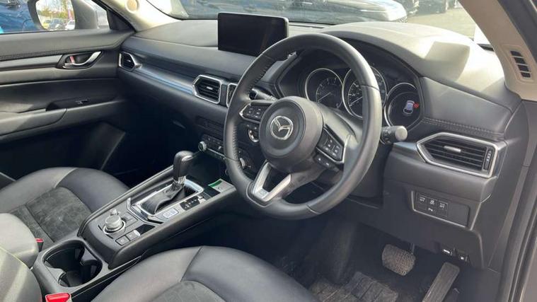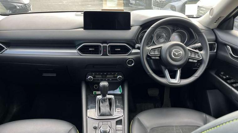 10.25" display with Mazda Connect infotainment, Advanced blind spot monitoring, Apple car play/Android Auto, Bluetooth connectivity with voice control, Collision prevention assist, Connected services, Cruising Traffic Support, Drive mode selector, Electric power steering, Emergency stop signalling system, Engine start/stop button, Forward collision warning, Front and rear parking sensors, High meter TFT display, Integrated navigation system, Intelligent speed assist, Lane departure warning system, Lane keep assist, Radar cruise control with Stop and Go, Service indicator, Trip computer, i-stop, 2 USB sockets in rear, 2x USB sockets in front, 6 speakers, AM/FM radio, Bluetooth audio streaming, DAB Digital radio, Multimedia Commander including separate volume dial, Steering wheel mounted audio controls, Adaptive front lighting system, Auto dimming rear view mirror, Automatic headlights, Black mirror caps, Body colour roof spoiler, Body coloured front and rear black lower bumper mouldings, Bright finish signature wing, Coming/leaving home lighting function, Door mirror integrated indicators, Dual chrome tailpipes, Dusk sensitive headlamps, Electric front/rear windows with one touch auto up/down, Front and rear silver under garnish and side skirt, Front and rear silver under guard and side garnish, Front grille in material black finish, High beam assist, Intermittent rear wash/wipe, LED auto levelling, LED daytime running lights, LED front fog lights, LED Headlights, LED third brake light, Lime green air vent louvre inlay dashboard panel, Lime green front grille accent color, Louver bezel inner lime green accent, Power folding and heated door mirrors, Privacy glass (rear side windows only), Rain sensing front wipers, Rear side wing doors, Satin black B and C pillars, Satin black side mouldings, Scuff plates, Shark fin antenna, Signature LED rear combination lights, Vinyl with lime green door trim panel, 12v electrical power outlet, 3 seat bench in 2nd row, 3 stage heated front seats, 40:20:40 Karakuri fold-flat seat system, 6 way power adjustable driver seat, Driver seat lumbar adjustment, Driver seat power slide, recline and height adjustment, Driver, Front passenger and two rear grab handles with coat hooks, Driver/passenger front seatback pockets, Driver/passenger sunvisors + illuminated vanity mirrors (drivers with ticket holder), Dual zone climate control, Folding centre armrest with 2 cup holders, Front and rear door pockets, Front centre storage with two cupholders, Front passenger seat manual slide, recline and height adjust, Height adjustable passenger seat, Humidity sensor, Illuminated glovebox, Interior dome light with integral spotlight, ISOFIX child seat anchorage points attached on outer rear seats, Karakuri tonneau cover, Leather wrapped steering wheel and gear knob, Leatherette door trim, Leatherette/suede upholstery, Light roof lining, Luggage compartment LED lighting, Luggage compartment power outlet, Rear air vents, Rear headrests, Rear seat recline, Reversible waterproof cargo board, Roof mounted sunglasses holder, Single front passenger seat, Three height adjustable head restraints, Tilt/height adjustable steering wheel, White interior LED illumination lighting, 3 point front seatbelts with pre-tensioners, 3 rear 3 point seatbelts, ABS, Advanced Smart City Brake Support - SCBS, Child locks on rear doors, Driver and front passenger side airbags, DSTC-Dynamic Stability and Traction Control, Dual front airbags, Electronic brake force distribution, Electronic parking brake with auto hold, ESP, Front and rear curtain airbags, Front passenger airbag deactivation, G-Vectoring control, Hill hold assist, Seatbelt reminder front and rear, Single stage passenger airbags, Smart brake support with forward obstruction warning, Tyre pressure monitoring system, Automatic door locking when moving off, Deadlock, Immobiliser, Power door locks, Remote central locking, Thatcham Cat.1 alarm, 19" diamond cut black alloy wheels, Tyre repair kit,