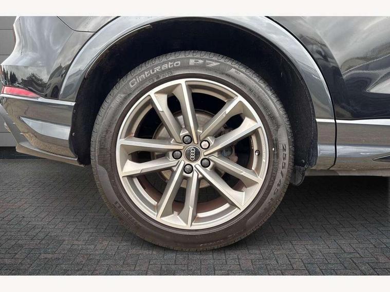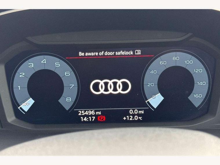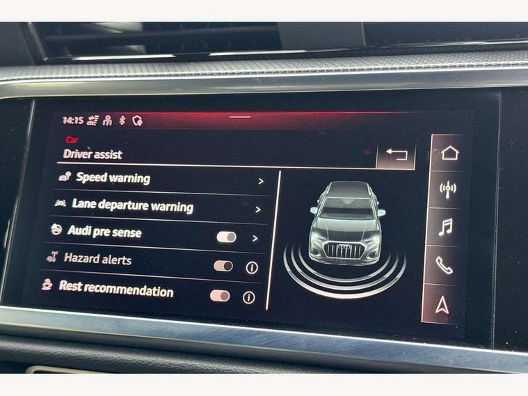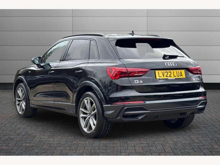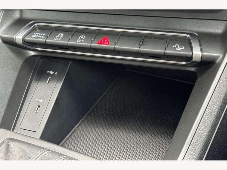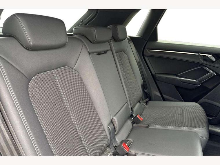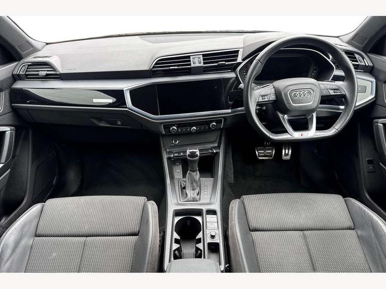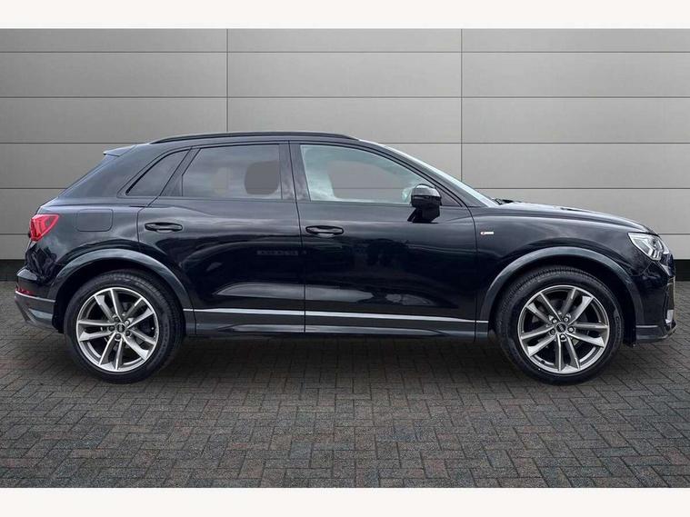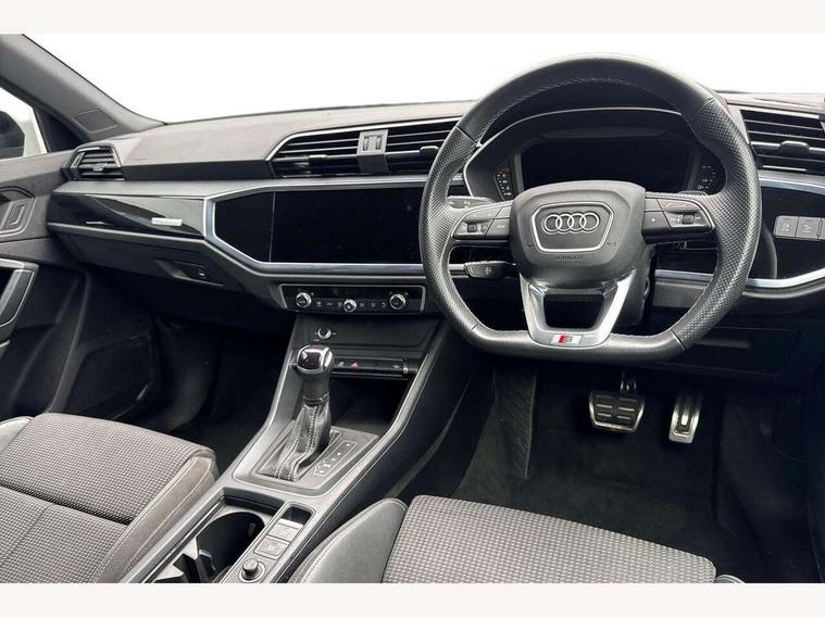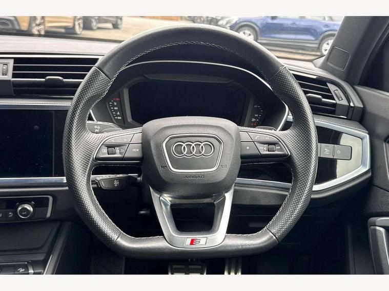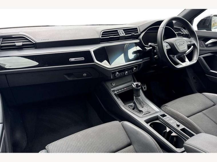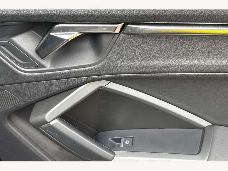 Amazon alexa Integration, Audi connect safety and service (e-call), Audi drive select, Audi lane departure warning, Audi Virtual Cockpit - 10.25" display, Bluetooth interface, Camera based traffic sign recognition, MMI Navigation Plus with high resolution 10.1 inch touchscreen colour display, Power operated tailgate, Progressive steering, Service interval indicator, Smartphone interface includes wireless Apple carplay/Android Auto, Start stop system with recuperation, Voice control system with natural language interaction, 48V Mild hybrid technology, Sports suspension, 2 USB-C ports with charge and data functions, 6 passive loudspeakers, DAB digital radio module, Acoustic windscreen, Auto dimming frameless rear view mirror, Black roof rails, Electrically folding, adjustable and heated door mirrors with integrated LED side indicators and kerb view function for passenger side, Front and rear electric windows, Front fog lights, Grille vertical bars in aluminium silver/Matt, High gloss black finish B and C pillars, LED headlights with LED daytime running lights, LED rear lights, LED third brake light, Privacy glass dark tinted rear and rear-side windows (from B-pillar backwards), Rain and light sensors, Rear diffuser strip in matt titanium black, Rear side wing doors, Rear wiper, S line bumpers in contrasting Manhattan grey, Variable front intermittent wipers, 12V socket in rear centre console, 3 seat bench in 2nd row, 40:20:40 folding with manual adjustment for 60:40 forwards/backwards position and backrest angle, Adjustable rear seat bench/backrest with centre armrest and cupholder, Black cloth headlining, Dual zone electronic climate control, Front and rear black floor mats with contrast stitching in rock grey, Front and rear headrests, Front and rear roof module including reading lights, Front centre armrest, Glove compartment lighting, Height and reach adjustable steering wheel, Illuminated door sill trims with S logo, ISOFIX child seat mounting for front passenger with airbag deactivation and outer rear seat including top tether attachment point for outer rear seats, Luggage compartment light, Manual front seats with height adjustment, Perforated leather gearknob, Single front passenger seat, Stainless steel luggage compartment sill finisher, Stainless steel pedals, Black styling pack - Q3, Non smoking pack - Q3, 3x3 point rear seatbelts, 6 airbags - Driver, front passenger, curtain and side windows, Audi pre-sense front with pedestrain and cyclist recognition, Electromechanical parking brake, Electronic stabilisation control including ABS, ASR and EDL, Front seatbelt reminder, Hill descent control, Hill hold assist, Manual child lock in rear doors, Pre sense basic, Seatbelt monitoring, Tyre pressure warning, Warning triangle and first aid kit, Anti theft alarm, Anti theft wheel bolts, Immobiliser, Remote central locking, Detail dashboard around MMI touch colour display in glass look, black with surround in aluminium look, Leatherette door armrest, Piano black inlay, Tool kit, Tyre repair kit,