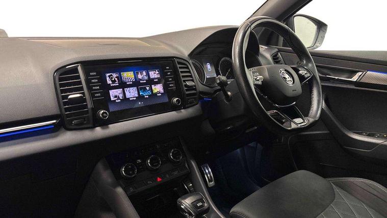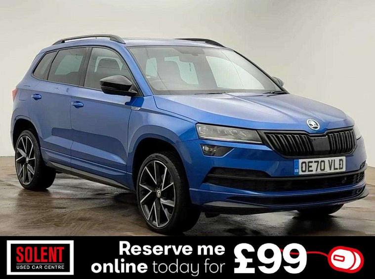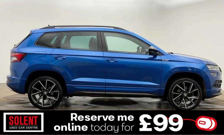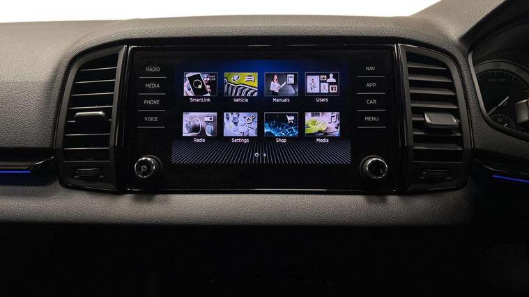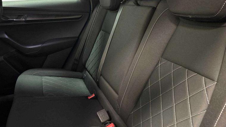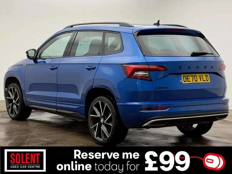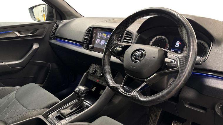 Care connect, Drive mode selector, Driver alert system, Driver fatigue sensor, Driver profile selection, Multifunction colour trip computer, Outside temperature gauge, Rear view camera, Service interval indicator, SmartLink wireless for Apple and wired for Android, Start/stop system with regenerative braking, USB C Port x 2 in front centre console, DAB radio with Bluetooth, SD card slot, USB connection, Wireless charging without wireless aerial connection, Acoustic glass, Aero front windscreen wipers with intermittent function, Automatic headlight control system, Black electric window control buttons, Black roof rails and door mirrors with radiator grille, Body colour door handles, Electric front and rear windows with child proof lock, Front door steps with SportLine logo, Full LED headlights + adaptive front light system + LED daytime running lights and front cornering fog lights, Headlight washers, Heated rear windscreen, LED rear lights with high functionality, Light assistant (coming/leaving home/tunnel light), Panoramic sliding sunroof, Privacy glass, Protective door side sills in body colour, Rear diffuser, Safety reflectors on front doors, Skoda lettering on tailgate in black, Sportline badge on front fender, Sportline decorative inserts with badging, Sports front and rear bumpers, Third brake light, 1.5 litre bottle holders in driver and front passenger door panels, 12V socket in boot, 12v socket in front centre armrest with storage compartment and rear air vents, 2 Folding hooks and nets in boot, 2 Front readings lights for driver and passenger, 3 rear height adjustable headrests, 4 foldable roof handles with rear coat hooks, 4 lashing points on luggage floor, Aluminium pedals, Backrest release, Black roof headlining, Cargo elements in boot, Chrome inner door handles, Door sill scuff plates, Driver and passenger seats height adjust, Front head restraints, Front seat and rear pockets, Height adjustable front three point seats belts with tensioners, Height/reach adjust steering wheel, Ice scraper, Illuminated and cooled glovebox, Illuminated luggage compartment, Isofix child seat preparation outer rear, Manual lumbar support for front seats, Net programme in boot, Pen holder, Pollen filter, Rear boot cover, Rear reading lights, Rear seats fixed folding and divided 60:40, Retractable parcel shelf attachable to tailgate, Safety vest holder, Storage box in upper central dashboard closed, Storage compartment below the passenger seat, Sunvisors with illuminated vanity mirrors, Textile floor mats, Umbrella under passenger seat, LED Interior lighting pack with Skoda welcome logo - Karoq, Airbags - Front side, head, knee and curtain, Automatic door unlocking in case of crash, Automatic fuel cut off in case of crash, Driver airbag, Electronic parking brake with auto hold function, Emergency rear braking signal, ESC including ABS, MSR, ASR, EDS, HBA, DSR, RBS, MKB and traction control, Front assist radar scanning of the space in front of the car with automatic braking, Hill hold control, Passenger airbag with switch-off function, Pedestrian monitor, Seatbelt reminder signalisation and pretensioner for all seats, Three point seatbelts rear, Two tone horn, Tyre pressure display, Tyre pressure monitor, Alarm with interior monitoring, back up horn and tilt sensor with safe function, Electronic engine immobiliser, Keyless entry and keyless start with safe system, Remote central locking with 2 remote folding keys, Black air vent surround, 19" Vega anthracite alloy wheels, Anti-theft wheel bolts protection, Storage on wheel cover,