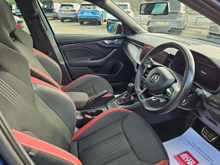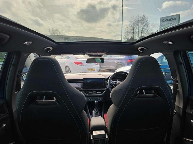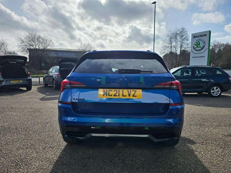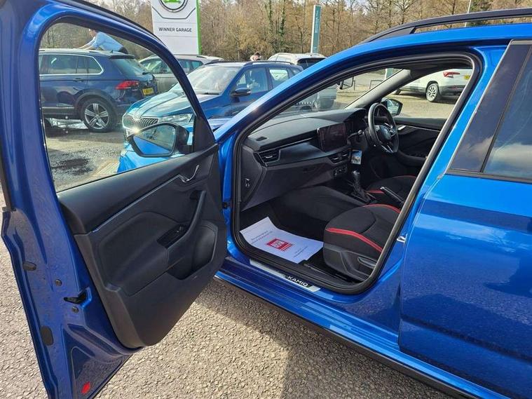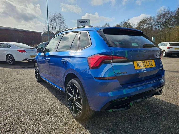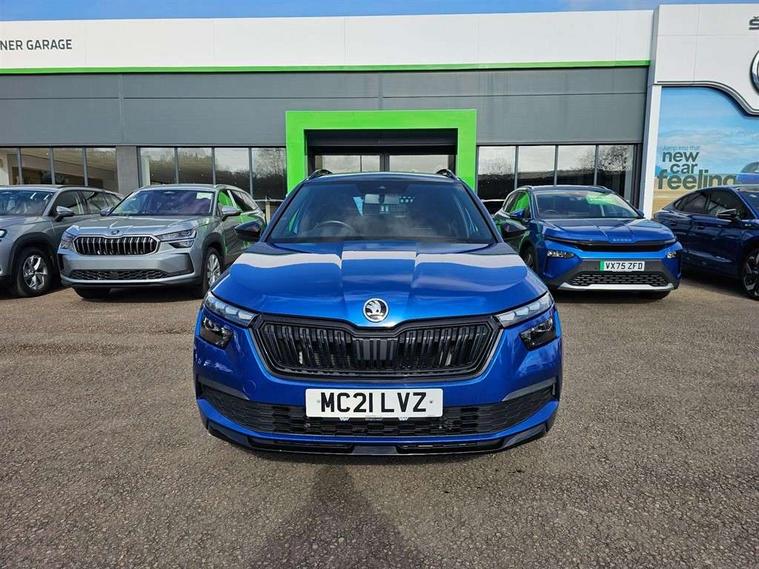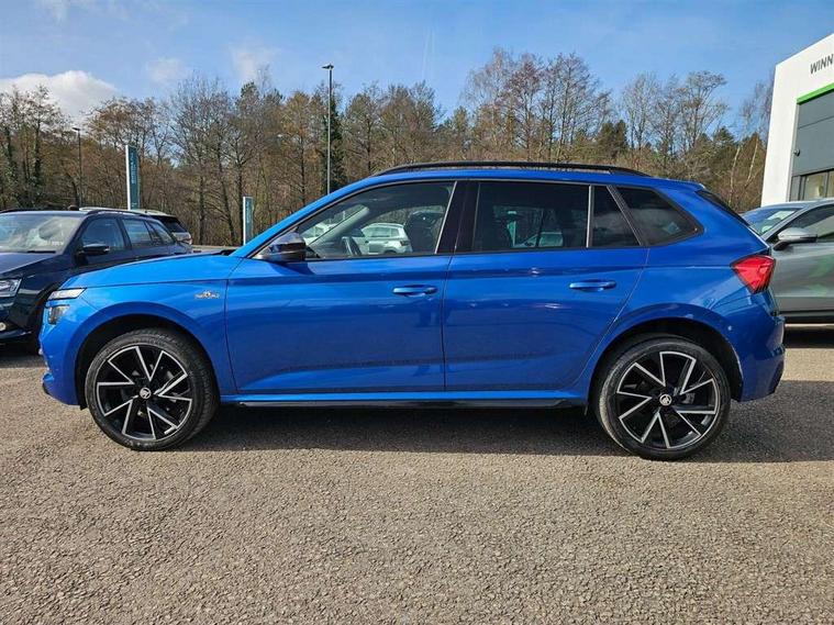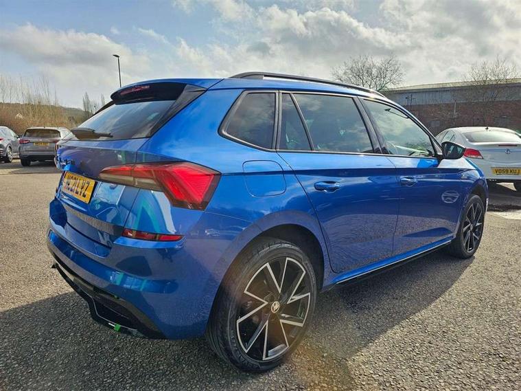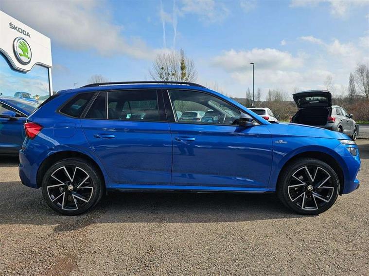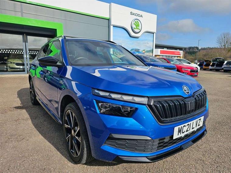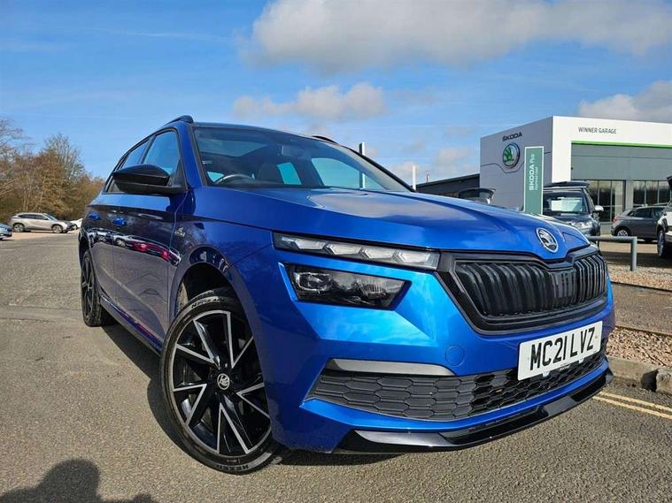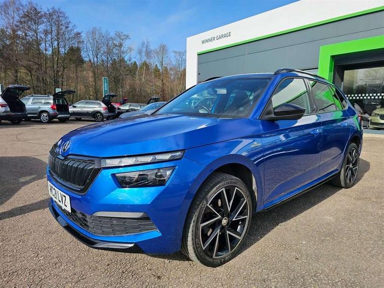 Amundsen satellite navigation with 9.2" touchscreen display, voice control, virtual cockpit and web radio, Bluetooth system, E-call, Front assist system, Gesture control, PAS, Service indicator, Speed limiter, Virtual cockpit with 10.25" display, Wireless SmartLink for apple car play, android auto and mirrorlink, 2 USB - C ports with 1x adaptor cable, Auxiliary input socket, DAB Digital radio, Auto dimming rear view mirror, Black door mirrors, Black radiator grille, Black rear diffuser, Body colour bumpers, Body colour door handles, Body colour roof spoiler, Boot lettering in black, Chrome grille surround, Electrically adjustable and heated door mirrors, Fixed panoramic sunroof with black roof rails, Front and rear electric windows, Front sport bumper, Full LED headlights with adaptive front light system, dynamic indicators, cornering function and fog lights, Headlight range control, Heated rear window, High functionality rear led lights with dynamic indicators, KAMIQ Door sills, Light sensors, Monte carlo plaque, Privacy glass, Rear fog lights, Rear wiper, 12V Accessory socket in centre console, Aluminium pedals, Black ceiling for black/beige interior, Chrome inner door handles, Cloth upholstery, Front head restraints, Glove compartment with illumination, Height adjustable passenger seat, Ice scraper, Isofix child seat fittings on outer rear seats, ISOFIX on front passenger seat, Leather gear lever, Manual lumbar support for front seats, Rake/reach adjustable steering wheel, Reading lights, Sports seats, Sun visors with illumination on front passenger, Textile floor mats, Third rear headrest, Top tether for front passenger seat, Umbrella in driver's door, 3x3 point rear seatbelts, Airbags - driver and front passenger, ESP, Front passenger airbag deactivation switch, Front side airbags with curtain airbags, Hill hold control, Manual parking brake, One tone horn, Rear disc brakes, Seatbelt reminder for driver an co-driver, Traction control, Tyre pressure monitor, Anti-theft alarm system with interior monitoring, backup horn, towing protection and remote central locking with SAFE system, Anti-theft wheel bolts, Electronic engine immobilizer, Chrome air vent surrounds, 18" Vega alloy wheels in black,