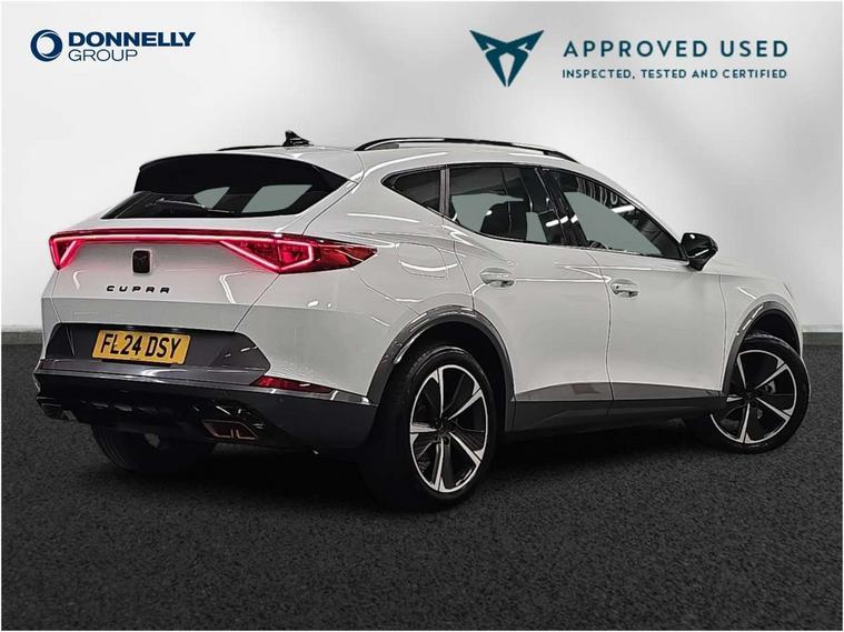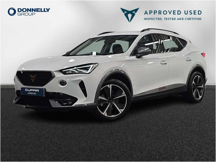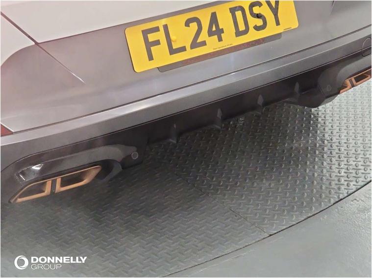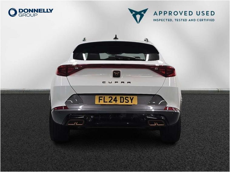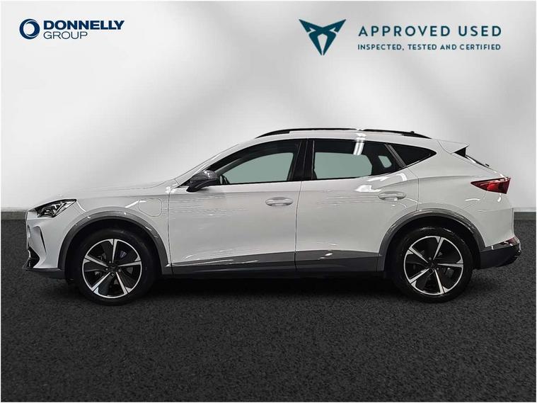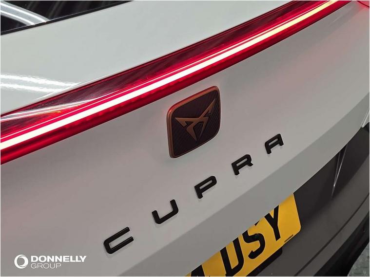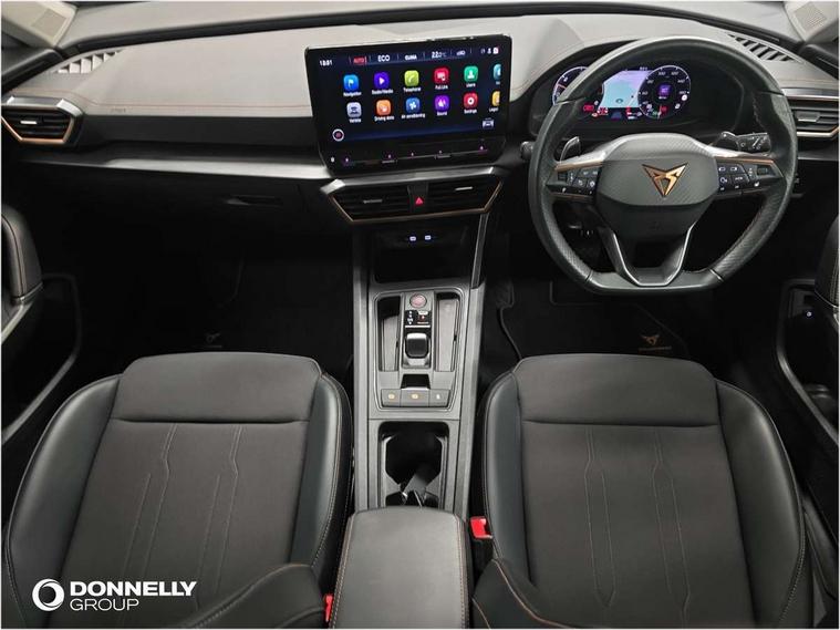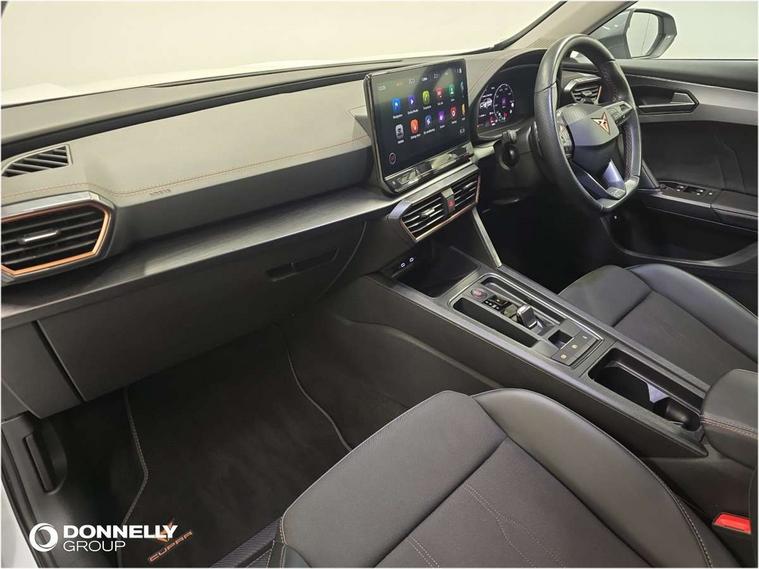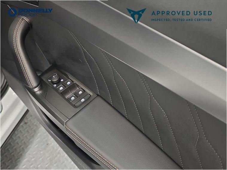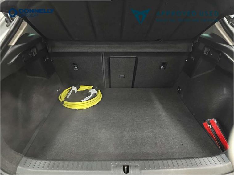 Digital cockpit and configurable dashboard, Driver alert system, Driving profile selection, Forward collision warning with automatic braking, Lane assist, Navigation system with 12'' Touchscreen Display, PAS, Predictive adaptive cruise control with speed limiter, Rear parking sensors, RPM, trip computer, outside temp gauge, instrument light brightness, low fuel warning light, lights on reminder, gearshift indicator, Service interval indicator, Start/stop system with regenerative braking, Voice control system, Wired Android Auto, Wireless apple carplay, Wireless phone charger, 10 amp mode 2 charging cable, 16 amp mode 3 charging cable, 3.6 kw On-board charger, Electronic locking differential and dynamic traction support, Standard suspension, 2 front and 2 rear USB type C sockets, DAB radio, Auto dimming rear view mirror, Body colour door handles, Body coloured bumpers, Dark grey wing mirror, Daytime running light with automatic headlight control and coming home feature, Dynamic headlight range control, Electric front/rear windows, Electrically adjustable, heated and folding door mirrors, Front fog lamps with cornering function, Gloss black roof rails and window surrounds, LED Headlights, LED Taillights with dynamic indicator, Rain sensing wipers, Rear diffuser with black simulated exhaust pipes, Rear side wing doors, Rear wash/wipe, Third brake light, Tinted rear windows, Welcome lights, 12V socket, 2 front and 2 rear reading lights, 3 seat bench in 2nd row, 60/40 split rear bench seat with armrest and mechanical seat release, Dust/pollen filter, Front and rear head restraints, Front centre armrest, Height/reach adjust steering wheel, Illuminated interior front door sills, Illuminated sunvisor with mirror, Interior ambient lighting, Isofix, Leather multi function heated steering wheel with gear shift paddles, Manually adjustable height and lumbar support for front seats, PVC/Cloth upholstery with copper stitching + Sport seats, Single front passenger seat, Three zone climate control with control panel in rear, Safety and driving pack (M) - Formentor, 3 point seatbelts on all rear seats, ABS, Brake control system - ESC and brake booster, Child proof door locks, Driver and front passenger airbags with front passenger airbag de-activation, Electronic parking brake, Front and rear disc brakes, Front side curtain airbags, Hill hold control, Public e-call, Seat belt reminder for front and rear seats, Tyre pressure monitoring system, Anti theft alarm system, Keyless entry and start system (KESSY), Locking wheel bolts, Copper and aluminium interior detailing, Tyre repair kit,