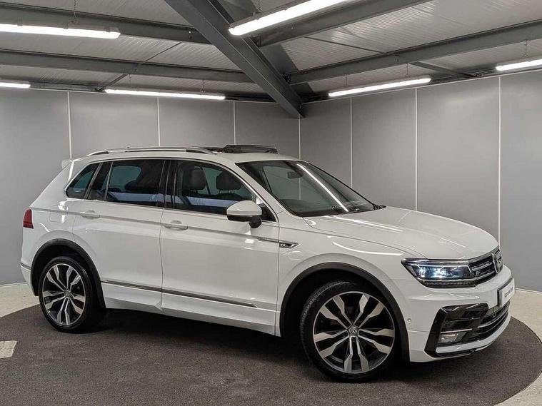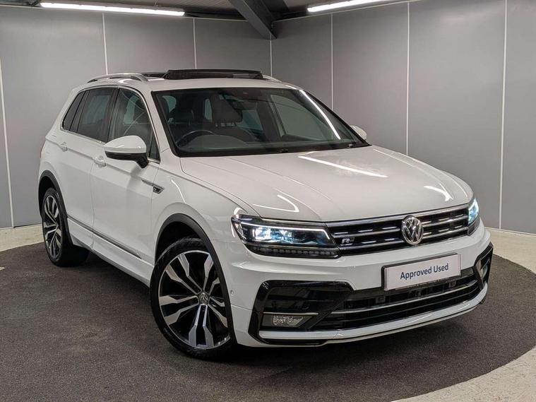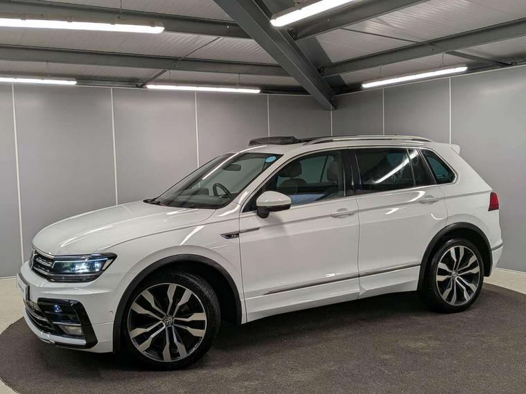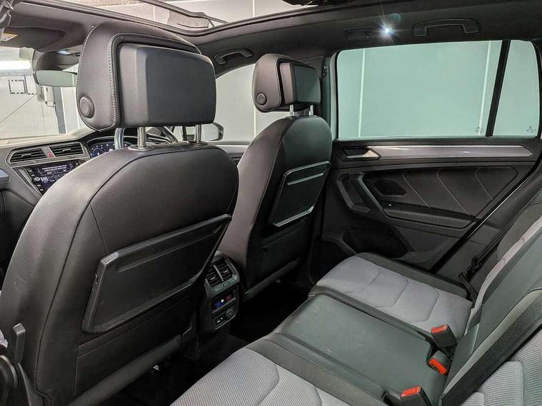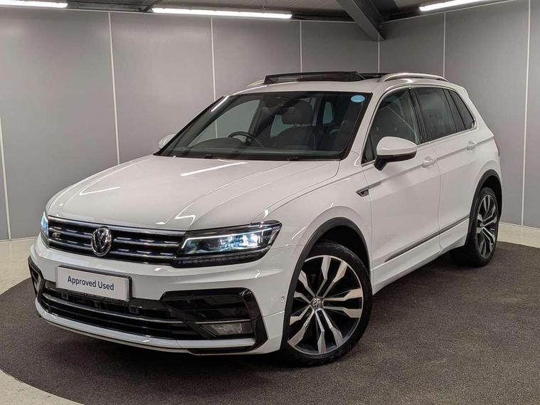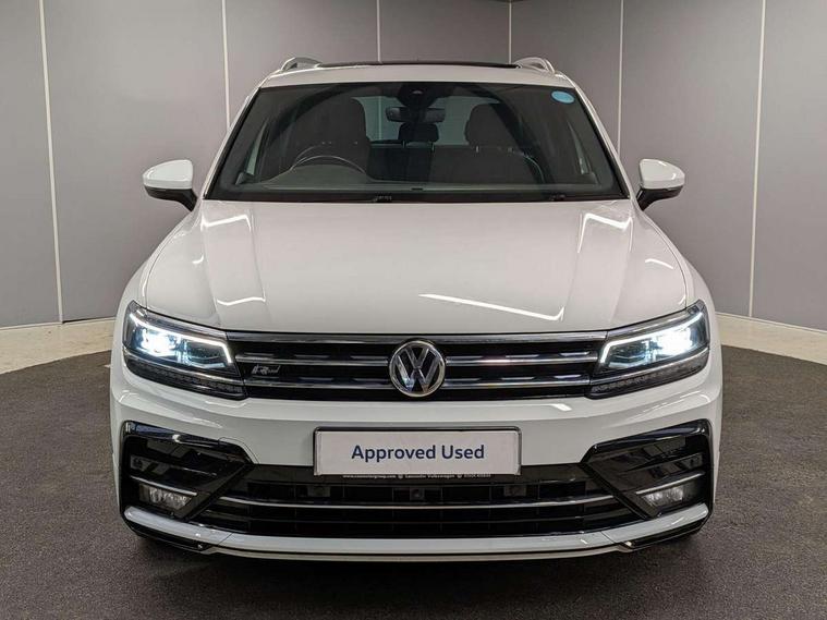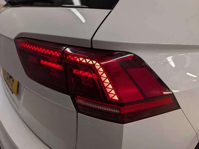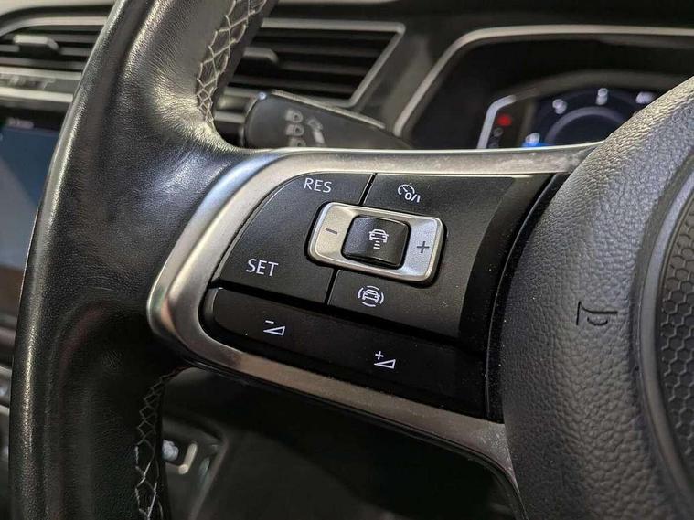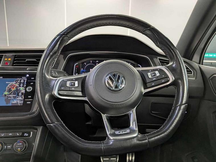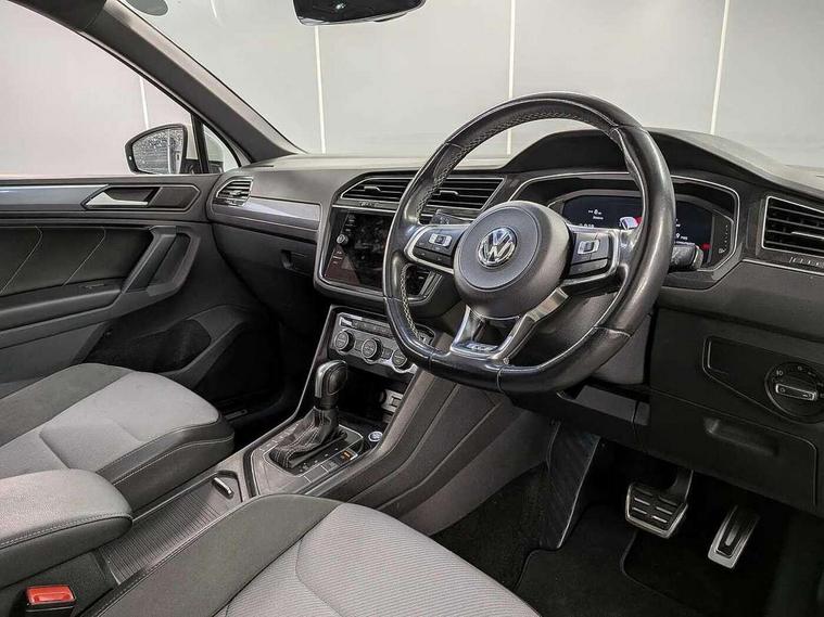 2D/3D map view, Active information display, Adaptive cruise control, App-Connect, Area view with park assist steering and front and rear parking sensors, Bluetooth phone integration system, Car information display, Distance control assist, Driver alert system with fatigue detection, Driver profile selection, Front assist, radar sensor controlled distance monitor, city emergency braking + predictive pedestrian protection, Fully electric tailgate + keyless entry and start, Instrument cluster, Lane assist, Lights on warning, Multifunction computer with visual gear change recommendation for fuel consumption, Outside temperature display, Progressive power assisted steering, Service interval indicator, Speed limiter, Start/Stop function, Warning sound and light for doors and tailgate open, Battery regeneration during braking, Diesel particulate filter, Misfuel prevention device for diesel engine, XDS electronic differential lock for improved traction and handling, 2 x USB connection + USB charging socket, 4 X 20 watt output, DAB Digital radio, SD card slot, Simultaneous pairing of 2 compatible mobile devices, SMS functionality - read, compose and send SMS messages using touch-screen display, Title and cover art display, 3D effect cherry red LED rear tail lights, Aluminium decorative inserts in dash and door panels, Auto dimming interior mirror, Automatic activation of hazard warning lights, Body colour door handles, Body colour door mirrors, Body colour rear spoiler, Body colour side skirt, Body coloured bumpers, Chrome side window surrounds, Chrome trimmed radiator grille, Coming/leaving home lighting function, Dusk sensor + auto driving lights, Electric panoramic sunroof with sunblind, Electrically heated and foldable door mirrors, door mirror puddle lights and reverse activated kerb view adjustment on passenger's door mirror, Front and rear electric windows, Heated rear window, High level 3rd brake light, LED headlights with dynamic light assist daytime running lights and cornering front fog lights, LED rear number plate lights, Piano black front air intake and rear diffuser, R Line body kit, R Line side sills, Rain sensor windscreen wipers, Rear tinted glass from B-pillar backwards approx 65% tinted, Rear windscreen washer and wiper with interval delay, Side skirts and rear bumper with chrome insert, Silver front underbody protection and rear diffuser, Silver roof rails, Trailer Stability Programme, Unique R Line badging, Windscreen wipers/ intermittent wipe + 4 position delay, 12V socket in centre console storage area, 2 cup holders in front, 3 rear headrests, 3 zone climate control, 4 load lashing points, 40:20:40 split folding rear seats, Bag hook in luggage compartment, Black headlining, Foldable front passenger seat backrest, Front + rear carpet mats, Front centre armrest with 12v socket, Front centre armrest with storage + rear 2 air vents, Front seat back storage pockets, Front seat R Line logo with rear seat backrest, Front seatback folding tables, Height/reach adjust steering wheel, Illuminated driver/passenger vanity mirrors, Illuminated scuff plates, Instrument lighting white adjustable panel illumination, Interior light with delay, Isofix Preparation 2 Rear child seats, Leather gear knob, Load through provision with 2 cupholders when folded, Lockable cooled glovebox, Luggage compartment lighting, Map pockets on front seats, Passenger seat height adjuster, Removable luggage cover, Sliding/reclining rear seats, Stainless steel pedals, Storage compartment in driver's door, Storage compartment in passenger's door, Storage compartment in rear doors, Storage compartments in luggage area left and right, Storage tray on dashboard, Sunglasses storage, Three spoke leather trimmed multifunction steering wheel with aluminium inserts and R Line Logo including paddle shift, Unique R Line door sill protectors, Variable boot floor, height adjustable and removable, Ambient lighting pack - Tiguan, R Line styling pack - Tiguan, 3 rear 3 point seatbelts, ABS+EBD+Brake assist, Active bonnet, Active pedestrian safety system, Curtain airbags, Driver/Front Passenger airbags, Driver/Passenger whiplash optimised head restraints, Drivers knee airbag, DTC - Drag torque control, Electronic parking brake with auto hold, ESC with EDL, ASR, EDTC and trailer stabilisation function, First aid kit, Front seat side impact airbags, Front side airbags, Front ventilated disc brakes and rear disc brakes, Head airbag system, Height adjustable front 3 point seatbelts + pretensioners, Hill hold control, Passenger airbag deactivate switch, Passenger knee airbag, Pre crash preventive occupant protection, Rear side airbags, Rigid safety cell with front and rear crumple zones, Two tone horn, Warning sound and light for front seat belts if unfastened, Warning triangle, Alarm with interior protection, Electronic engine immobiliser, Remote central locking with 2 remote folding keys, Chrome door trim inserts, Dark grey decorative inserts in dash and door panel, Piano black decorative inserts in centre console, 20" Suzuka alloy wheels with mobility self sealing tyres + anti theft wheel bolts, Steel space saver spare wheel,