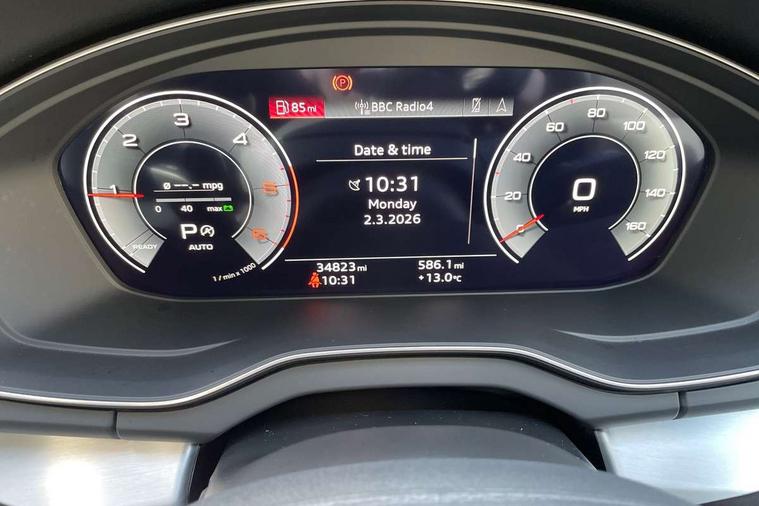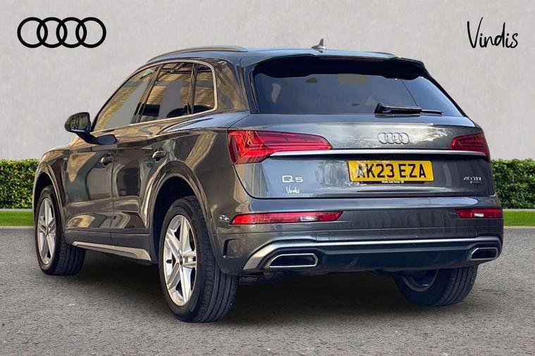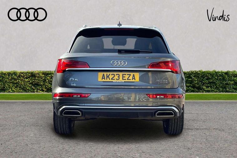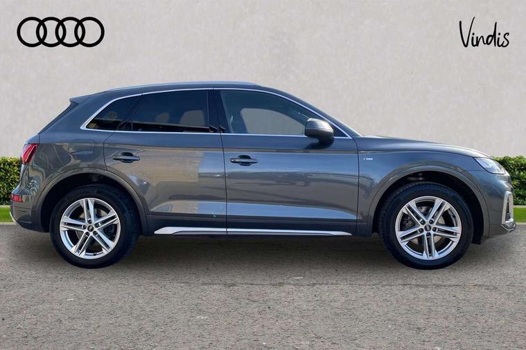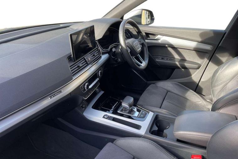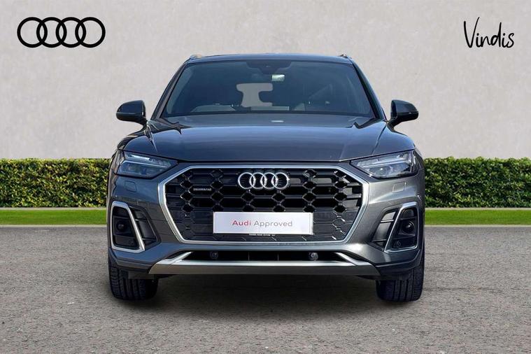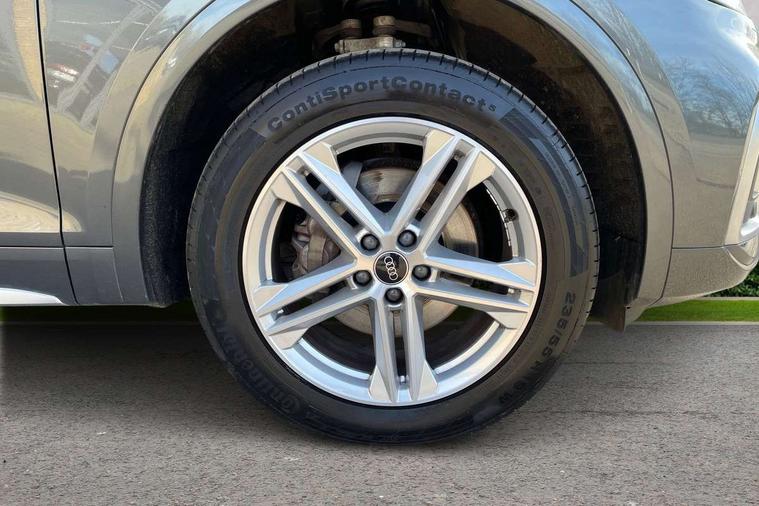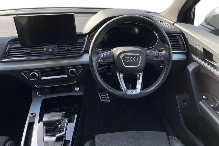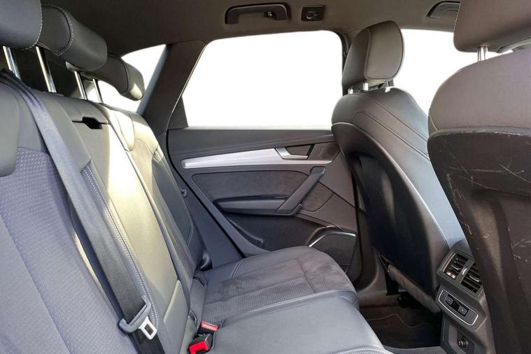 Acoustic front and rear parking sensor, Audi connect safety and service (e-call), Audi connect with Amazon Alexa Integration, Audi drive select, Audi virtual cockpit plus with 12.3" screen and three different layout designs, Audi wireless smartphone interface, Automatic start-stop system with coasting functionality and efficiency programme, Bluetooth interface, Electro - mechanical power assisted steering, MMI navigation plus with 10.1" touch screen, Power tailgate, Reversing camera, Service interval indicator, Voice control system with Audi hotword activation "Hey Audi", Diesel particulate filter, Quattro on demand, S line sports suspension, 2 x USB charging port with aux input socket, 8 loudspeakers, DAB Digital radio, Acoustic windscreen, Aluminium roof rails, Audi matrix LED headlights with dynamic front and rear indicators, Auto dimming door mirrors, Auto dimming frameless rear view mirror, Automatic headlight adjustment, Automatic headlights and windscreen wipers, Body colour bumpers, Body colour door mirrors, Body colour rear diffuser with matt aluminium silver surrounds, Body colour underbody protection, Chrome plated exhaust trims, Daytime running lights, Door sills in Selenite silver, Electric adjustable/heated/folding door mirrors, Front air inlet surrounds in aluminium, Front and rear electric windows, Front radiator grille in honeycomb design, Headlight washers, High level LED brake light, Lower bumpers painted in contrast Manhattan grey, Rear chrome trim strip below lights, Rear privacy glass and rear side windows, Rear side wing doors, Rear wiper, Roof bars, S Line badges on the front wings, S Line front and rear bumpers, S Line rear spoiler, S Line side skirts, 3 rear headrests, 3 spoke leather multifunction steering wheel with S badging perforated leather grips, 40:20:40 split folding 3 rear bench seat in 2nd row with rear centre armrest, Black cloth headlining, Comfort front centre armrest, Contrast stitching on seats, steering wheel and gear lever gaiter, Deluxe 3 zone electronic climate control, Front/rear floor mats, Gear lever in black leather, Heated front seats, Height adjustable front head restraints, Height/reach adjustable steering column, Illuminated door sill trims with S logo, Luggage compartment cover, Manual seat adjustment with 4-way electric lumbar support, Removable luggage compartment floor, Single front passenger seat, Stainless steel pedals, Sunvisors with vanity mirrors, High gloss pack - Q5, LED interior light pack - Q5, 3 point seatbelts on all seats, 6 airbags - Driver, front passenger, curtain and side airbags, Electrically operated child locks on rear doors, Electromechanical parking brake, Electronic stabilisation control including ABS, ASR and EDL, First aid kit with warning triangle and vests, Front passenger airbag deactivation, Hill descent control, Hill hold assist, ISOFIX child seat mounting for front passenger seat and ISOFIX child seat mounting with Top Tether for outer rear seats, Multi collision brake assist, Pop-up bonnet for pedestrian protection, Pre sense city, Seat belt force limiter, Seatbelt monitoring, Tyre pressure warning, Anti theft alarm, Anti-theft wheel bolts, Keyless Go access/ignition system, Remote central locking, Air vents inserts and centre console in gloss black, Matt brushed aluminium inlays,
