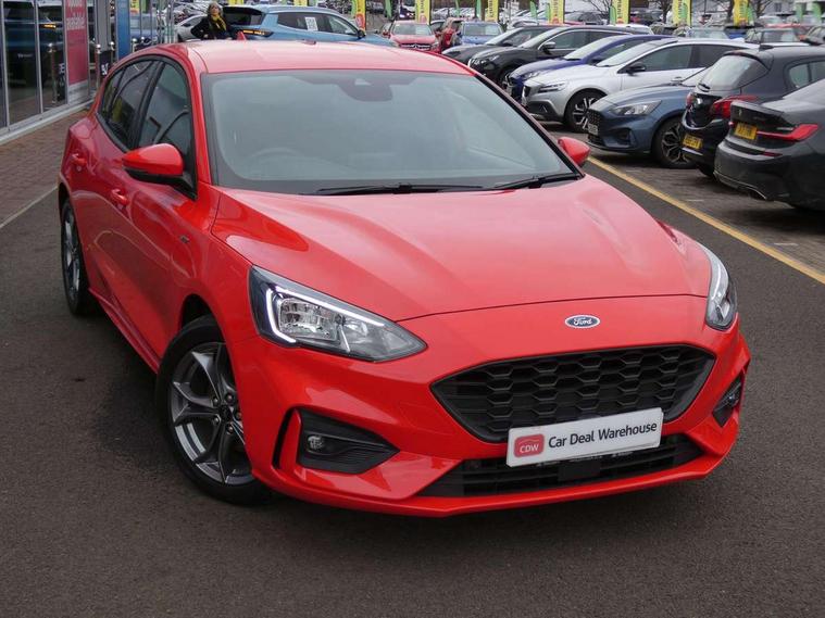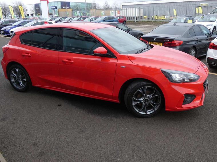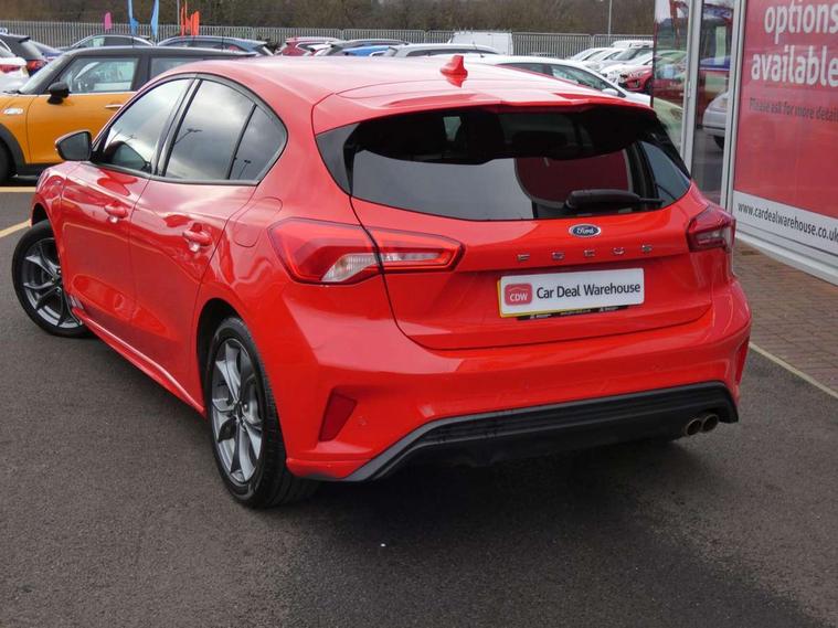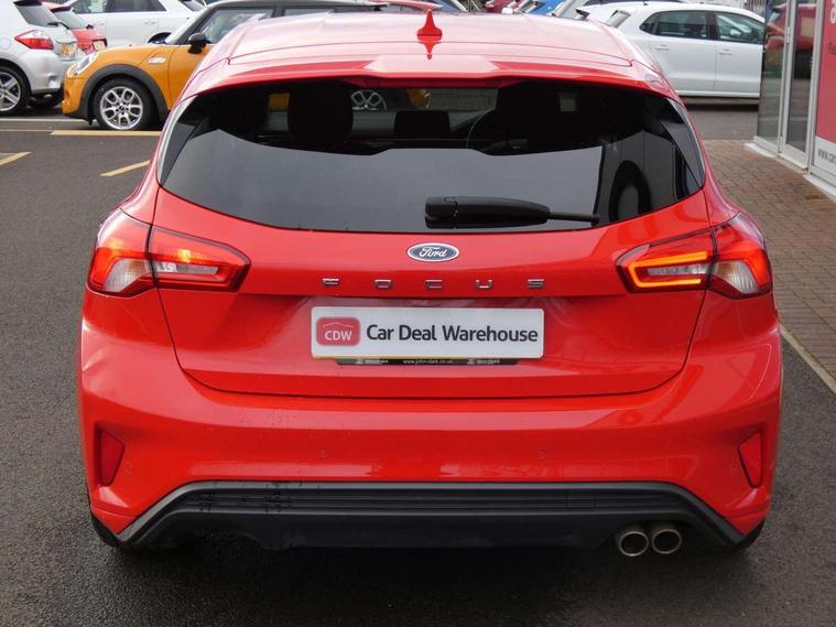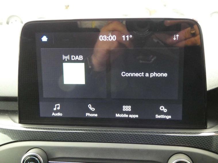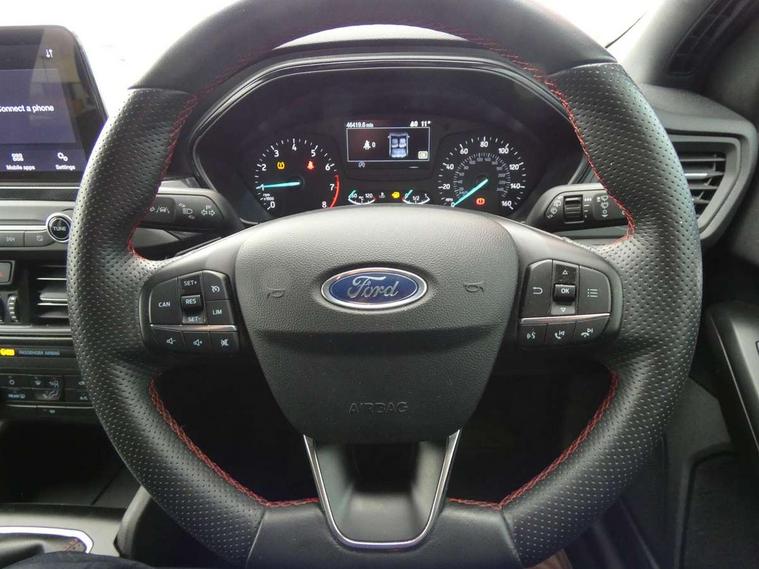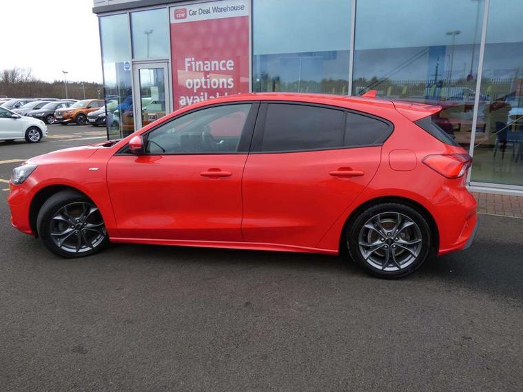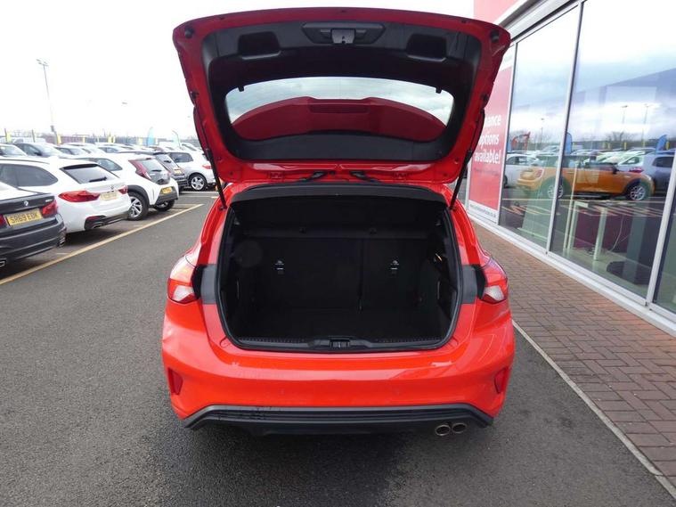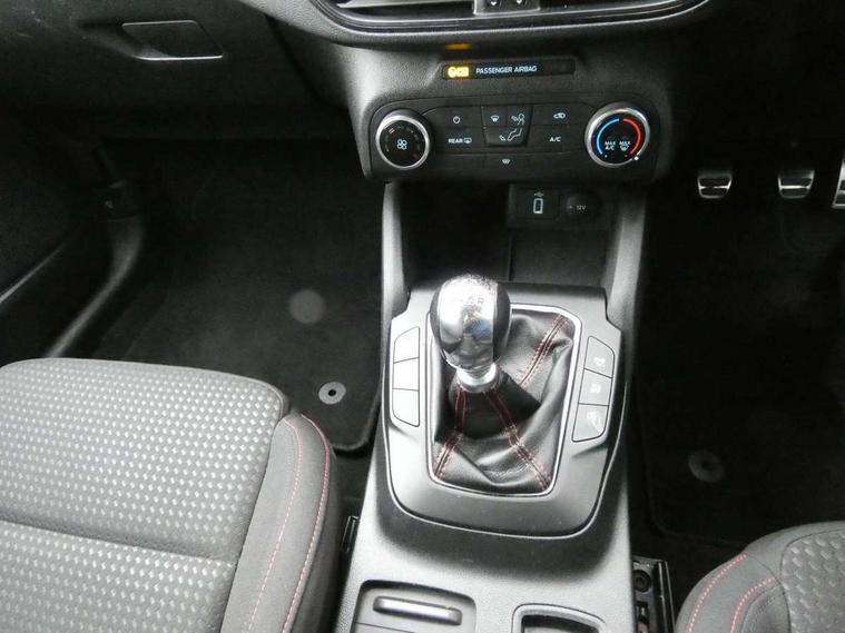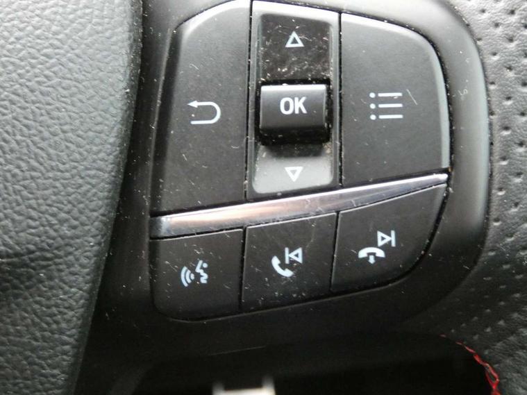 Bluetooth system, Digital clock, Easy fuel capless refuelling system, Eco mode, Ford pass connect, Ford SYNC 3 with 8" TFT touchscreen, and app link Android auto/Apple carplay, Intelligent speed assist, Lane keeping aid with lane departure warning, PAS, Selectable drive mode, Trip computer, Sports tuned suspension, 6 speakers, Aux input, 'Quickclear' heated windscreen/heated washer jets, Auto headlamps (on/off), Body colour large rear spoiler, Body colour side skirt, Body coloured bumpers, Body coloured door handles, Body coloured electrically operated and heated door mirrors with side indicators, Electrically operated front and rear windows with one touch opening and closing, Front variable intermittent wipers with electric wash, Halogen reflector headlamps, Heated rear window, LED daytime running lamp, LED front fog lamps with cornering function, Polished twin tailpipe, ST-Line upper and lower grille with full body styling kit and wing badges, Tailgate wash/wipe, 3 spoke flat bottomed leather steering wheel with red stitching, 60/40 split back and cushion rear seats with 2 height adjustable headrests, Alloy finish pedals, Aluminium gear knob, Centre console with armrest, Cloth upholstery with red stitching, Dark headliner, Driver's lumbar support, Front floor mats, Height adjustable front headrests, Isofix child seat preparation, Manual air conditioning, Reach + rake adjustable steering column, Rear centre headrest, ABS+Electronic Brake force Distribution, Auto hold function, Driver airbag, Electronic parking brake, Electronic stability control, Front and rear seatbelt reminder, Front inertia reel height adjustable seatbelts with pre-tensioners, Front passenger airbag, Front side airbags, Hill start assist, Passenger airbag deactivate switch, Post collision braking, Pre collision assist with autonomous emergency braking and pedestrian/cyclist detection, Side curtain airbags, Three rear inertia reel lap/diagonal seatbelts, Tyre pressure monitoring system, Keyless start with 'Ford Power' starter button, MyKey system, Remote central locking & engine immobiliser, Thatcham category 1 alarm, Contrast stitching - Red, 17" 5x2 spoke alloy wheels with rock metallic finish, Mini steel spare wheel,