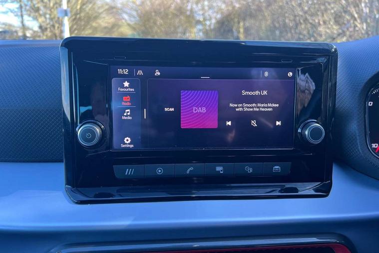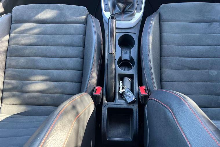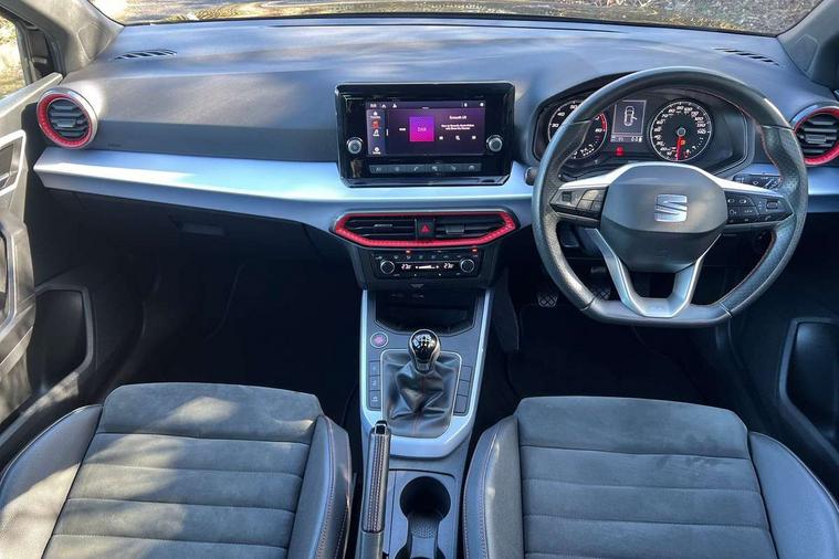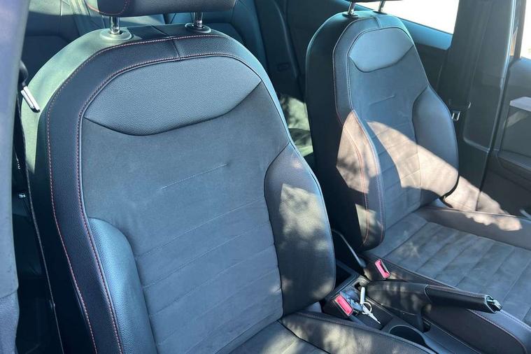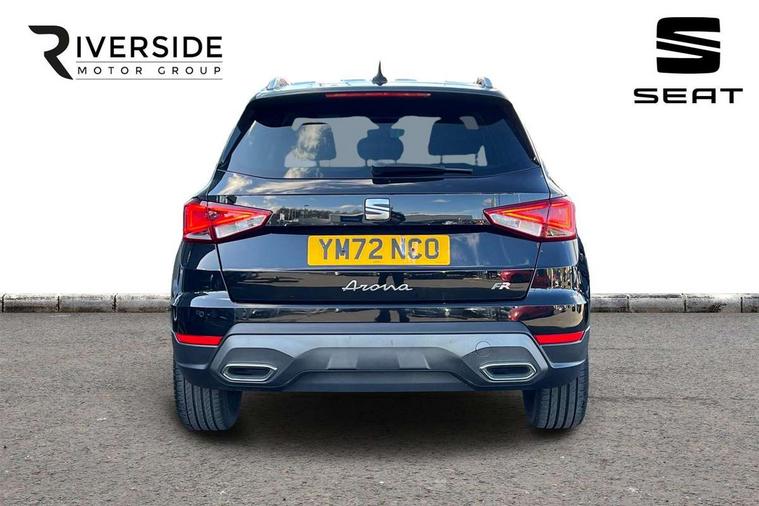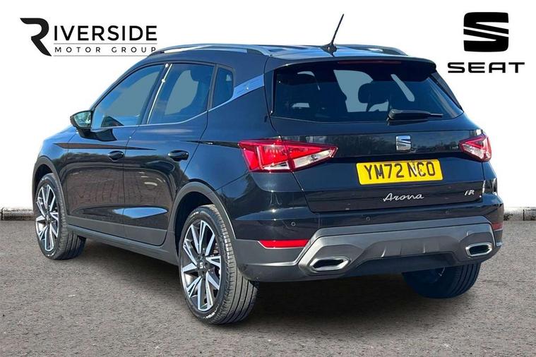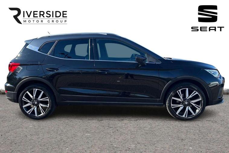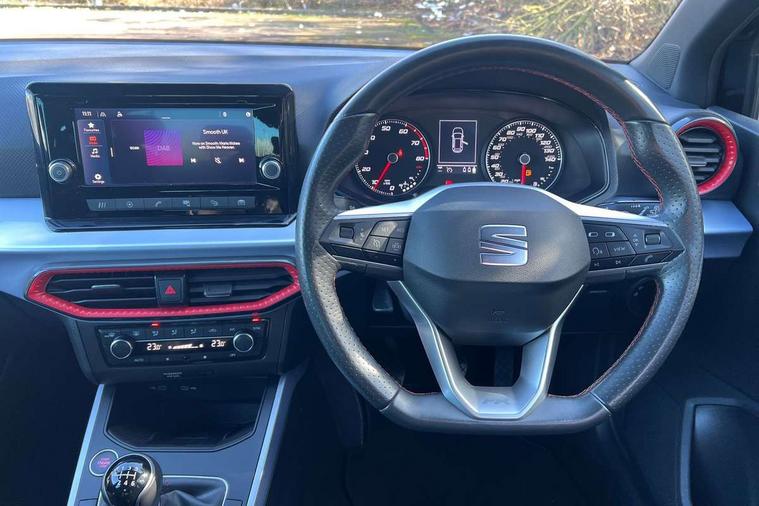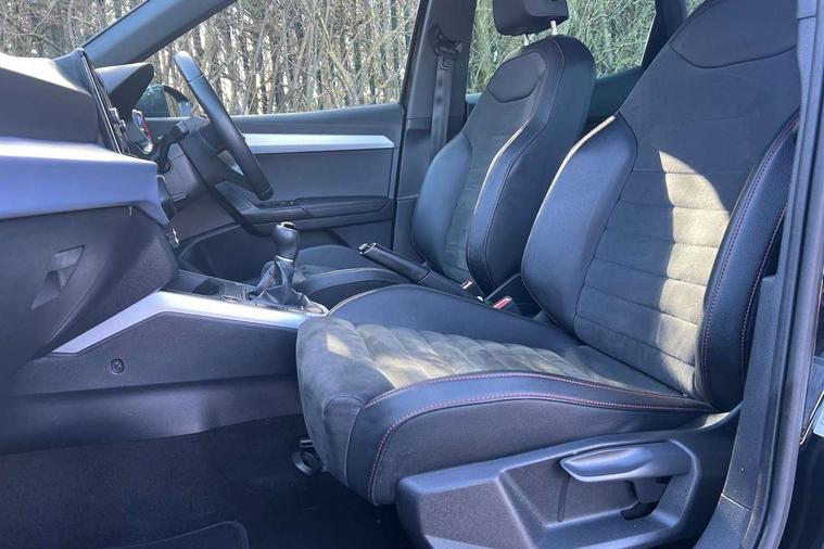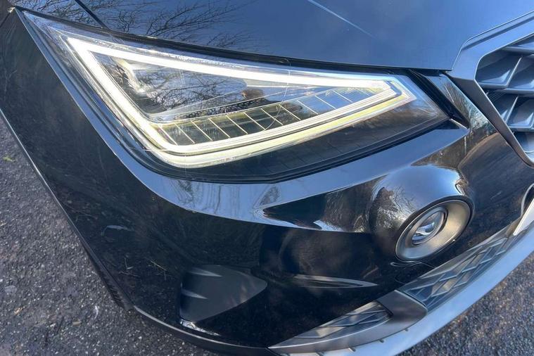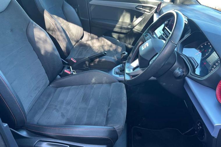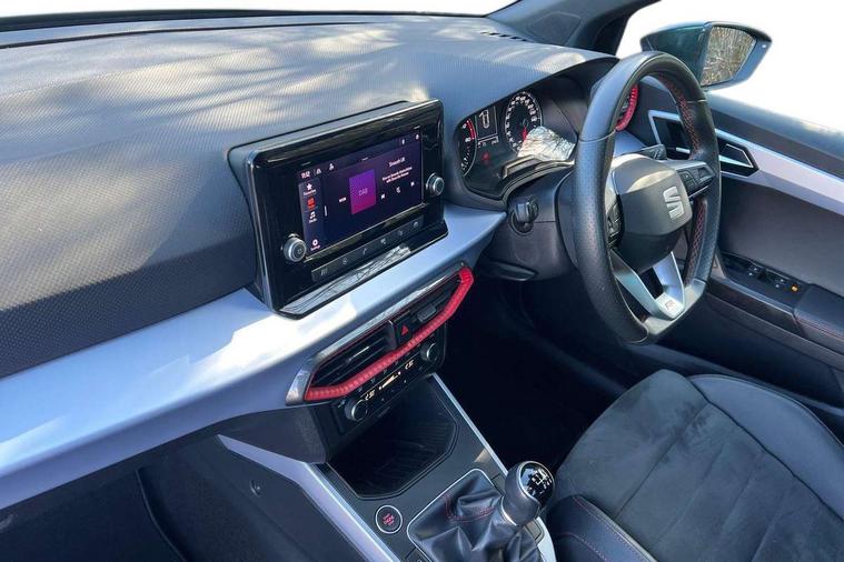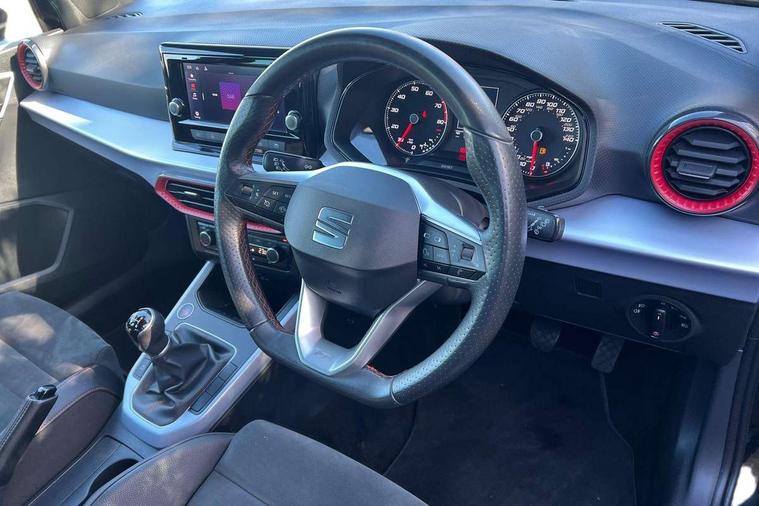 'Lights On' Reminder warning buzzer, Analogue cockpit with physical dials, Digital clock, E-call, Electric speed sensitive power steering, Full Link Smartphone Integration with Mirror Link, Apple Car Play, Google Android Auto with USB Type C cable for Apple and Android compatibility, Lane keeping system, Low fuel warning light, Outside temperature display, Rear parking sensor, RPM counter, Seat connect with safety, service and remote, SEAT Drive profile - Four different models normal-sport-eco-individual, steering response, throttle response, Trip computer, Wireless phone charger, Bluetooth interface for hands free and audio streaming, DAB digital radio and AM/FM radio, Media system with 8.25" colour touchscreen with USB port (type c), Steering wheel mounted audio controls, Anti theft roof antenna, Automatic activation of hazard warning lights, Body coloured bumpers, Body coloured door handle inserts, Chrome roof rails and window surrounds, Dark tinted rear windows, Dimming rear view mirror, Electric front/rear windows, Electrically adjustable and heated door mirrors, Front fog lights with cornering function and rear fog light, FULL LED automatic headlights with dynamic headlight range control, coming and leaving home, LED daytime running lights, LED rear tail lights and licence plate lights, Protective side mouldings, Rear side wing doors, Rear spoiler, Rear window wash/wipe, Roof colour door mirrors, Third brake light, Twin exhaust pipe styling hidden exhaust pipe, Visible VIN plate, Windshield wiper with intermittent control and potentiometer, 2 cupholders, 3 seat bench in 2nd row, 60/40 split folding rear seat, Aircare filter, Black interior roof, Double boot floor, Driver sunvisor with covered mirror + card holder, Dual zone climate control, Front comfort seats, Front courtesy light with 2x front and 2x rear reading lights, Gear shift indicator, Height adjustable front seats, Height/reach adjustable steering column, Illuminated boot, Instrument lighting with brightness control, Interior ambient lighting, Interior light in footwell, central console and door panel, ISOFIX points in outer rear seats with top tether anchorage points, Microsuede cloth upholstery, Passenger sunvisor with vanity mirror, Perforated flat bottomed leather steering wheel/gear knob/handbrake with red stitching and FR logo, Single front passenger seat, Two front and three rear height adjustable headrests, Interior chrome pack - Arona, 3 point seatbelts on all rear seats, ABS, Active front headrests, Child locks on rear doors, Driver and front passenger airbags with front passenger airbag de activation, front side and curtain airbags, Electronic stability control, Emergency Brake Assist (EBA) and front assist, Front and rear seatbelt reminder, Hill hold control, Multi-Collision braking, Tiredness recognition system, Traction control, Tyre pressure monitoring system, Alarm with back-up horn, Electronic engine immobiliser, KESSY Keyless entry and go, Locking wheel bolts, Remote central locking + deadlocks, Tow away protection, Titan black dashboard,