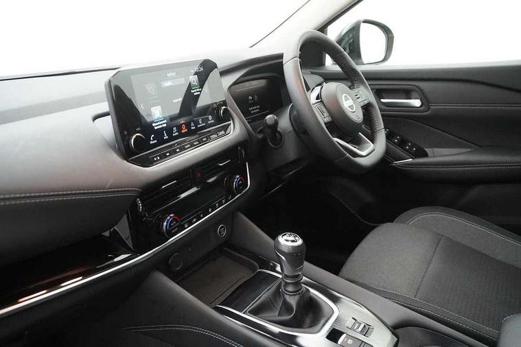 Blind spot warning, Drive modes (sport, normal, eco), Electric speed sensitive power steering, Emergency and breakdown call, Front and rear parking sensors, Full Digital 12.3" TFT Digital Combimeter, Idle stop/start system, Intelligent Cruise control (ICC), Intelligent driver alert system, Intelligent forward collision warning, Intelligent lane intervention, Lane departure prevention, Lane departure warning system, Moving object detection, Push button starter, Rear cross traffic alert, Traffic sign recognition with legal speed adjustment, Trip computer, 6 speakers, AM/FM audio system with DAB, Bluetooth audio streaming, Front USB connections (Type-A and Type-C), Rear USB charging only ports (Type-A and Type-C), 3rd brake light, Auto dimming rear view mirror, Auto rear wiper when reversing, Body colour mirror caps, Body coloured door handles, Bodyside mouldings, Chrome side window finisher, Electric auto folding door mirrors, Electrically adjustable and heated door mirrors with LED turn indicator, Fixed panoramic glass roof with electric sunshade, Follow me home headlights, High beam assist, Intelligent auto headlights, LED daytime running lights, LED rear lights, One touch front and rear electric windows with remote opening and closing, Partially body coloured bumpers, Privacy glass, Rain sensor, Rear roof spoiler, Rear side wing doors, Rear styling plate, Roof rails, Shark fin antenna, Splash free rain sensing wipers, Super UV and infrared cut glass, Three blink turn signal, 12v power socket in dashboard and luggage, 2 way electrical driver lumbar adjustment, 2x Rear coat hooks, 3 bench rear seats in 2nd row, 3 rear headrests, 4 grab handles, 6 Luggage hooks - 4 on floor, 2 on side, 60/40 split folding rear seat bench, Ambient lighting around centre console, Centre console storage tray, Chrome interior door handles, Cloth monoform upholstery, Driver and front passenger sunvisors with illuminated vanity mirrors, Driver seat back pocket, Dual zone automatic climate control with pollen filter, Front centre console and armrest, Front cupholder, Front door with bottle holders, Glovebox with light, Hard trunk cover, Height adjustable driver's seat, Height adjustable front headrests, Leather shift knob, Leather steering wheel, Luggage board system, Luggage space lighting, Manually adjustable passenger (slide recline + lifter), Multifunction steering wheel, Passenger seat back pocket, Rear armrest with 2 cupholders, Rear door bottle holders, Single front passenger seat, Soft PVC kneepad, Steering wheel switches, Tilt/telescopic adjustable steering wheel, Two rear isofix child seat anchorage points with top tether, Welcome light and console tray ambient lighting, Connectivity Pack - Qashqai, Tech Pack (Drive Assist + HUD), 3x3 point rear seatbelt pretensioners + load limiters, ABS, ESP, EBD and brake assist, Active brake limited slip, Auto hold function, Child locks on rear doors, Curtain and front side, far side airbags, Driver and passenger airbags, Driver, passenger and 2nd row rear seat belt reminder, Electronic parking brake, Front seatbelt pretensioners + load limiters, Height adjustable front seatbelts, Hill start assist, Intelligent blind spot intervention, Intelligent front emergency braking with pedestrian, cyclist recognition and junction assist, Intelligent rear automatic braking, Tyre pressure monitoring system, Vehicle dynamic control, Capless fuel filler, Engine immobiliser, Nissan i-key, Remote central door locking with deadlocking, Thatcham Cat.1 alarm, 18" Diamond cut alloy wheels,