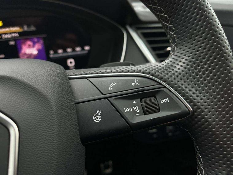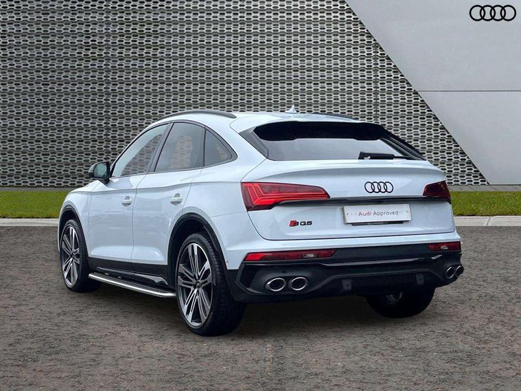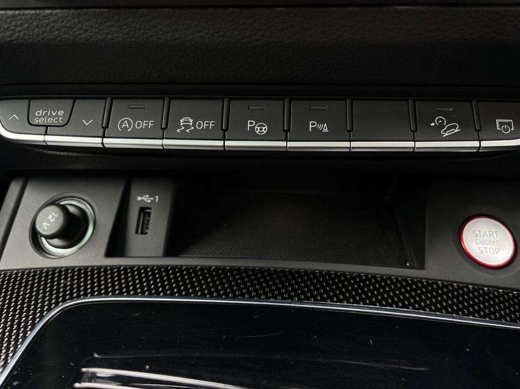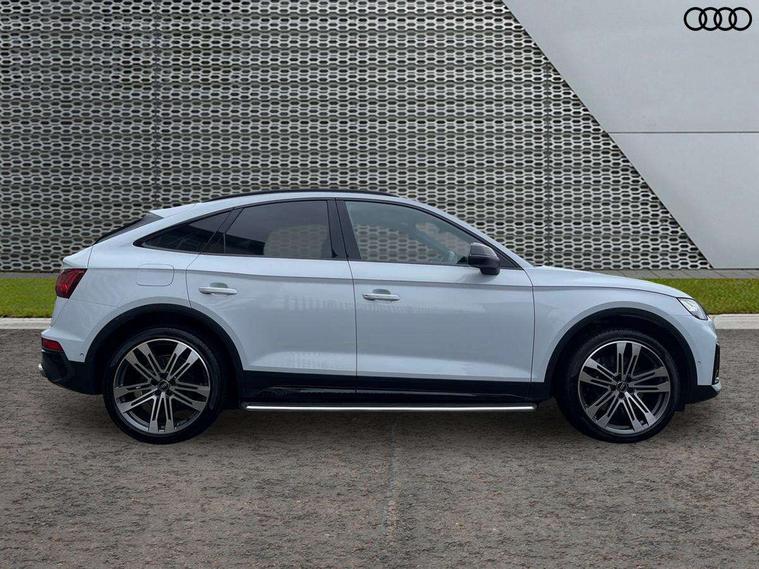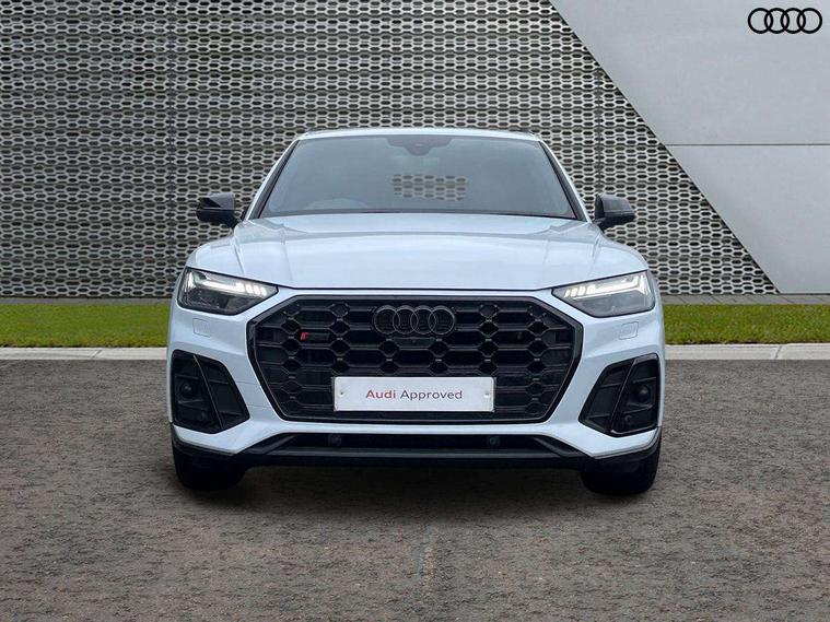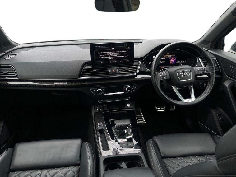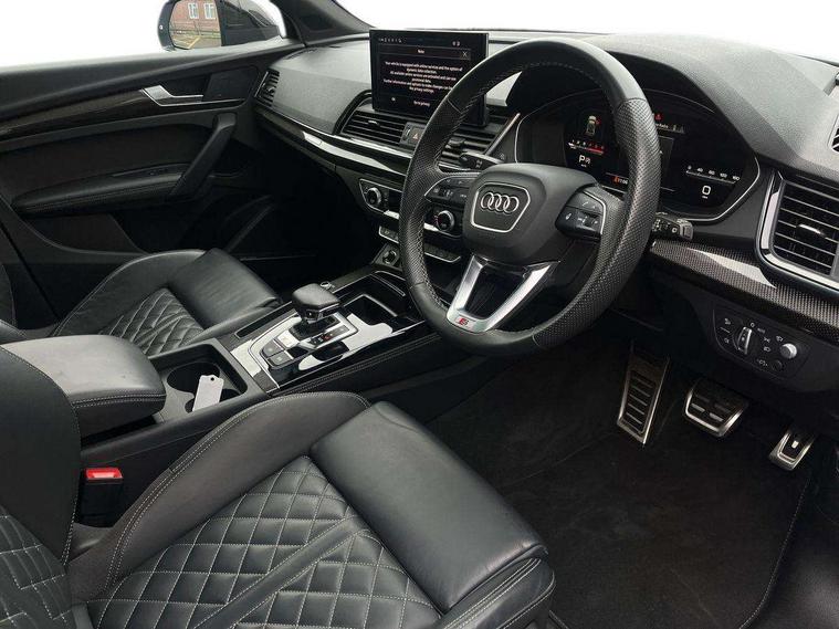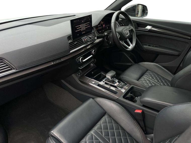 Carbon atlas inlays, Artificial leather pack - Q5, Black styling package - Q5, City Assist pack - Q5, Extended LED Interior multi coloured Lighting Pack - Q5, Tour pack - Q5, Anti theft alarm, Anti-theft wheel bolts, Keyless Go access/ignition system, Remote central locking, Bang + Olufsen sound system, DAB Digital radio, 3 point seatbelts on all seats, 6 airbags - Driver, front passenger, curtain and side airbags, Electrically operated child locks on rear doors, Electromechanical parking brake, Electronic stabilisation control including ABS, ASR and EDL, Front passenger airbag deactivation, Hill descent control, Hill hold assist, Multi collision brake assist, Pop-up bonnet for pedestrian protection, Pre sense city, Seat belt force limiter, Seatbelt monitoring, Tyre pressure warning, Warning triangle and first aid kit, Acoustic windscreen, Audi beam with 'Vorsprung' logo, Audi matrix LED headlights with dynamic front and rear indicators, Auto dimming door mirrors, Auto dimming rear view mirror, Automatic headlights and windscreen wipers, Black roof rails, Body colour underbody protection, Chrome plated exhaust trims, Contrast bumpers in Manhattan grey, Daytime running lights, Door sills in Selenite silver, Electric adjustable/heated/folding door mirrors, Electric panoramic glass sunroof, Front and rear electric windows, Gloss black finish for Audi rings and SQ5 logos, Headlight washers, High gloss black B pillar trims and triangular rear door trim, High level LED brake light, Rear chrome trim strip below lights, Rear privacy glass and rear side windows, Rear side wing doors, Rear spoiler, Rear wiper, Roof bars, S air inlet in titanium black, S front and rear bumpers, S Line side skirts, 2 x USB charging port with aux input socket, 3 rear headrests, 3 spoke flat bottomed multi-function leather steering wheel, 4 way electric lumbar support for driver and front passenger, 40:20:40 split folding 3 rear bench seat in 2nd row with rear centre armrest, Black cloth headlining, Comfort front centre armrest, Contrast stitching on seats, steering wheel and gear lever gaiter, Deluxe 3 zone electronic climate control, Fine Nappa leather upholstery with diamond pattern contrast stitching + front sport seats with S embossed logo, Front head restraints, Front/rear floor mats, Fully electrically adjustable seats, Gear lever in black leather, Heated front and outer rear seats, Illuminated door sill trims with S logo, ISOFIX child seat mounting and top tether, Massage function for front seats, Rear seat bench plus, Removable luggage compartment floor, Single front passenger seat, Stainless steel pedals, Sunvisors with vanity mirrors, Trunk roller cover, 360 degree camera with top view, Advanced key with electric hands free boot opening system, Audi connect safety and service (e-call), Audi connect with Amazon Alexa Integration, Audi drive select, Audi virtual cockpit plus with 12.3" screen and three different layout designs, Audi wireless smartphone interface, Automatic start-stop system with coasting functionality and efficiency programme, Bluetooth interface, Electro - mechanical power assisted steering, Head up Display, MMI navigation plus with 10.1" touch screen, Park assist with parking aid plus, Power tailgate, Service interval indicator, Speed limiter, Voice control system with Audi hotword activation "Hey Audi", 70 litre fuel tank and 24 litre AdBlue tank, Diesel particulate filter, Quattro with sport differential, S adaptive air suspension,