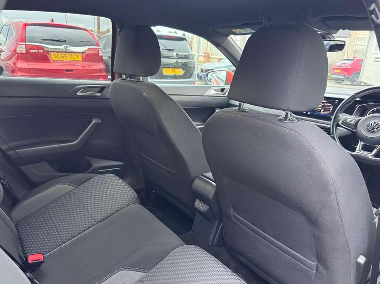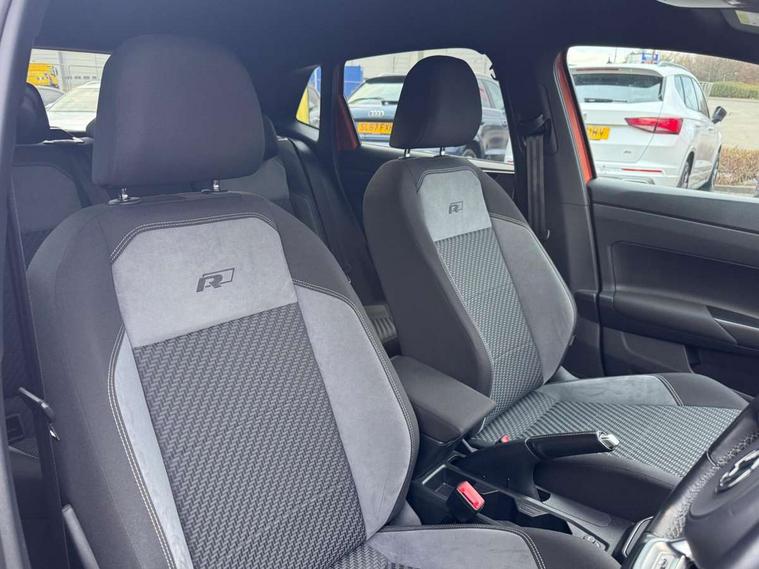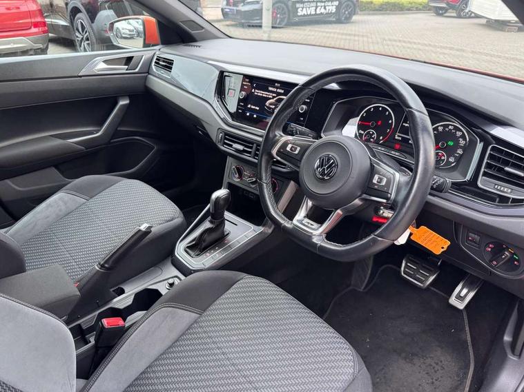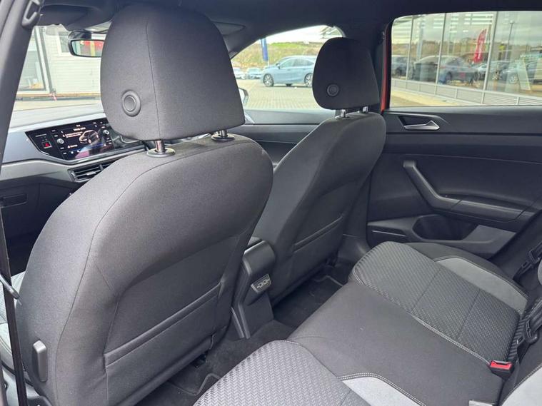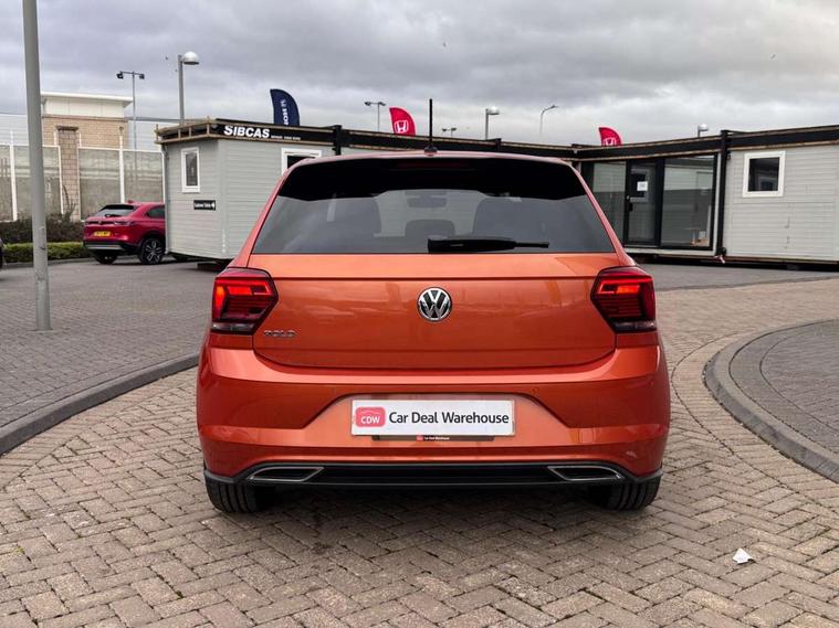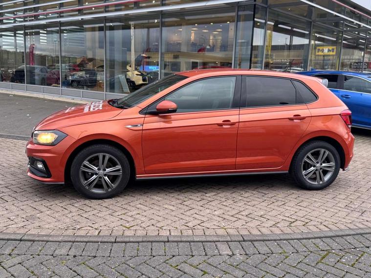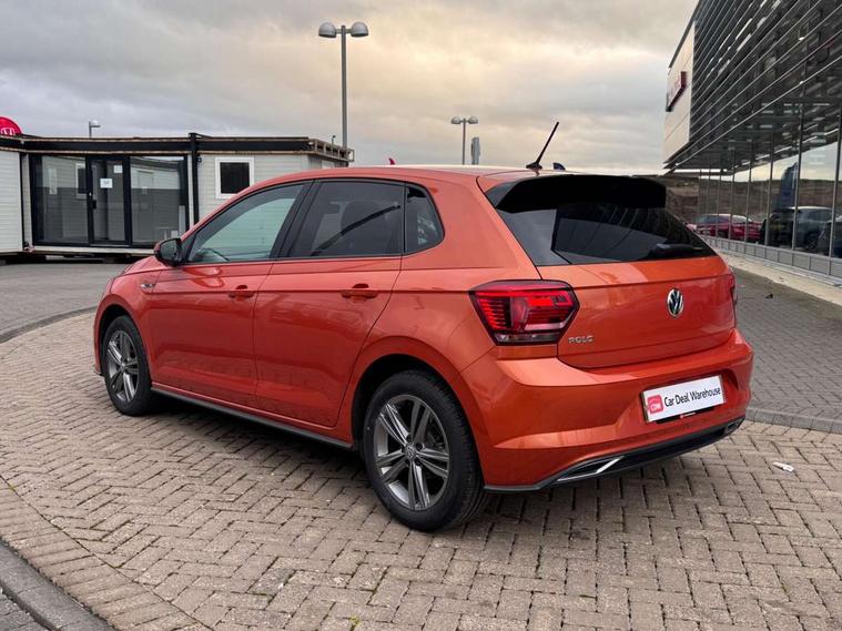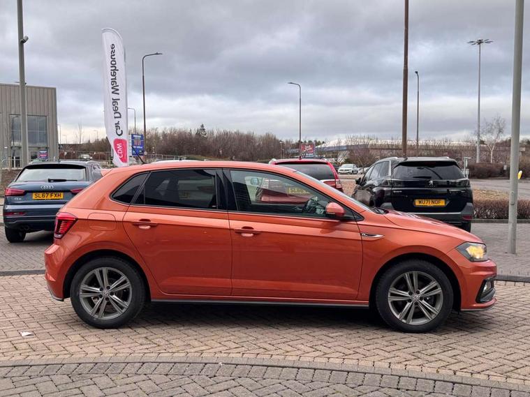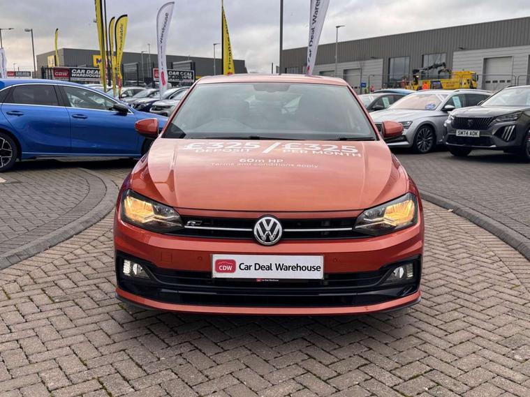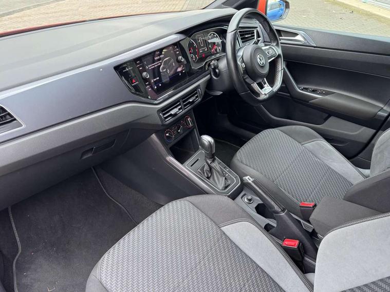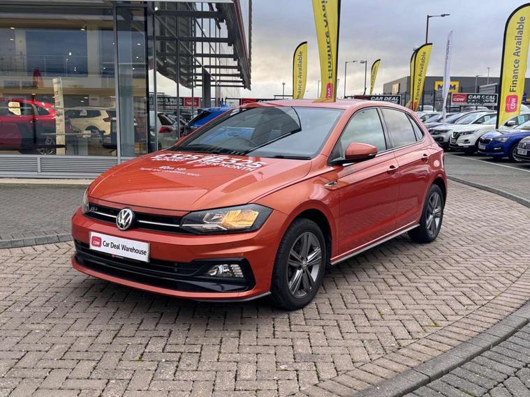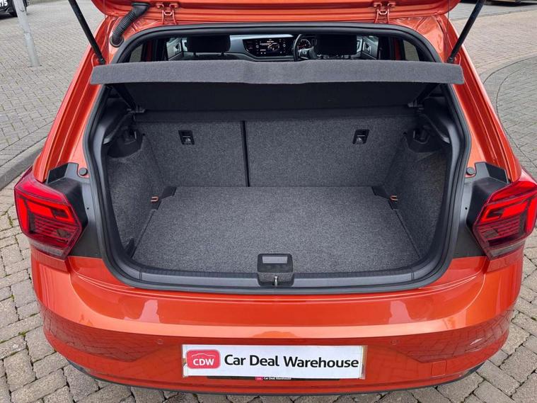 App-Connect, Digital clock, Driver alert system, Lights on warning, Multifunction computer plus, Power assisted speed sensitive steering, Speedo and rev counter, electronic odometer, trip, service interval display and fuel gauge, Start/stop system, Volkswagen connect, Warning buzzer and light for front seatbelts unfastened, Battery regeneration during braking, Galvanished body, Black grille with chrome surround, Body colour door handles, Body coloured side sills, Chrome trimmed strip on lower bumper, Electric front windows, Electrically foldable, adjustable and heated door mirrors with reverse activated kerb view adjustment on passenger's side, Front fog lights including static cornering, Front windscreen washers and wipers with 4 speed intermittent delay, Heat insulating tinted glass, Heated rear window with auto timer, High level 3rd brake light, LED darkened rear light clusters, LED daytime running lights, LED rear number plate lights, Left and right chrome effect trapezoid fascia exhaust tailpipe surrounds, Rear diffuser, Rear electric windows, Rear windscreen washer and wiper with interval delay, reverse activated, Unique R Line badging, 2 bag hooks in luggage compartment, 2 front cupholders and 12 V socket with cover, 3 rear head restraints, 60/40 split folding rear seat, Ambient lighting in front foorwell, front/rear door and dashboard light strips, Carbon flag cloth upholstery, Centre console storage with open storage compartment, Chrome-plated electric mirror adjustment switch surround, Chrome-plated electric window button surround, Driver and front passenger seat height adjustment, Driver and front passenger sunvisors with illuminated vanity mirrors, Dust/pollen filter, Folding rear seat backrest, Front + rear carpet mats, Front centre armrest with storage compartment, Front head restraints, Front seat backrest storage pockets, Front sport seats with lumbar adjustment and R line logo on seat backrest, Gear change selection via paddle shift on steering wheel, Gear lever gaiter in black trim surround, Glovebox, Handbrake grip button in chrome effect, Height/reach adjustable steering column, Instrument lighting, adjustable panel illumination, Interior light with delay, Isofix Preparation 2 Rear child seats, Jack and tool kit, Leather gear knob and handbrake grip, LED interior lighting - 2 reading lights front and rear with interior delay and dimming function, Luggage compartment cover, removable, Luggage compartment lighting, Luggage compartment with variable load floor, Stainless steel pedals, Storage compartment in front doors, Storage compartment in rear doors, Storage compartment under front seats, Three spoke leather trimmed multifunction steering wheel with aluminium inserts and R Line Logo, Titanium black roof lining and sun visors, Unique R Line door sill protectors, Light and sight pack - Polo, R Line styling pack - Polo, 3 point height adj front seatbelts + pretensioners, 3x3 point rear seatbelts, ABS, Automatic post collision braking, Driver/front passenger airbag, Drivers and front passengers safety optimised head restraints, ESP with EDL + ASR, Front and rear passenger curtain airbags, Front passenger airbag deactivation, Front seat side impact airbags, Front/rear disc brakes, Hill hold control, Hydraulic Brake Assist (HBA), Single tone horn, Tyre pressure monitoring system, Alarm with interior protection and deactivation via infotainment system, Electronic engine immobiliser, Remote central locking with 2 remote folding keys, Chrome plated air vent surround, Chrome plated instrument surrounds, Shadow steel decorative inserts, Steel space saver spare wheel,