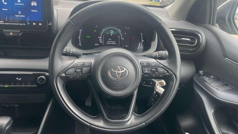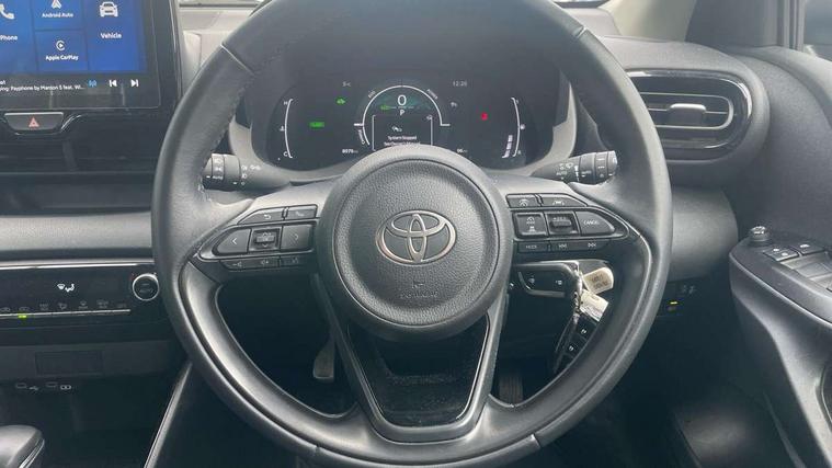 7" Digital Combimeter, Adaptive cruise control, Adjustable speed limit with speed warning, Bluetooth connectivity, Colour binocular inspired displays with digital speedometer, E-call, Electric power steering, Hybrid energy display, Multi information display switches on steering wheel, Reversing camera, Smartphone integration with Apple CarPlay and Android auto, Tailgate, Voice recognition, Vehicle Stability Control (VSC), 4 speakers, 9" Multimedia touch display, Toyota Touch 3 system with DAB radio, USB connection, Acoustic windscreen glass, Auto windscreen wipers, Automatic headlights, Body coloured door mirrors, Electric adjustable heated door mirrors, Follow me home headlights, Front auto power windows with anti jam protection, Full LED rear lights, LED daytime running lights, LED front fog lights, LED front light guide, LED Headlights, LED High mounted stop lamp, LED Indicators, LED rear light guide, Manual headlight levelling, Painted chequered front grille, Rain sensor, Rear auto power windows with anti jam protection, Rear privacy glass, Rear side wing doors, Rear spoiler, Rear wiper, Shark fin antenna, Turning signal integrated indicators in door mirrors, Variable front intermittent wipers, 3 adjustable rear headrests, 3 seat bench in 2nd row, 3 spoke leather steering wheel, 60/40 split folding rear seat, Active headrests, Adjustable boot height, Auto air conditioning, Coat hooks in rear grab handles, Cup holders (2 front & door), Data Communication Module (DCM) connected services, Fabric upholstery, Front armrest, Glovebox, Grey roof lining, Height adjustable driver's seat, Isofix seat fixing, Leather gearshift, Pollen filter, Shopping bag hooks, Single front passenger seat, Tilt/telescopic steering column, 3 point seatbelts on all rear seats, ABS+EBD+Brake assist, Electronic parking brake, Emergency brake light system (EBS), Front passenger airbag on/off switch, Front seatbelt reminder, Hill start assist control (HAC), Rear child proof door locks, Rear seat belt reminder, Supplemental Restraint System (SRS) 8 airbags: Driver & passenger's airbags, dual side curtain airbags, side impact airbags, front centre airbag, Toyota Safety Sense 3 with over the air updates, Tyre pressure warning system, 2x Master key, Alarm/immobiliser, Remote powered central double locking doors, Soft touch instrument panel, Space saver spare wheel,