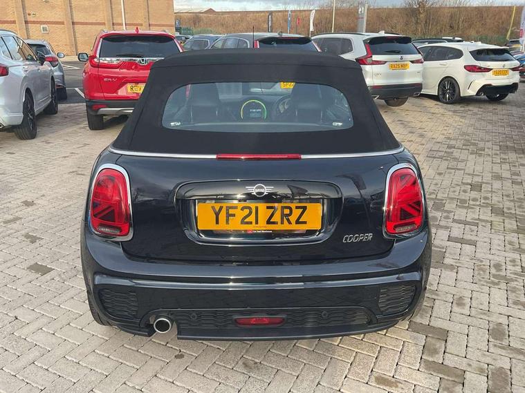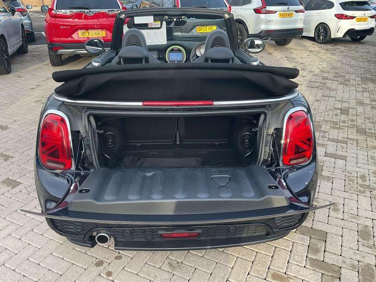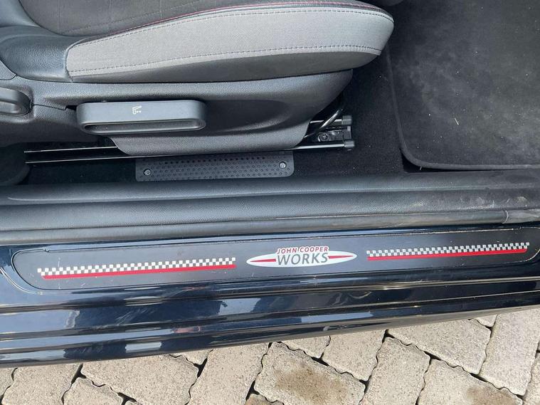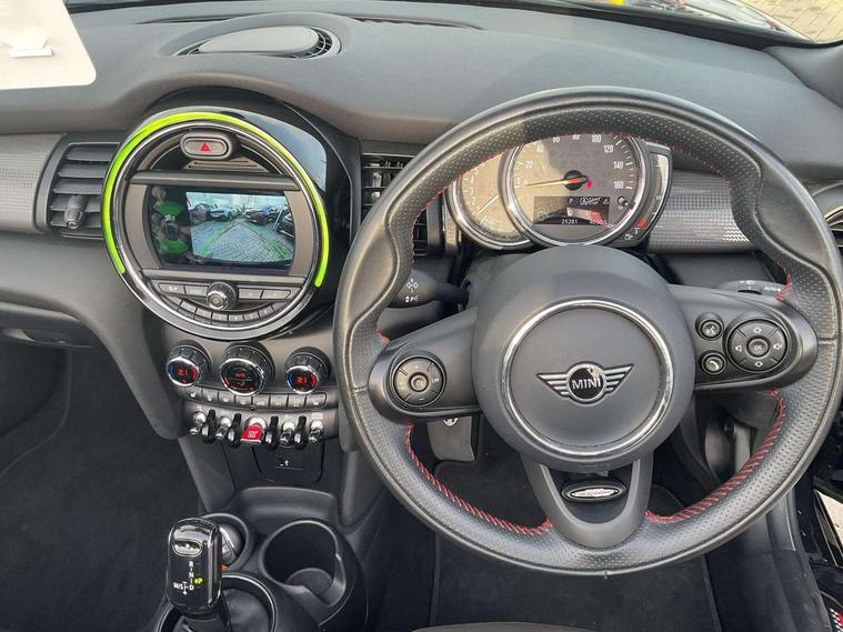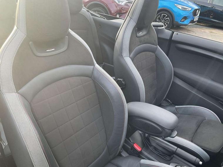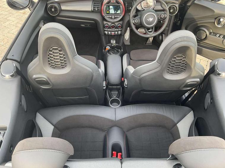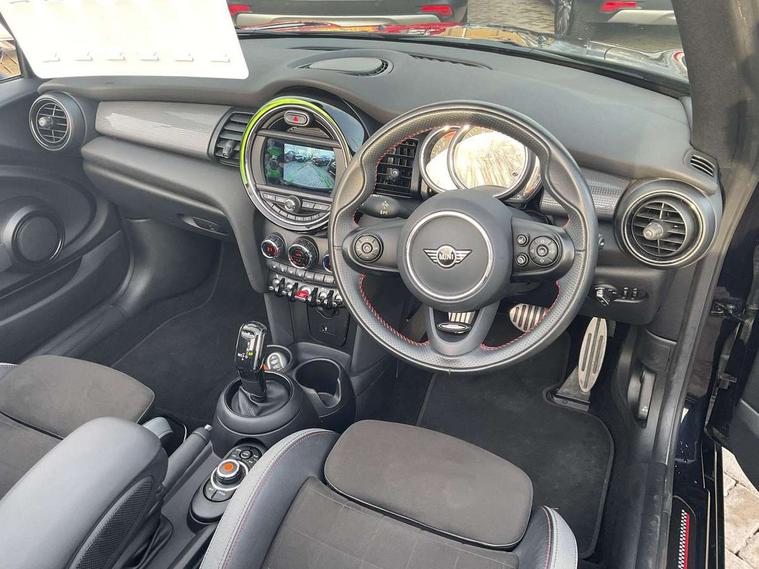 Automatic start/stop function with brake energy recuperation, Compatible mobile phone bluetooth with audio streaming, Electro-mechanical speed dependant steering assistance, Instrument cluster, MINI Driving Modes - centre toggle switch to control driving setting (sport, mid and green), Mini E-call, MINI TeleServices, On board computer, Rear park distance control, Service interval indicator, Double Vanos system, Fully variable valve control, High precision injection, Steptronic transmission with double clutch, 6.5" touchscreen with LED ring, FM tuner and DAB digital radio, Automatic headlight activation switch, Body colour fuel filler cap, Chrome border high gloss black slats radiator grille, Dynamic brake lights, Electric windows, Fully electric black softtop with integrated sunroof functionality, Heated rear window, Heated windscreen washer jets, John Cooper Works - aerodynamic kit (front and rear apron, spoiler), front and rear sport bumpers and part-painted side sills with door sill finishers, LED headlight with closed ring and daytime driving lights, Left exhaust tailpipe with chrome finisher, Metal door sill strips with MINI imprint, Model logo Cooper on right of tailgate, Rain sensor window wipers, Rear fog lights, Rear LED lights with union jack design, Side scuttle panel with integrated indicator, Sun/heat protection glass, White indicator lenses, 12V Accessory socket in centre console, 4 lashing eyes in luggage compartment, 50/50 split folding rear seats, Chrome interior highlights, Cupholders, Easy Load boot handles, Front and rear isofix with front passenger airbag deactivation, Glove compartment, Height and length steering column adjustment, Interior lighting with 12 basic colours selectable via toggle switch in roof, John Cooper Works perforated leather steering wheel with contrast stitching in chilli red and John Cooper Works logo, Leather gearshift lever and handbrake gaiters, Leatherette integrated headrest, adjustable thigh support with john cooper works logo, LED reading lights, vanity mirror lights, front foot well light and spotlight on front seats, Manual air conditioning, Mechanical seat adjustment, driver seat height adjust, forward/back and front seats backrest, Mini logo projection on floor from drivers exterior mirror, Multifunction steering wheel, Rear head restraints, Storage compartments in doors, Sunvisors with vanity mirrors, Convertible pack with comfort access - Mini Convertible, 3 point seatbelts on all four seats, 6 Airbags - front, side and seat belt tensioners, Active rollover protection, Anti-lock braking system (ABS), DSC - Dynamic Stability Control, Front and rear disc brakes, Hill start assist, Single tone fanfare horn, Tyre pressure monitoring system, Alarm system with tilt sensor, monitoring doors, bonnet interior and tailgate, Electronic vehicle immobiliser, Keyless Go, Tool kit,