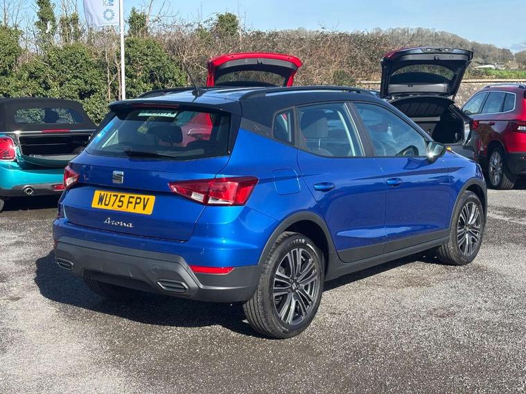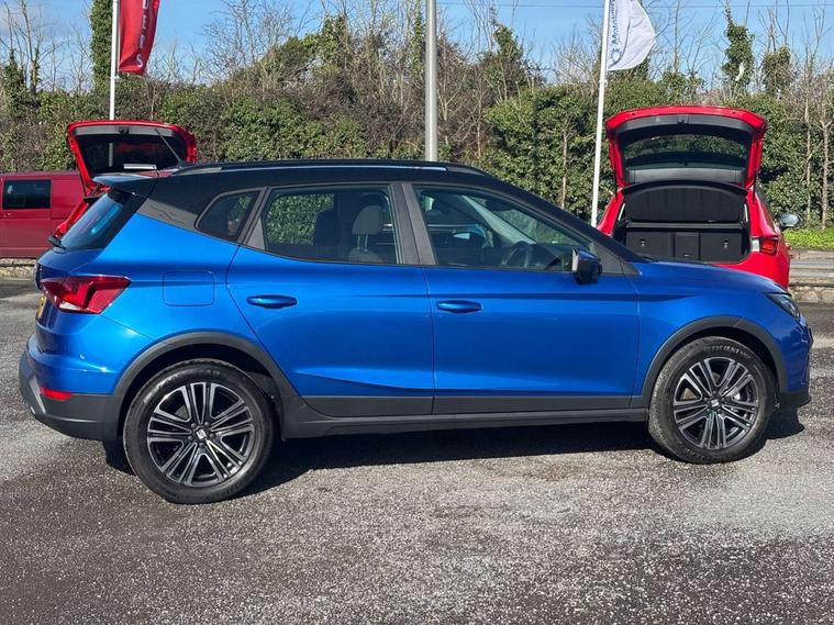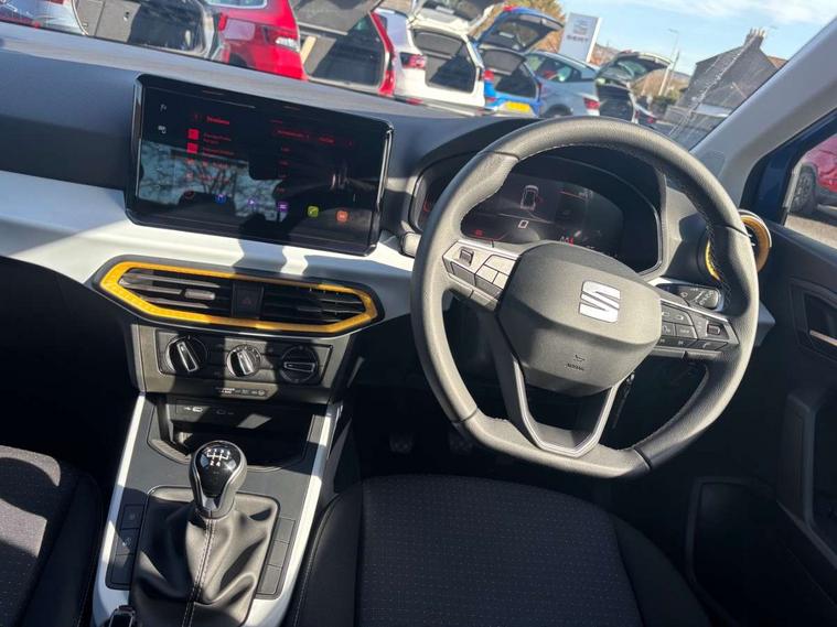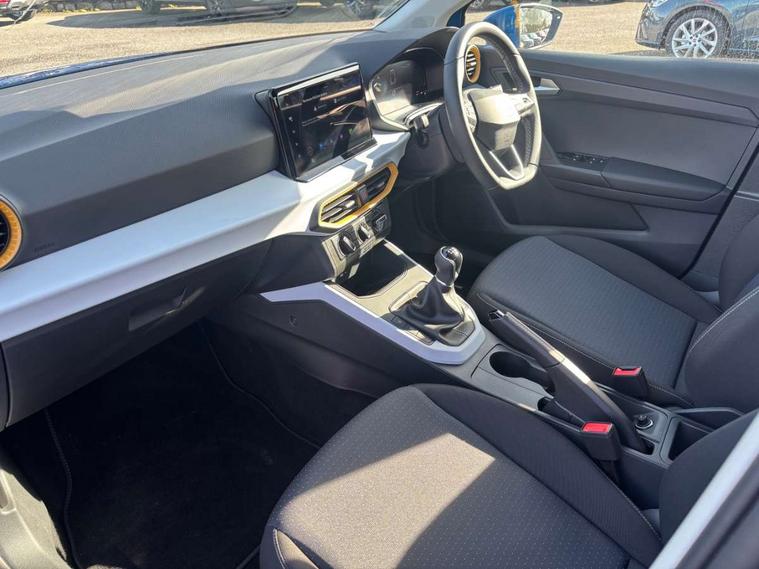 'Lights On' Reminder warning buzzer, 8" Digital cockpit, Cruise control and speed limiter, Digital clock, E-call, Electric speed sensitive power steering, Full link smartphone integration with mirror link, wireless apple carplay, Google android auto + USB Type C cable for apple and android devices, Lane keeping system, Low fuel warning light, Outside temperature display, RPM counter, Trip computer, Wireless phone charger, 9.2" colour touchscreen with navigation system, voice control and USB port (type c), Bluetooth interface for hands free and audio streaming, DAB digital radio and AM/FM radio, Steering wheel mounted audio controls, Anti theft roof antenna, Automatic activation of hazard warning lights, Black roof rails and window surrounds, Body coloured bumpers, Body coloured door handle inserts, Body coloured door mirrors, Dimming rear view mirror, ECO LED automatic headlights and LED daytime running lights, Electric adjustable door mirrors, Electric front/rear windows, Hidden exhaust pipe, LED rear tail lights and licence plate lights, Licence plate lights, Protective side mouldings, Rain sensing wipers, Rear fog lights, Rear side wing doors, Rear spoiler, Rear window wash/wipe, Third brake light, Visible VIN plate, 2 cupholders, 3 seat bench in 2nd row, 60/40 split folding rear seat, Air conditioning, Cloth upholstery, Double boot floor, Driver sunvisor with covered mirror + card holder, Dust/pollen filter, Gear shift indicator, Grey interior air vents, Grey interior roof, Height adjustable front seats, Height/reach adjustable steering column, Illuminated boot, Instrument lighting with brightness control, ISOFIX points in outer rear seats with top tether anchorage points, Leather steering wheel/gear knob/handbrake, Passenger sunvisor with vanity mirror, Potentiometer, Single front passenger seat, Two front and three rear height adjustable headrests, Interior chrome pack - Arona, Safe and driving pack (S) - Arona, 3 point seatbelts on all rear seats, ABS, Active front headrests, Child locks on rear doors, Driver and front passenger airbags with front passenger airbag de activation, front side and curtain airbags, Emergency Brake Assist (EBA) and front assist, Forward collision warning and autonomous emergency braking, Front and rear seatbelt reminder, Hill hold control, Multi-Collision braking, Tiredness recognition system, Traction control, Tyre pressure monitoring system, Deadlock, Electronic engine immobiliser, Locking wheel bolts, Remote central locking, Titan black dashboard, 17" Dynamic machined alloy wheels,
