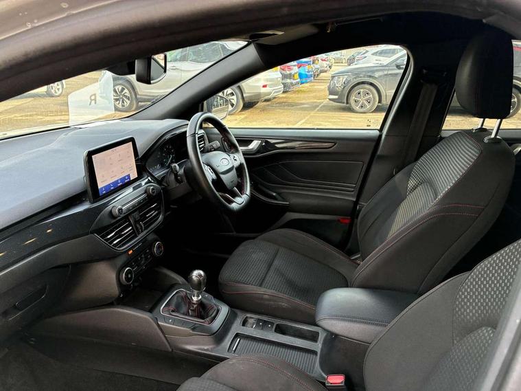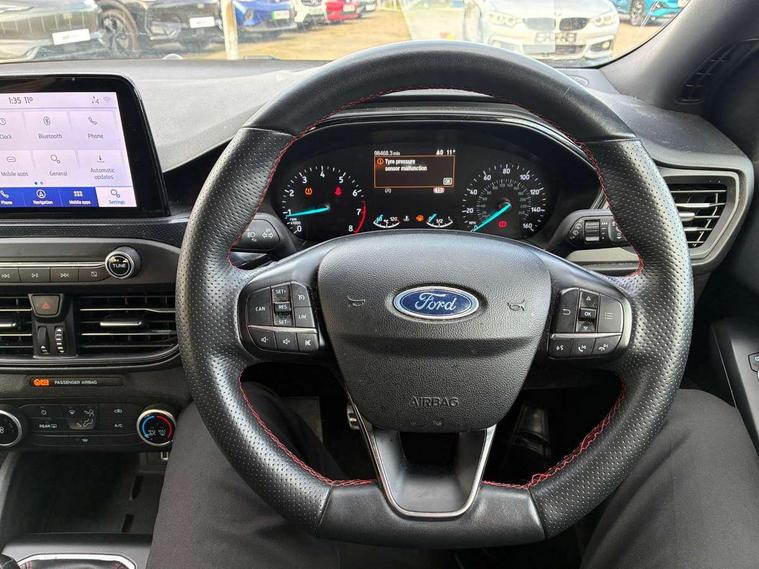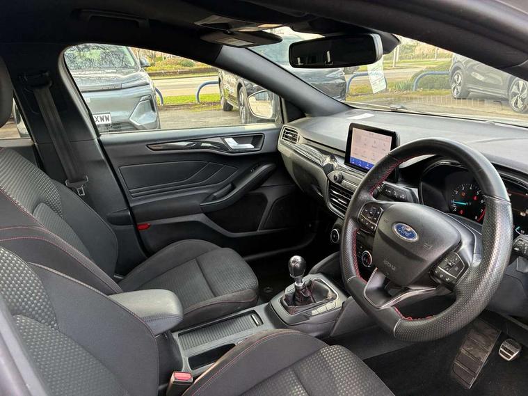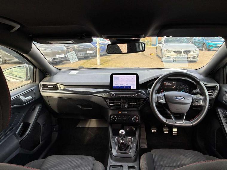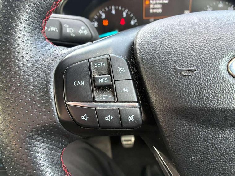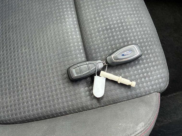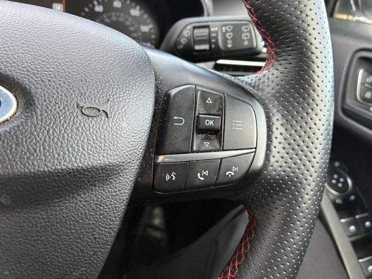 4.2" TFT coloured cluster, Bluetooth system, Digital clock, Easy fuel capless refuelling system, Eco mode, Ford SYNC 3 navigation with 8" TFT touchscreen, DAB radio and app link Android auto/Apple carplay, Intelligent speed assist, Lane keeping system - lane keeping alert and lane keeping aid, PAS, Selectable drive mode, Trip computer, Wireless charging pad, Sports tuned suspension, 2 USB ports, Aux input, Auto dimming rear view mirror, Auto headlamps (on/off), Automatic rain sensing wipers, Body colour large rear spoiler, Body coloured bumpers, Body coloured door handles, Body coloured electrically operated and heated door mirrors with side indicators, Electrically operated front and rear windows with one touch opening and closing, Front variable intermittent wipers with electric wash, Heated rear window, LED daytime running lamp, LED front fog lamps with cornering function, LED reflector headlamps, Polished twin tailpipe, Power folding door mirrors with puddle lights, Quickclear heated windscreen, Rear privacy glass, ST-Line upper and lower grille with full body styling kit and wing badges, Tailgate wash/wipe, 3 spoke flat bottomed leather steering wheel with red stitching, Alloy finish pedals, Aluminium gear knob, Cloth upholstery, Dark headliner, Driver's lumbar support, Front floor mats, Height adjustable front headrests, Isofix child seat preparation, Manual air conditioning, Reach + rake adjustable steering column, Rear centre headrest, 3x3 point rear seatbelts, ABS+Electronic Brake force Distribution, Auto hold function, Driver airbag, Electronic parking brake, Electronic stability control, Front and rear seatbelt reminder, Front inertia reel height adjustable seatbelts with pre-tensioners, Front passenger airbag, Front side airbags, Hill start assist, Passenger airbag deactivate switch, Post collision braking, Pre collision assist with autonomous emergency braking and pedestrian/cyclist detection, Side curtain airbags, Three rear inertia reel lap/diagonal seatbelts, Tyre pressure monitoring system, Ford keyfree system with Keyless entry and keyless start/sleep mode key fob, MyKey system, Remote central locking & engine immobiliser, Thatcham category 1 alarm, 17" 5x2 spoke alloy wheels with rock metallic finish, Mini steel spare wheel,