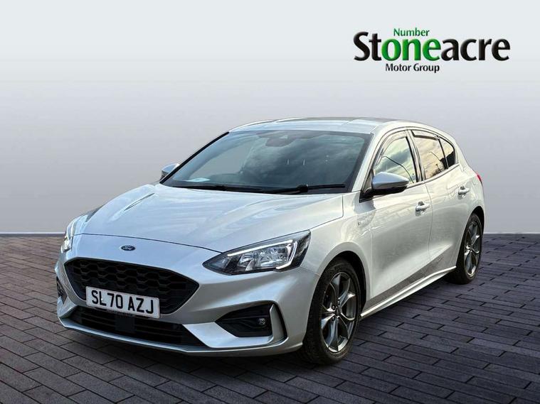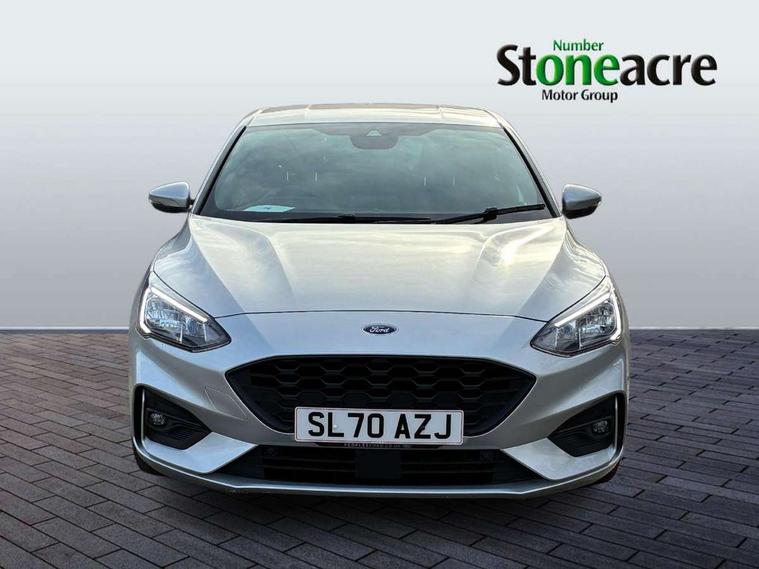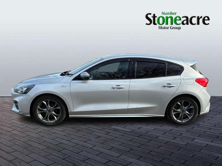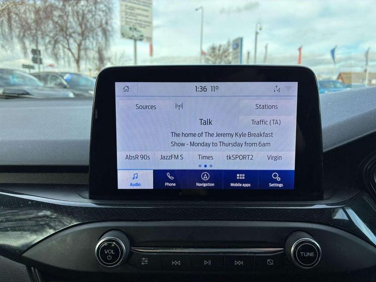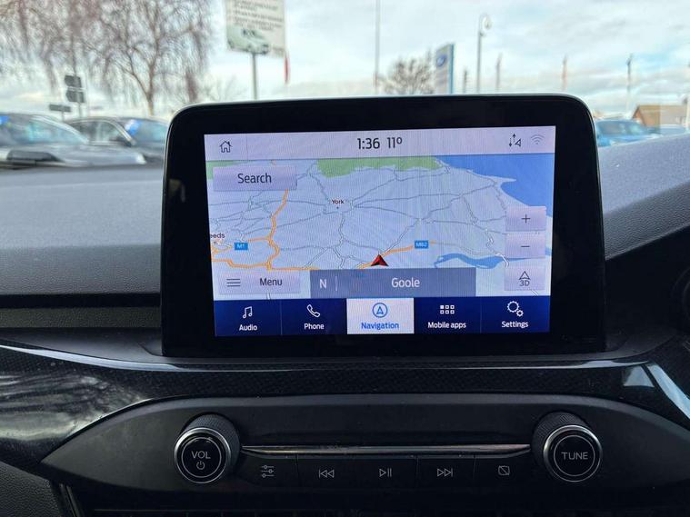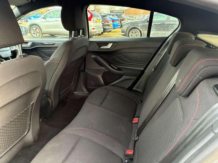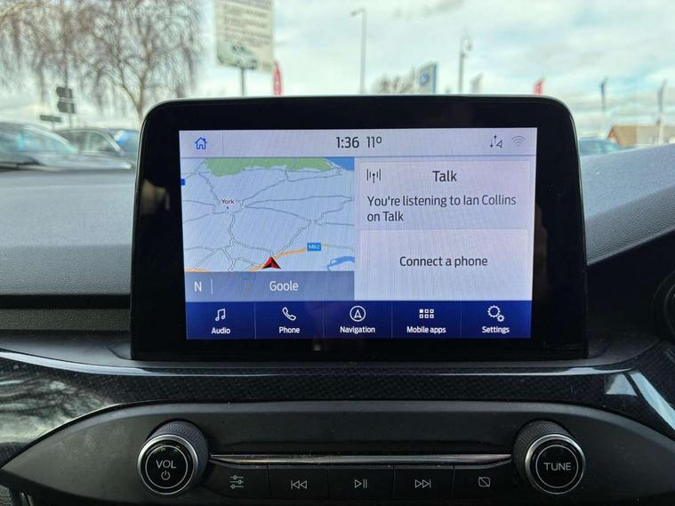 4.2" TFT coloured cluster, Bluetooth system, Digital clock, Easy fuel capless refuelling system, Eco mode, Ford SYNC 3 navigation with 8" TFT touchscreen, DAB radio and app link Android auto/Apple carplay, Intelligent speed assist, Lane keeping system - lane keeping alert and lane keeping aid, PAS, Selectable drive mode, Trip computer, Wireless charging pad, Sports tuned suspension, 2 USB ports, Aux input, Auto dimming rear view mirror, Auto headlamps (on/off), Automatic rain sensing wipers, Body colour large rear spoiler, Body coloured bumpers, Body coloured door handles, Body coloured electrically operated and heated door mirrors with side indicators, Electrically operated front and rear windows with one touch opening and closing, Front variable intermittent wipers with electric wash, Heated rear window, LED daytime running lamp, LED front fog lamps with cornering function, LED reflector headlamps, Polished twin tailpipe, Power folding door mirrors with puddle lights, Quickclear heated windscreen, Rear privacy glass, ST-Line upper and lower grille with full body styling kit and wing badges, Tailgate wash/wipe, 3 spoke flat bottomed leather steering wheel with red stitching, Alloy finish pedals, Aluminium gear knob, Cloth upholstery, Dark headliner, Driver's lumbar support, Front floor mats, Height adjustable front headrests, Isofix child seat preparation, Manual air conditioning, Reach + rake adjustable steering column, Rear centre headrest, 3x3 point rear seatbelts, ABS+Electronic Brake force Distribution, Auto hold function, Driver airbag, Electronic parking brake, Electronic stability control, Front and rear seatbelt reminder, Front inertia reel height adjustable seatbelts with pre-tensioners, Front passenger airbag, Front side airbags, Hill start assist, Passenger airbag deactivate switch, Post collision braking, Pre collision assist with autonomous emergency braking and pedestrian/cyclist detection, Side curtain airbags, Three rear inertia reel lap/diagonal seatbelts, Tyre pressure monitoring system, Ford keyfree system with Keyless entry and keyless start/sleep mode key fob, MyKey system, Remote central locking & engine immobiliser, Thatcham category 1 alarm, 17" 5x2 spoke alloy wheels with rock metallic finish, Mini steel spare wheel,