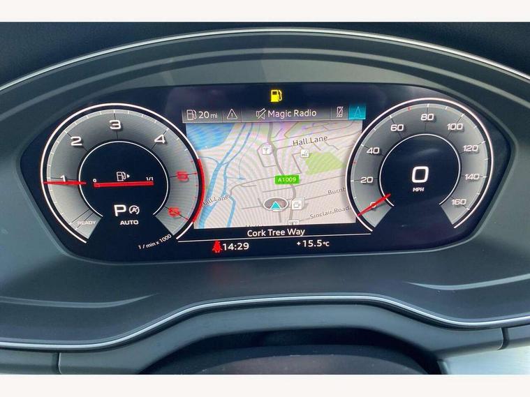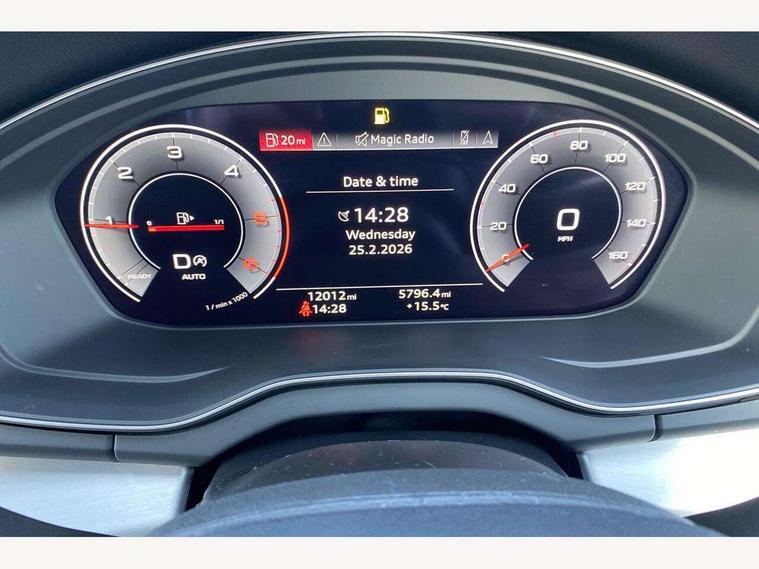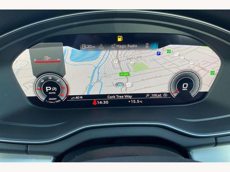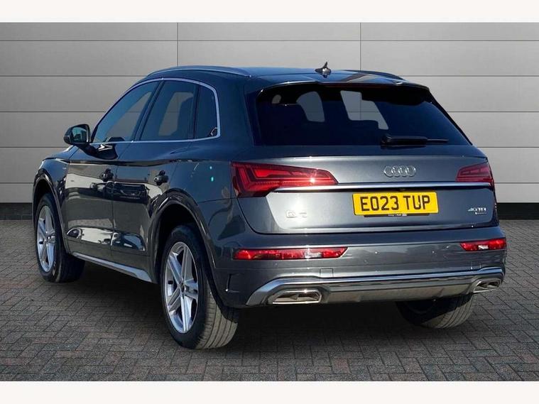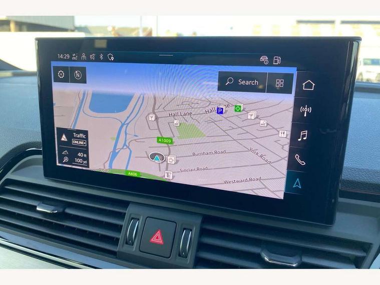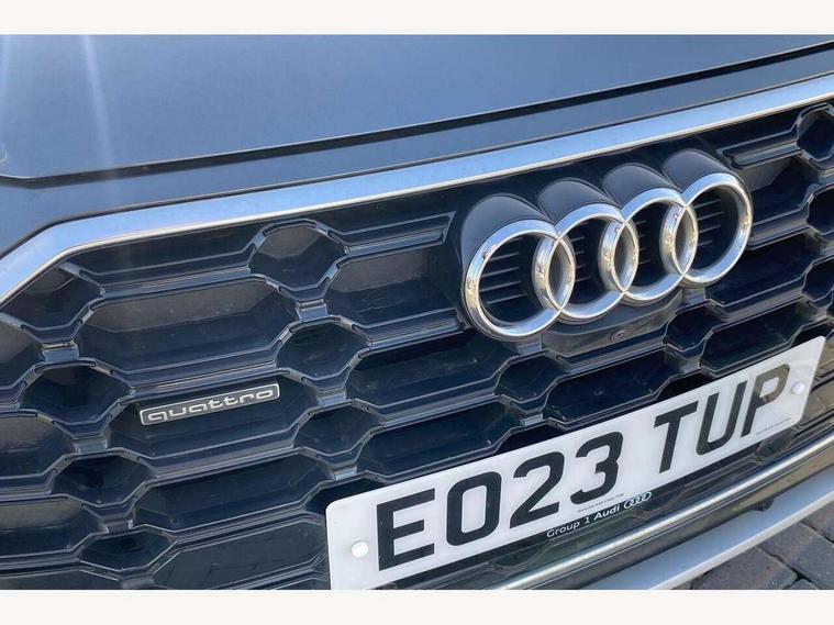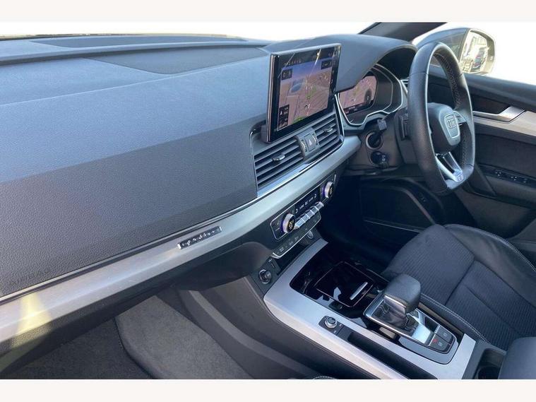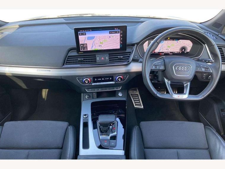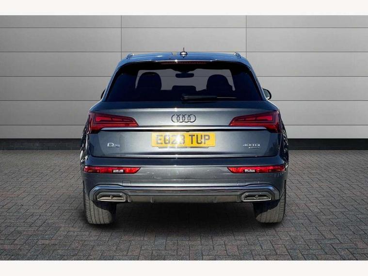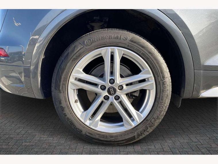 Acoustic front and rear parking sensor, Audi connect safety and service (e-call), Audi connect with Amazon Alexa Integration, Audi drive select, Audi virtual cockpit plus with 12.3" screen and three different layout designs, Audi wireless smartphone interface, Automatic start-stop system with coasting functionality and efficiency programme, Bluetooth interface, Electro - mechanical power assisted steering, MMI navigation plus with 10.1" touch screen, Power tailgate, Reversing camera, Service interval indicator, Voice control system with Audi hotword activation "Hey Audi", Diesel particulate filter, Quattro on demand, S line sports suspension, 2 x USB charging port with aux input socket, 8 loudspeakers, DAB Digital radio, Acoustic windscreen, Aluminium roof rails, Audi matrix LED headlights with dynamic front and rear indicators, Auto dimming door mirrors, Auto dimming frameless rear view mirror, Automatic headlight adjustment, Automatic headlights and windscreen wipers, Body colour bumpers, Body colour door mirrors, Body colour rear diffuser with matt aluminium silver surrounds, Body colour underbody protection, Chrome plated exhaust trims, Daytime running lights, Door sills in Selenite silver, Electric adjustable/heated/folding door mirrors, Front air inlet surrounds in aluminium, Front and rear electric windows, Front radiator grille in honeycomb design, Headlight washers, High level LED brake light, Lower bumpers painted in contrast Manhattan grey, Rear chrome trim strip below lights, Rear privacy glass and rear side windows, Rear side wing doors, Rear wiper, Roof bars, S Line badges on the front wings, S Line front and rear bumpers, S Line rear spoiler, S Line side skirts, 3 rear headrests, 3 spoke leather multifunction steering wheel with S badging perforated leather grips, 40:20:40 split folding 3 rear bench seat in 2nd row with rear centre armrest, Black cloth headlining, Comfort front centre armrest, Contrast stitching on seats, steering wheel and gear lever gaiter, Deluxe 3 zone electronic climate control, Front/rear floor mats, Gear lever in black leather, Heated front seats, Height adjustable front head restraints, Height/reach adjustable steering column, Illuminated door sill trims with S logo, Luggage compartment cover, Manual seat adjustment with 4-way electric lumbar support, Removable luggage compartment floor, Single front passenger seat, Stainless steel pedals, Sunvisors with vanity mirrors, High gloss pack - Q5, LED interior light pack - Q5, 3 point seatbelts on all seats, 6 airbags - Driver, front passenger, curtain and side airbags, Electrically operated child locks on rear doors, Electromechanical parking brake, Electronic stabilisation control including ABS, ASR and EDL, First aid kit with warning triangle and vests, Front passenger airbag deactivation, Hill descent control, Hill hold assist, ISOFIX child seat mounting for front passenger seat and ISOFIX child seat mounting with Top Tether for outer rear seats, Multi collision brake assist, Pop-up bonnet for pedestrian protection, Pre sense city, Seat belt force limiter, Seatbelt monitoring, Tyre pressure warning, Anti theft alarm, Anti-theft wheel bolts, Keyless Go access/ignition system, Remote central locking, Air vents inserts and centre console in gloss black, Matt brushed aluminium inlays,