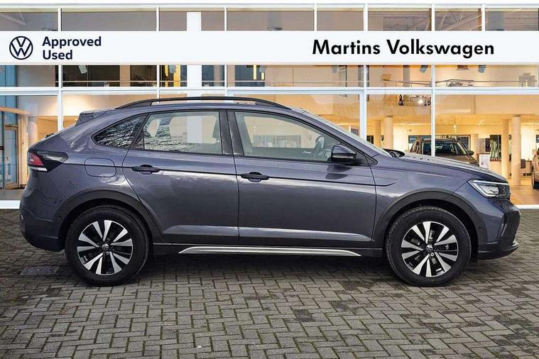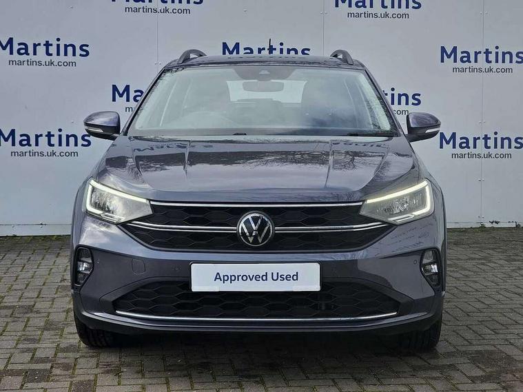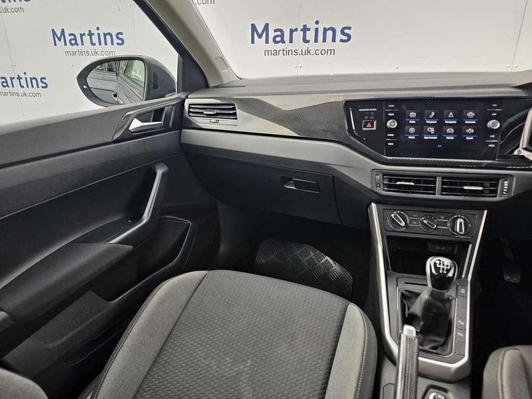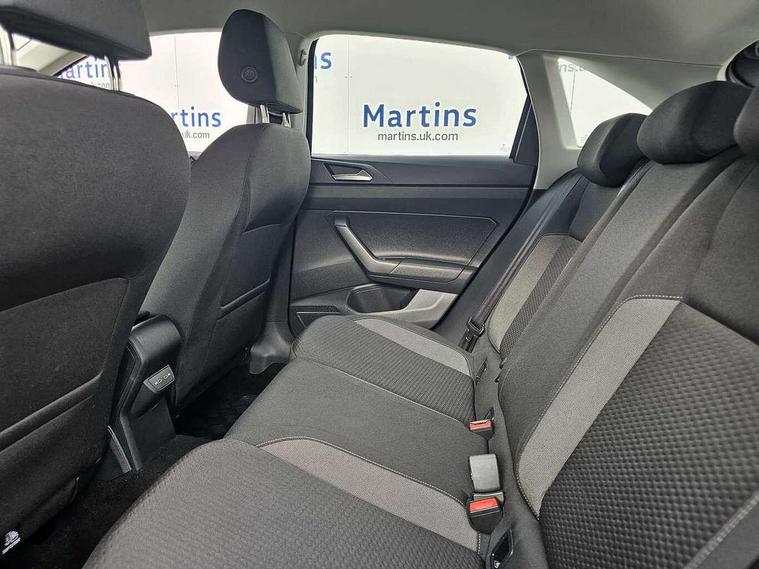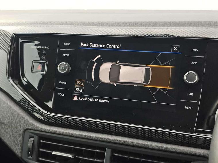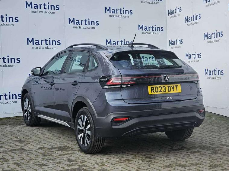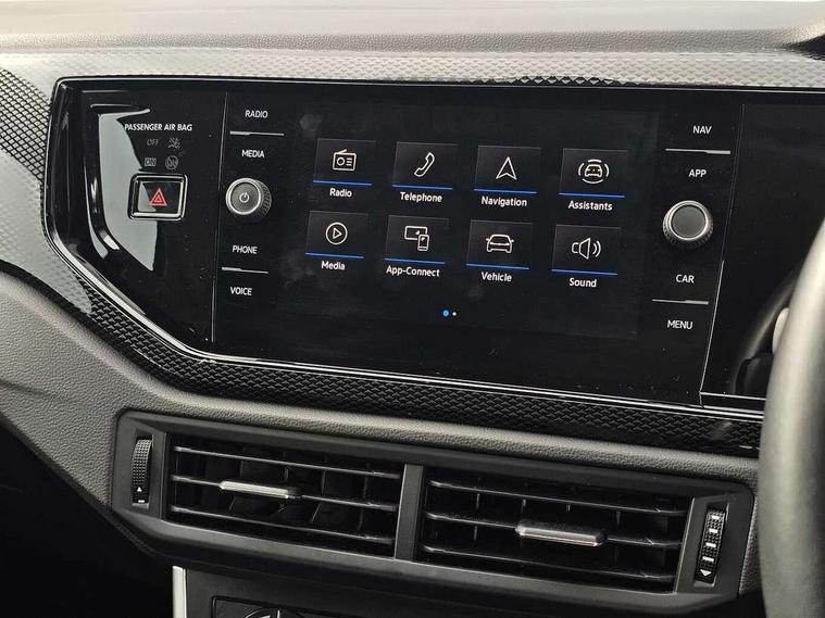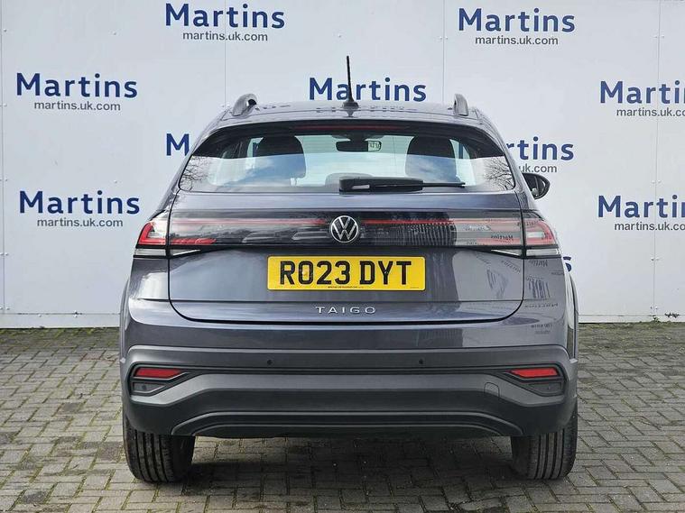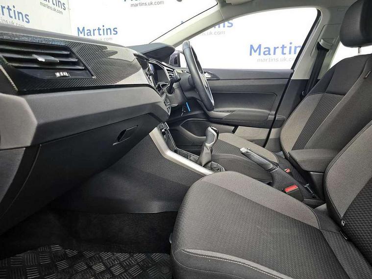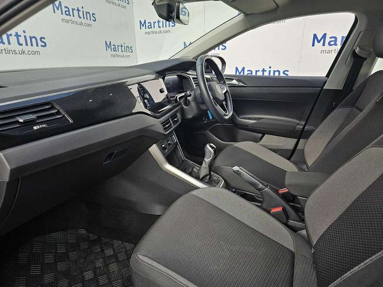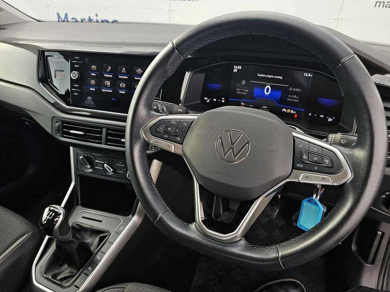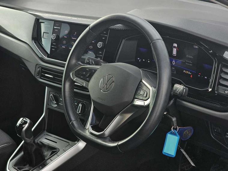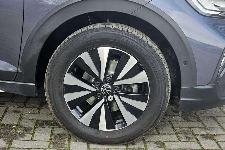 Driver alert system, e-Call (emergency call), Power Steering, Travel assist including emergency assist, Washer fluid level indicator, Wireless Charging including Bluetooth, Start-stop system with battery regeneration (recuperation - energy recovery during braking), WeConnect plus, Ambient lighting with logo projection, Aspherical driver's exterior mirror, Auto headlights, Body coloured bumpers, Body coloured exterior mirror housings and door handles, Electric windows, External USB type C socket and charging sockets, Front fog lamps with cornering function, Headlight range control, Heat insulating glass windscreen, LED headlamps, LED rear combination lamp, LED third brake light, Left convex exterior mirror, Power folding adjustable/heated exterior mirrors and front passenger exterior mirror lowering function, Rear fog light on one side, reversing light on both sides, Rear side wing doors, Rear wash/wipe with intermittent wipe setting, 'Slash/ Austin' Cloth upholstery, 12V socket in centre console, 2 front reading lights, 3 rear head restraints, 3 seat bench in 2nd row, Black carpets, Child seat anchor for child seat system i-Size, 2x top tether and child seat anchor in front on front passenger side, Door and side trim panels in titan black, Driver and front passenger seat height adjustment, Front centre armrest, Handbrake lever handle in leather, Height and reach adjustable steering wheel, Leather trimmed gear knob, Leather wrapped multifunction steering wheel, Luggage compartment floor, Luggage compartment light, Lumbar support for driver's and front passengers seat, Seat covers in titanium black, Single front passenger seat, Split folding backrest with centre armrest and unsplit rear seat bench, Storage compartment under front seats, Sun visors with illuminated vanity mirrors, Chrome Package - Taigo, Drivers assistance pack - Taigo, Light and Sight pack including High beam assist - Taigo, 2 x 3-point seatbelts/outer rear seats with ECE label, 3-point seat belts in front with pretensioner and height adjustment, 3-point seatbelt for centre rear seat, Driver and front passenger airbags with front passenger airbag de-activation, front side and curtain airbags, Driver and front passenger safety-optimised head restraints, Electronic stability control, Extended and predictive pedestrian/ cyclist protection, Front and rear disc brakes, Front curtain and side airbags with center airbag, Hill start assist, Manual rear child locks, Single tone horn, Tyre pressure loss indicator, Anti-theft alarm system with interior monitoring, backup horn, and towing protection, Anti-theft wheel bolts, Lava stone black gloss/matt decorative inserts in dash and front door panels, Low rolling resistance tyres,