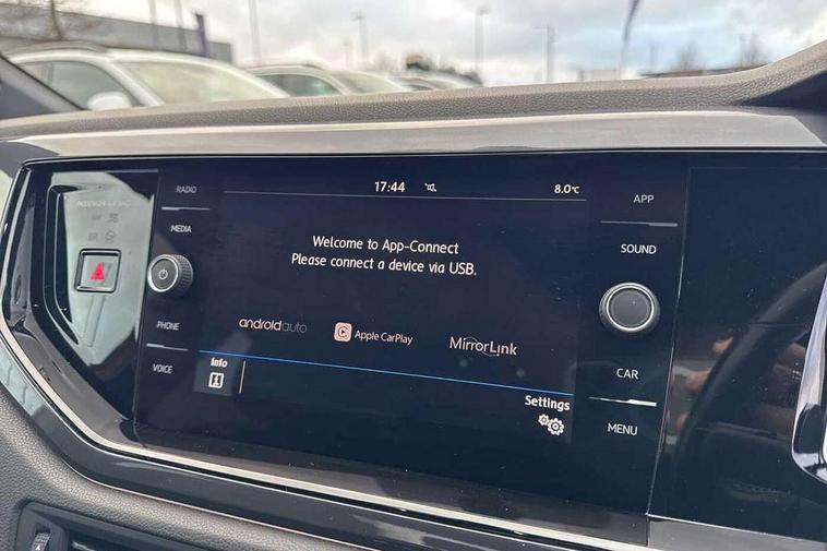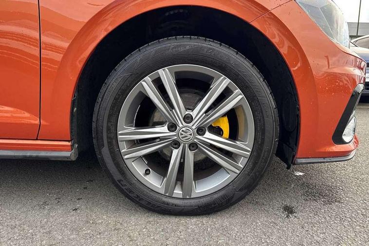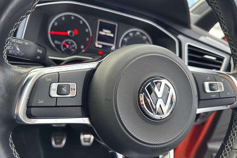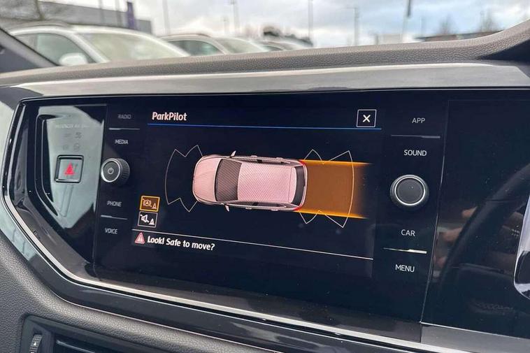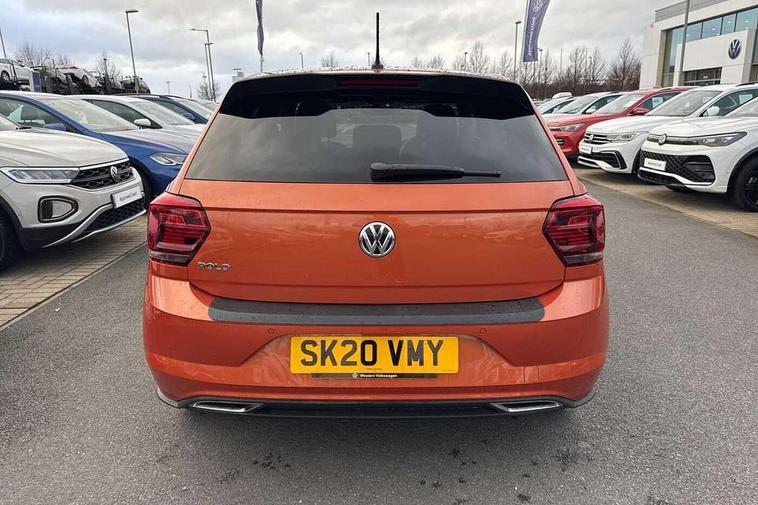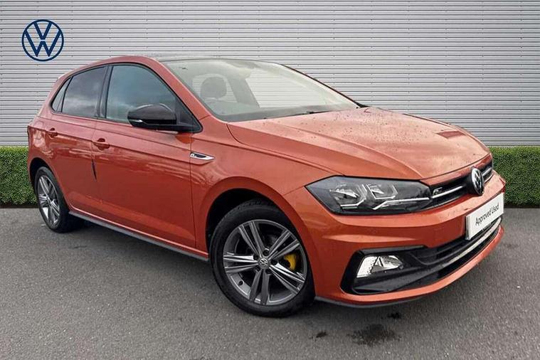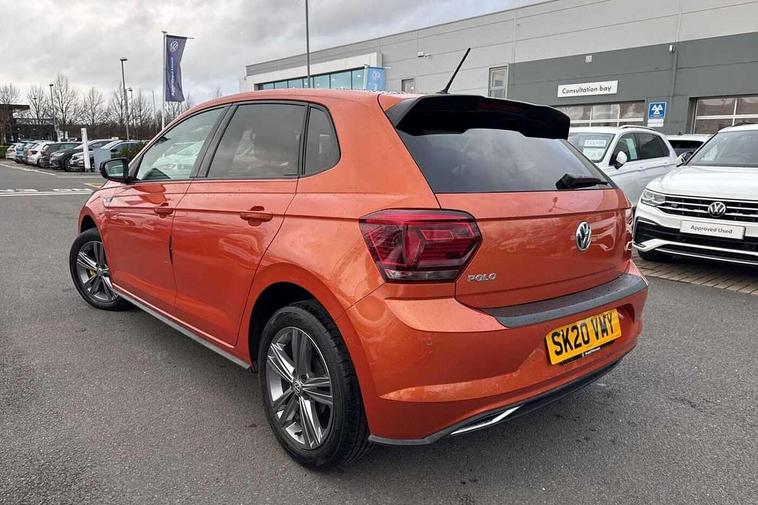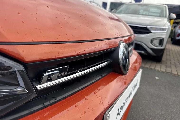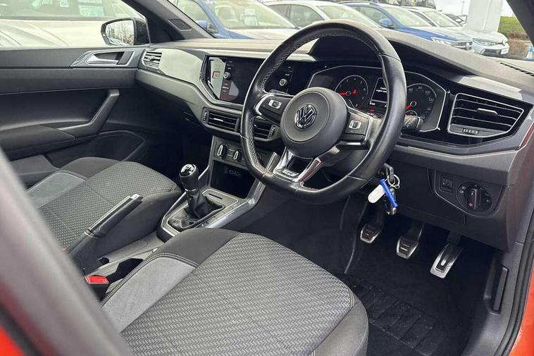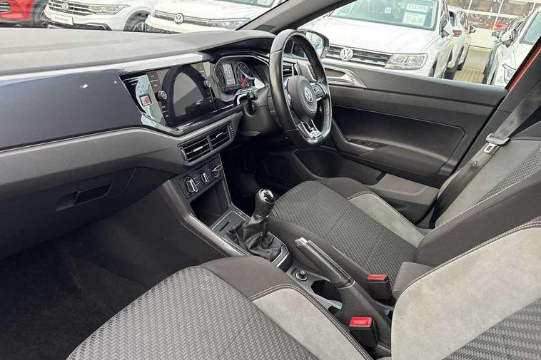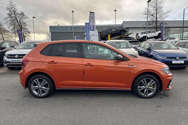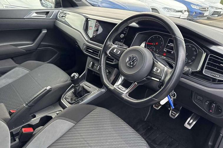 App-Connect, Digital clock, Driver alert system, Lights on warning, Multifunction computer plus, Power assisted speed sensitive steering, Speedo and rev counter, electronic odometer, trip, service interval display and fuel gauge, Start/stop system, Volkswagen connect, Warning buzzer and light for front seatbelts unfastened, Battery regeneration during braking, Galvanished body, Black grille with chrome surround, Body colour door handles, Body coloured side sills, Chrome trimmed strip on lower bumper, Electric front windows, Electrically foldable, adjustable and heated door mirrors with reverse activated kerb view adjustment on passenger's side, Front fog lights including static cornering, Front windscreen washers and wipers with 4 speed intermittent delay, Heated rear window with auto timer, High level 3rd brake light, LED darkened rear light clusters, LED daytime running lights, LED rear number plate lights, Left and right chrome effect trapezoid fascia exhaust tailpipe surrounds, Rear diffuser, Rear electric windows, Rear windscreen washer and wiper with interval delay, reverse activated, Unique R Line badging, 2 bag hooks in luggage compartment, 2 front cupholders and 12 V socket with cover, 3 rear head restraints, 60/40 split folding rear seat, Ambient lighting in front foorwell, front/rear door and dashboard light strips, Carbon flag cloth upholstery, Centre console storage with open storage compartment, Chrome-plated electric mirror adjustment switch surround, Chrome-plated electric window button surround, Driver and front passenger seat height adjustment, Driver and front passenger sunvisors with illuminated vanity mirrors, Dust/pollen filter, Folding rear seat backrest, Front + rear carpet mats, Front centre armrest with storage compartment, Front head restraints, Front seat backrest storage pockets, Front sport seats with lumbar adjustment and R line logo on seat backrest, Gear lever gaiter in black trim surround, Glovebox, Handbrake grip button in chrome effect, Height/reach adjustable steering column, Instrument lighting, adjustable panel illumination, Interior light with delay, Isofix Preparation 2 Rear child seats, Jack and tool kit, Leather gear knob and handbrake grip, LED interior lighting - 2 reading lights front and rear with interior delay and dimming function, Luggage compartment cover, removable, Luggage compartment lighting, Luggage compartment with variable load floor, Stainless steel pedals, Storage compartment in front doors, Storage compartment in rear doors, Storage compartment under front seats, Three spoke leather trimmed multifunction steering wheel with aluminium inserts and R Line Logo, Titanium black roof lining and sun visors, Unique R Line door sill protectors, Light and sight pack - Polo, R Line styling pack - Polo, 3 point height adj front seatbelts + pretensioners, 3x3 point rear seatbelts, ABS, Automatic post collision braking, Driver/front passenger airbag, Drivers and front passengers safety optimised head restraints, ESP with EDL + ASR, Front and rear passenger curtain airbags, Front passenger airbag deactivation, Front seat side impact airbags, Front/rear disc brakes, Hill hold control, Hydraulic Brake Assist (HBA), Single tone horn, Tyre pressure monitoring system, Alarm with interior protection and deactivation via infotainment system, Electronic engine immobiliser, Remote central locking with 2 remote folding keys, Chrome plated air vent surround, Chrome plated instrument surrounds, Shadow steel decorative inserts, Steel space saver spare wheel,