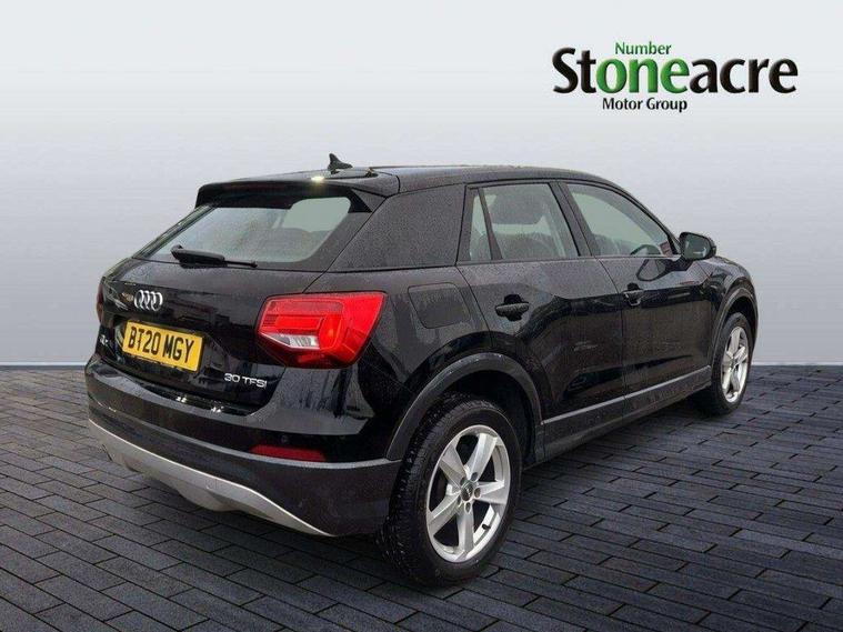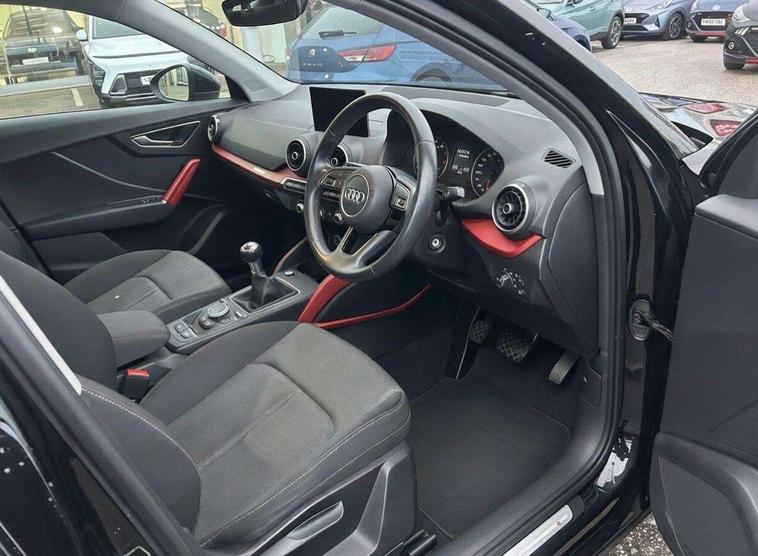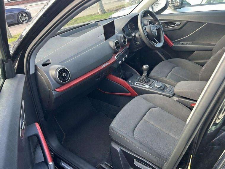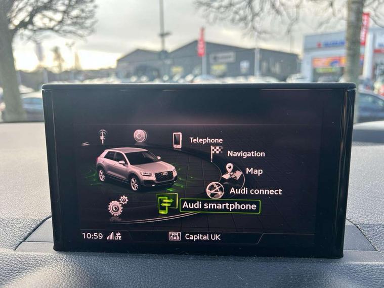 Audi drive select, Audi smartphone interface, Automatic start/stop system with recuperation, Bluetooth interface includes bluetooth audio streaming, Cruise control, MMI - Multi Media Interface control system, MMI SD card integrated nav with 3D map display, dynamic route guidance with TMC, MMI search, natural voice recognition and myAudi special destinations, Power operated tailgate, Progressive steering, Service interval indicator, Dynamic suspension, 2 x SDXC card reader, Audi music interface - apple iPod, apple iPhone, USB storage media, compatible MP3 players, 2 x USB charging points and 1 x Aux-in, CD Drive, DAB digital radio and AM/FM radio, MMI radio plus with 7" colour MMI screen and MMI controller, Air inlet in manhattan grey metallic, Black window trims, Body colour door mirrors, Chrome exhaust tailpipe, Electrically adjustable and heated door mirrors with integrated LED side indicators, Front and rear electric windows, Front underbody guard and rear diffuser trim in selenite silver, Front windscreen with grey tinted sunband, Halogen headlights including headlight range adjustment, High gloss black radiator grille, Interior mirror, LED indicator lights, Manual folding door mirrors, Rain and light sensors, Rear wiper, Side skirts in manhattan grey, Wheel arch trims in manhattan grey, 60/40 split folding rear seat bench, Door sill trims with aluminium inlay, Electronically operated child locks, Front centre armrest, Front headrests, Front sports seats, Front/rear floor mats, Height/reach adjust steering wheel, ISOFIX child seat mounting for front passenger with airbag deactivation and outer rear seat including top tether attachment point for outer rear seats, Manual seat adjustment including seat height adjustment for front seats, Storage compartments - Glovebox, cupholder compartment in centre console, storage compartment in rear centre console, front and rear door pockets, Three rear headrests, Titanium grey cloth headlining, Non smoking pack - Q2, 3x3 point rear seatbelts, 6 airbags - Front, curtain and front side airbags, Electromechanical parking brake, Electronic stabilisation control including ABS, ASR and EDL, Extended and proactive pedestrian protection, Hill hold assist, Multi collision brake assist, Pre-sense front with pedestrian recognition, Seatbelt monitoring, Tyre pressure warning light, Warning triangle and first aid kit, Anti theft alarm, Anti theft wheel bolts, Central locking system with remote control key, Aluminium interior element,