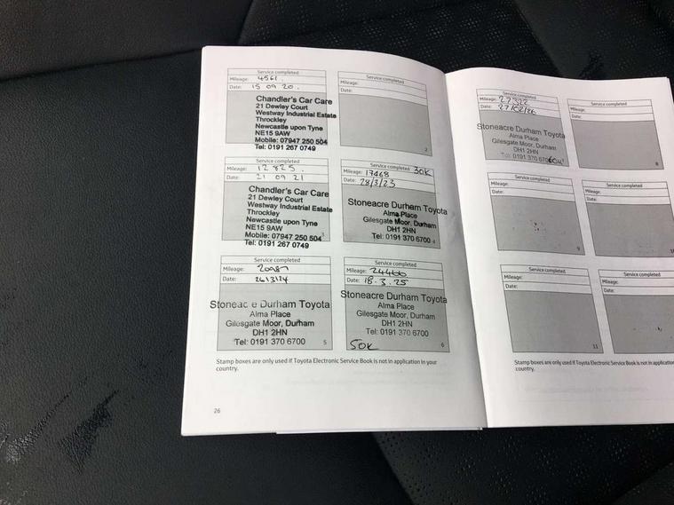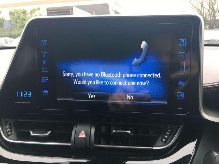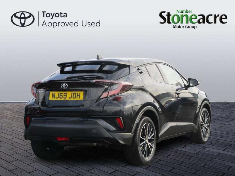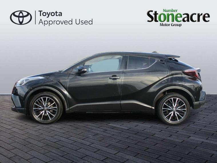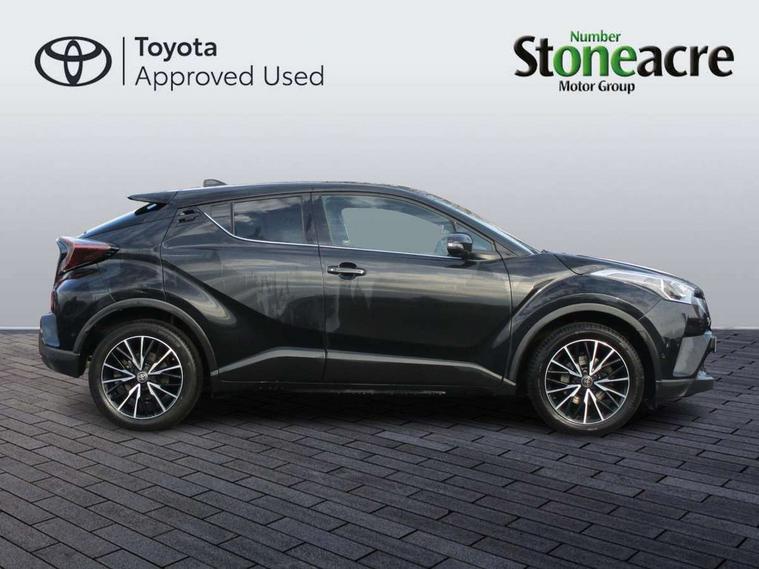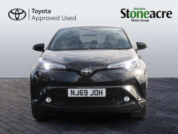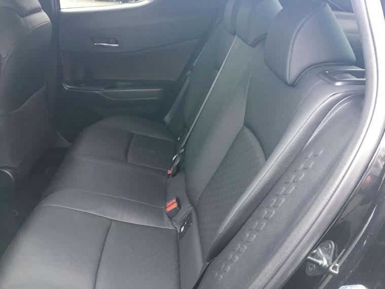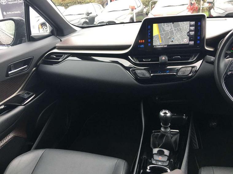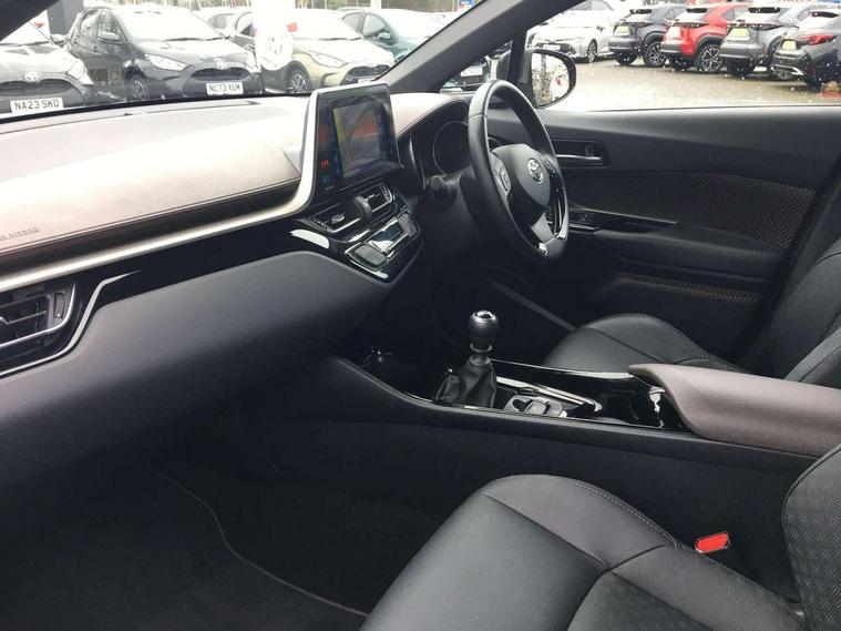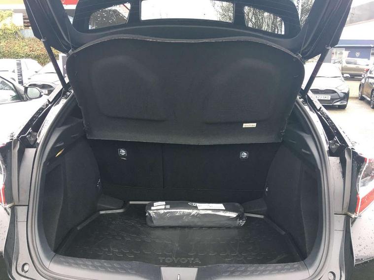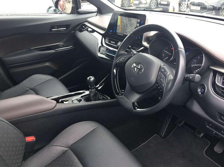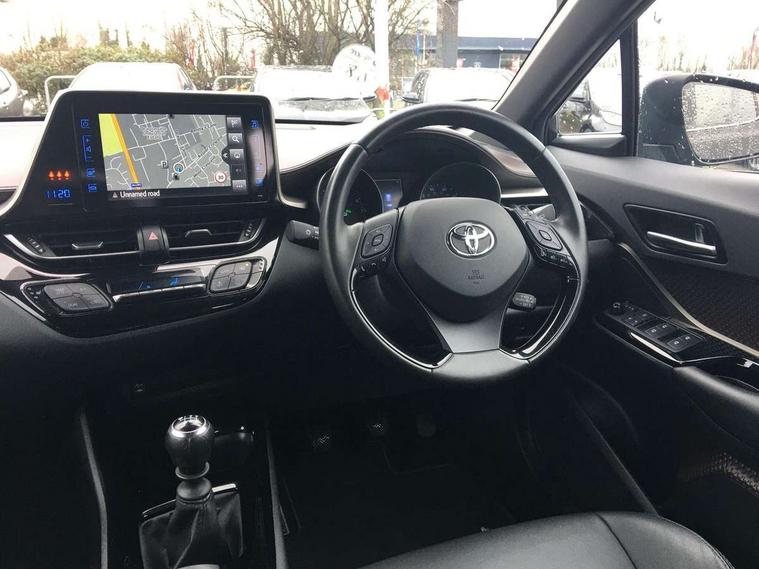 Parking pack - C-HR, Tyre repair kit, Immobiliser, Intrusion alarm, Motion sensor alarm, Remote central locking, Smart entry + Smart start, 6 speakers, DAB Radio (Digital Audio Broadcasting), Steering wheel mounted controls, USB and Aux in connectors + 12V front outlet, Wi-fi connectivity, 3x3 point rear seatbelts, ABS+EBD+Brake assist, Electronic parking brake, ESP + traction control, Front and rear seatbelt reminder, Front passenger airbag on/off switch, Hill start assist control (HAC), Pre collision system with pedestrian detection, Rear child proof door locks, Road sign information display, Supplemental restraint system (SRS) airbags - 7 airbags including driver, front passenger, curtain, side and knee airbags, Toyota safety sense, Tyre pressure monitoring system, Auto high beam, Automatic headlight levelling, Automatic headlights, Automatic retractable door mirrors, Body colour door handles, Body colour door mirrors, Body coloured bumpers, Boot door release with push button, Door mirror puddle lights, Electric folding/heated door mirrors with integrated indicators, Electrochromatic rear view mirror, Follow me home headlights, Front and rear electric windows, Front fog lights, Hard tonneau cover, Heated rear windscreen, Intermittent wipe, LED daytime running lights, LED High mounted stop lamp, LED rear brake lights, LED rear lights, Projector and reflector halogen headlights, Rain sensitive windscreen wipers, Rear privacy glass, Rear spoiler, Rear wiper, Shark fin antenna, Trailer Sway Control, 12V Accessory socket, 3 spoke leather steering wheel with multimedia switches, Ambient lighting, Chrome interior door handles, Clean air filter, Driver + front passenger electric lumbar support, Driver and front passenger personal light, Driver and front passenger Whiplash Injury Lessening seats, Driver and passenger seatback pockets, Driver/passenger sunvisors and illuminated vanity mirrors, Dual zone automatic air conditioning, Folding rear seats, Front and rear door pockets, Front console box and front cupholders, Front cupholders x 2, Front head restraints, Gear shift indicator, Glovebox with internal light, Heated driver and front passenger seats, Humidifying Nanoe air purifier, Illuminated door sills, Illuminated entry system, Isofix seat fixing, Leather effect padded armrest on front console box, Leather gearshift, Leather upholstery, Light blue ambient lighting on front doors, Pollen filter, Rear headrests, Tilt/telescopic steering column, 7" Coloured TFT multi informational display, 8" touch screen, Adaptive cruise control, Adjustable speed limiter, Bluetooth connectivity, Electric power steering, Intelligent parking assist with front & rear parking sensors, Lane change assist and blind spot monitor, Lane departure alert with steering control, Lights on warning, Push button starter, Rear cross traffic alert, Reversing camera, Reversing camera display in audio screen, Road sign assist - RSA, Touch 2 Go navigation system, Trip computer, Voice recognition, Vehicle Stability Control (VSC),