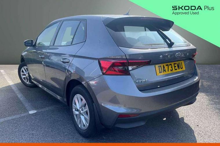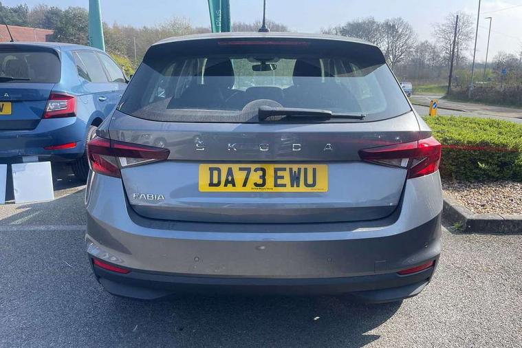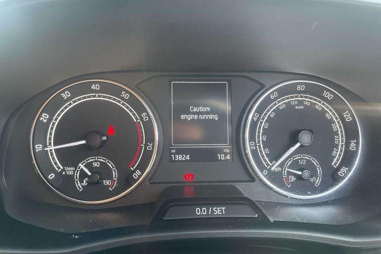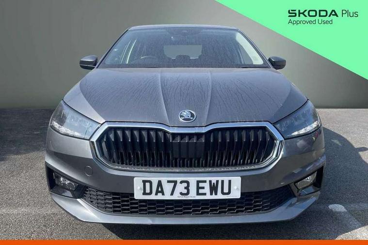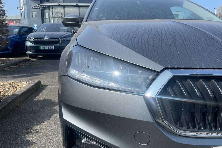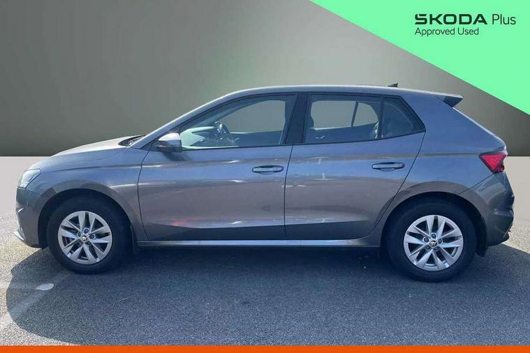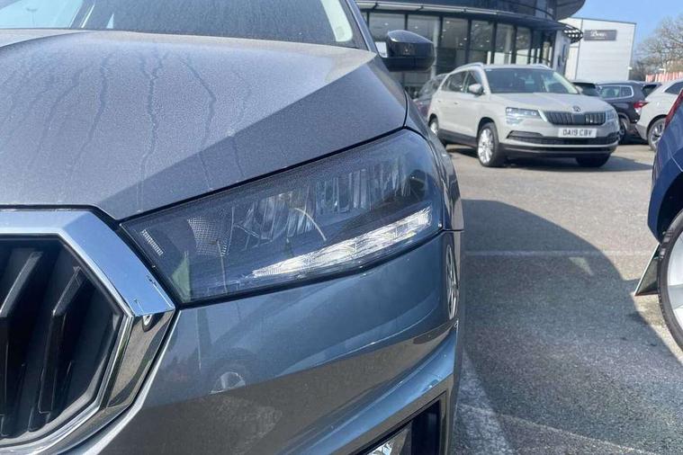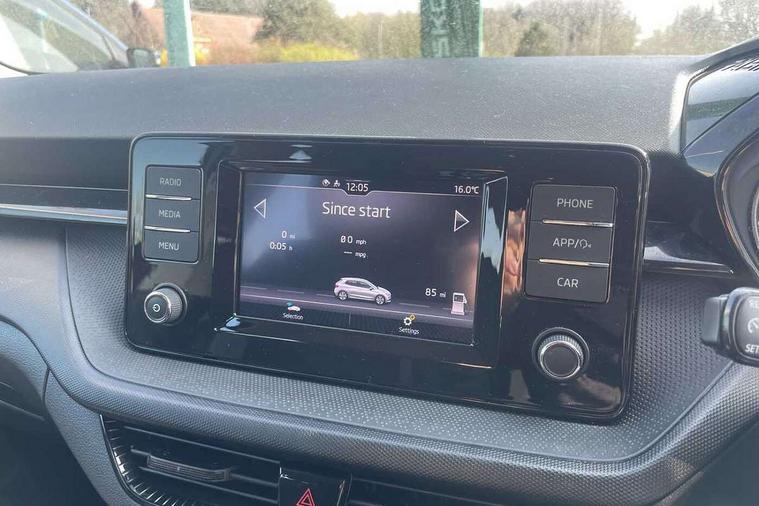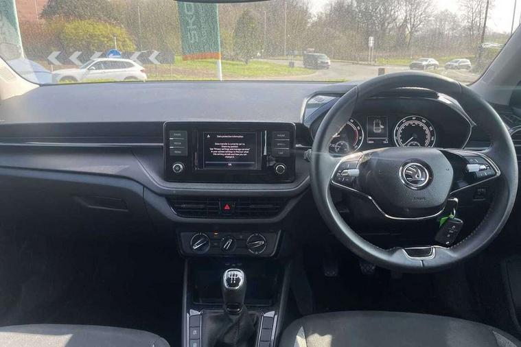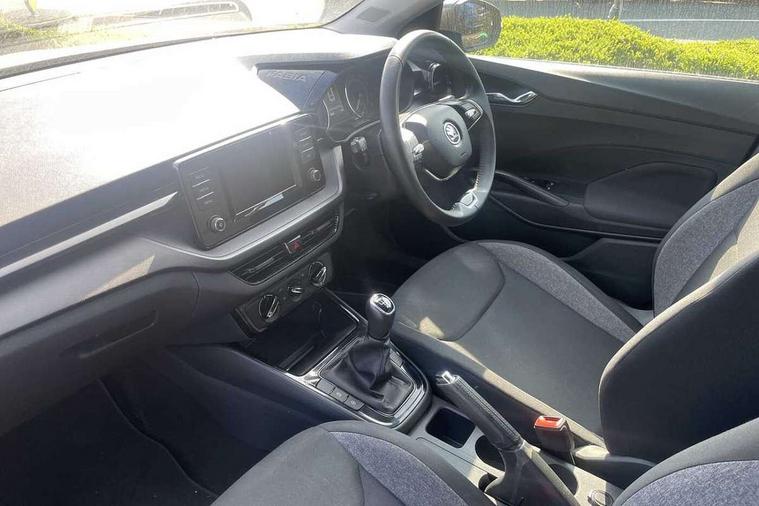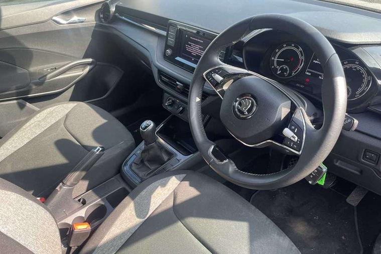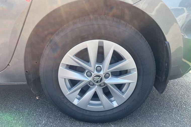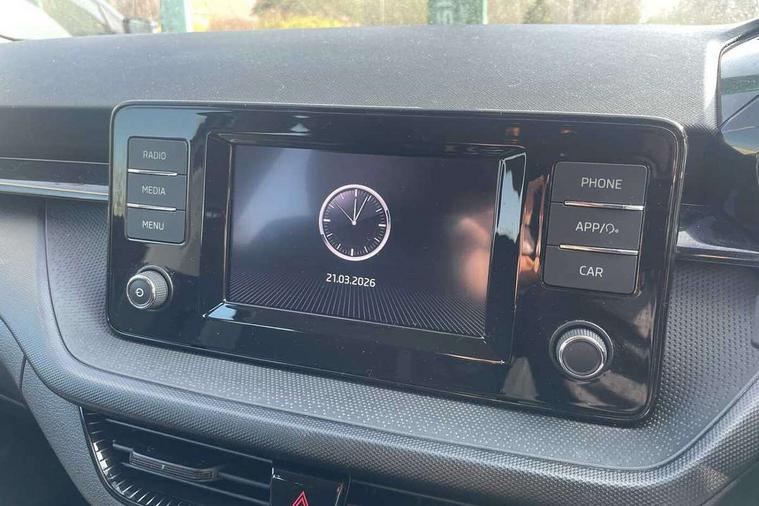 Bluetooth connection, Driver alert system - DAS, Electromechanical power steering, Exterior temperature gauge, Lane assist including road edge detection, Multifunction trip computer in black and white, Service interval indicator, Speed limiter, 2x USB-C in the front (for data transmission and charging), 4 speakers in front, Auxiliary socket for external MP3 player, DAB digital radio reception, Radio Swing with 6.5" colour display, Basic LED Headlights, Body colour door mirrors, Body coloured bumpers, Dimming rear view mirror with black frame, Door mirror integrated indicators, Electrically adjustable and heated door mirrors, Electrically adjustable front windows with function auto up/down, Front fog lights, Front window wiper intermittent control, Headlight range control - Automatic, Ice scraper in fuel cap, LED daytime running lights with coming and leaving home feature, Mechanical adjustable rear windows, Rain sensor, Rear LED fog light, Rear side wing doors, Rear window wiper with washing nozzles, Roof mounted spoiler, SKODA tailgate lettering in chrome, Third brake light, 2 reading lights in front and 2 reading lights in rear, 2 spoke leather multifunction steering wheel, 3 rear headrests, Backrest split and folding, Central console with fixed cup holder and storage box, Chrome handbrake release button, Fabric upholstery, Gearshift knob/handle in leather, Grain satin black interior door handles, Hand brake lever handle in leather, Height adjustable front headrests, Height adjustable front seats, Height adjustable steering wheel, ISOFIX and TopTether anchorage points to the outer rear seats, ISOFIX and TopTether on the front passenger seat, Luggage compartment lighting, Manual air conditioning, Manually adjustable lumbar support in front seats, Pollen filter, Rear seat bench unsplit, Single front passenger seat, Storm grey headlining, Sun visors with mirror and airbag label on passenger side, Ticket holder, 3-point height adjustable front seats belts with pretensioner and force limiter, Automatic warning lights in case of crash, Driver and passengers airbag with switch off function, e-Call+, ESC including ABS, MSR, ASR, EDS, HBA and XDS, Front and rear seat belt warning, FRONT ASSIST (AEB City and AEB Inter Urban), Front side airbags, Head airbags, One tone horn, Pedestrian protection, Three rear 3-points safety seat belts with pretensioner and force limiter including stop function for outer rear seat belts, Tyre pressure monitoring system, Anti-theft alarm system including immobiliser, interior monitoring, backup horn, and towing protection, Central locking with radio remote control, interior controls, SAFE function and 2 foldable keys, Black painted air vents, Glossy black decorative trim, Grain satin black central console cover, Grain satin black lower decorative trim, Satin black door and side trim panel in front, Anti-theft wheel bolts protection, Super-low rolling resistance tyres,