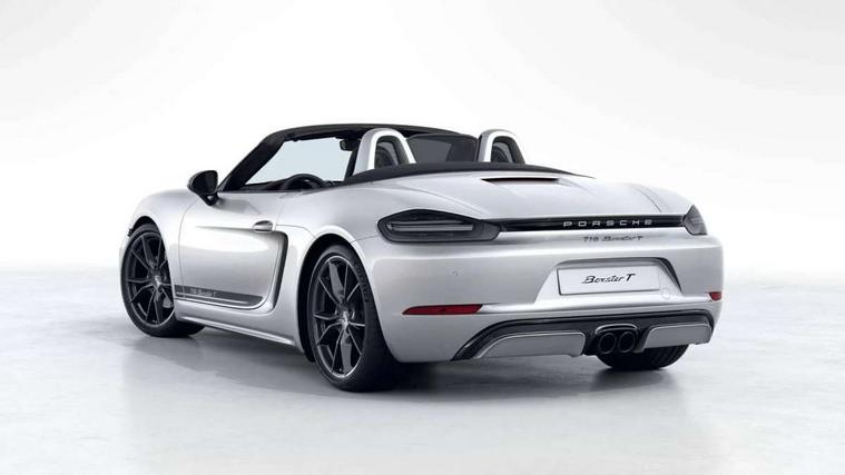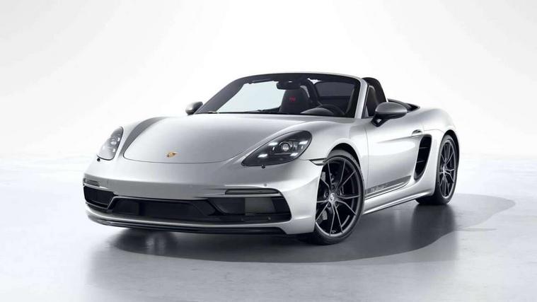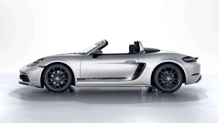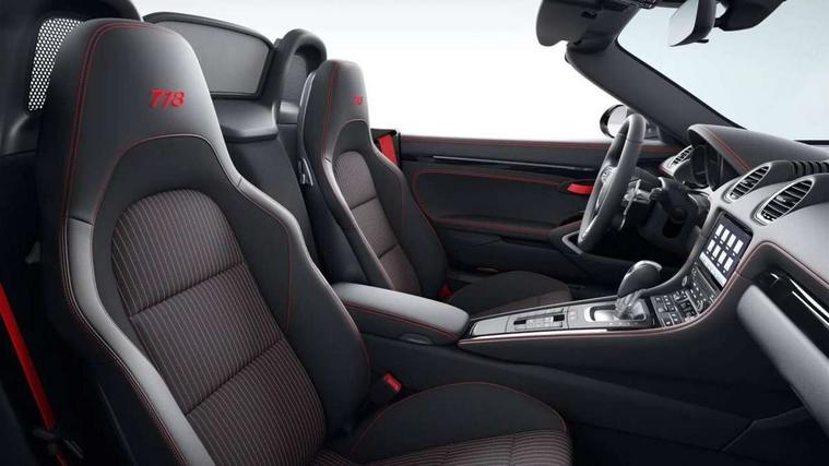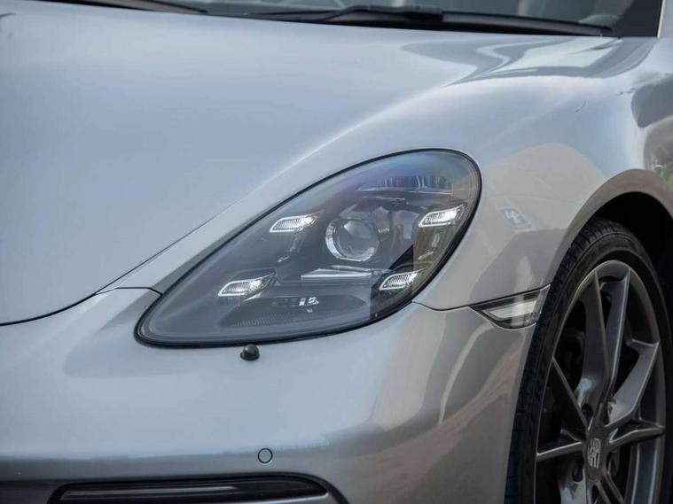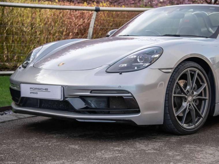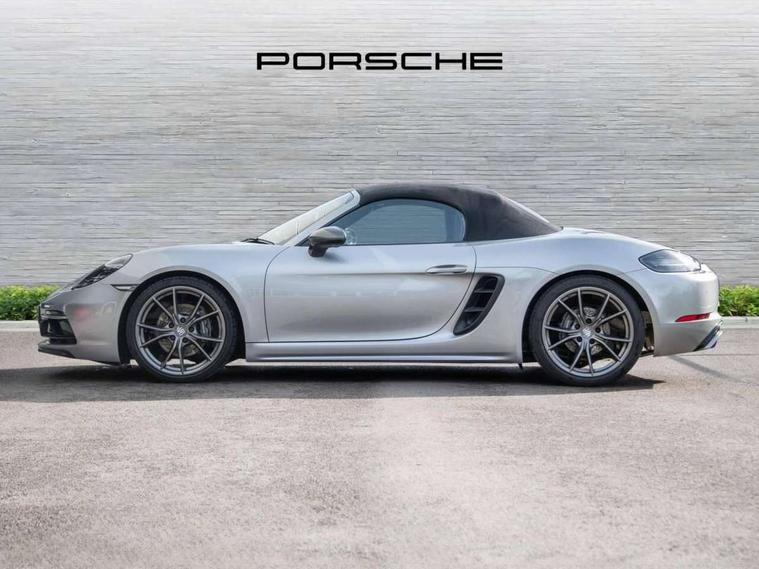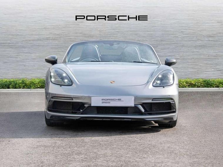 On board computer, Gasoline particulate filter, Porsche Active Suspension Management (PASM), Porsche Stability Management (PSM), ABS with extended brake functions, Porsche TORQUE Vectoring (PTV) with mechanical rear differential lock, Sports suspension, Turbocharger with intercooler, VarioCam Plus variable valve timing and switchable valve lift, 718 Boxster T stripes in agate grey, Automatic headlight activation including welcome home lighting, Automatically extending rear spoiler, Body colour bumpers, Body colour door handles, Electrically adjustable heated exterior mirrors on door waist rails, aspherical on driver's side, Fully automatic fabric hood, electrically operated/heatable rigid glass rear screen, operable approx 30 mph and convenient operation by key remote, Green tinted heat insulating glass, Heated rear windscreen, Intelligent lightweight body in Aluminium/Steel composite construction, Porsche logo on trim strip and model designation on rear apron in high gloss silver colour, Power windows with one touch operation and door seal protection, Separate auxiliary lights in the front end with LED indicators and position lights, Top tinted windscreen, Twin tract sports exhaust system with black central twin tailpipe in stainless steel, Windscreen washer system with two wiper speeds and washer jets, 12V sockets in passenger footwell and centre console storage compartment, Adjustable fan with air recirculation and defroster functions, Clothes hooks on front seat backrests, Elevated centre console with uncovered storage compartment and closed storage compartment, Front and rear luggage compartments, Gloss black interior door handles, Height/reach adjust steering wheel, Hood lining in black fabric, LED reading lights, orientation, ignition lock, additionally luggage compartment and glove compartment lighting, Storage compartments in each doors, Three way catalytic converter and on board diagnostics for monitoring emission control system, Two individual cup holders (integral to dashboard trim strip), 3 point automatic seatbelts, ASR, Driver and passenger airbags, Front and rear 4 piston aluminium monobloc fixed calipers, disc internally vented and cross drilled, front/rear disc diameter, brake calipers in black, Front seatbelt pretensioners + load limiters, Porsche side impact protection doors with thorax airbag in outer backrest side bolster and head airbag for driver/passenger in door panel, Tyre pressure monitoring system, Alarm system with interior surveillance, Engine immobiliser with in key transponder, central locking and remote control, High gloss black interior trim, Tyre sealing compound and electric air compressor kit,
